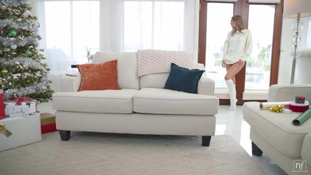 What Millie Morgan wants for Christmas isn't going to come in a box. She sits near the Christmas tree realizing how wet and horny she is. Finally, she sends her boyfriend Lucky Fate a video message talking about how much she wants him to come home. When Lucky arrives, they exchange gifts. Millie lets Lucky know that they're going to Hawaii for New Years. Lucky gives Millie a bracelet and explains why each of the charms is special. That gives Millie the perfect idea for one last gift.Dressed in just a thong, Millie wraps herself up and kneels beneath the tree. Lucky comes out of the bedroom soon enough and finds his hot gift waiting for him with a do me smile. There's no hesitation as Millie opens wide to blow Lucky's morning wood for a very good start to Christmas.Once Lucky has unwrapped Millie, he settles her on the couch and goes to work between her thighs. Using his fingers and tongue, Lucky soon makes Millie's back arch in delight. When Millie falls to her side, Lucky is there to plant himself between her thighs and dive nice and deep into her twat.Now that they've come together, they're insatiable. Millie puts Lucky on his butt on the couch and sucks her own juices off him. Then, straddling his hips, she takes him back inside. Rocking back and forth, she delivers a nice stiffie ride. After another quick dick suck, she turns around for reverse cowgirl. Getting to her feet, Millie takes Lucky back inside as he comes in from behind. She leans forward on the couch to improve the angle of penetration. Finally sated, Millie disengages from the D and drops to her feet to give one last BJ until her boyfriend pops into her mouth for a delightful Christmas breakfast.