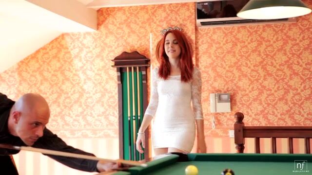 Total hottie Amarna Miller is dressed to the nines in a tight white dress and high heels, all for the sake of seducing Figo. She interrupts his pool game with a request that he show her how to play, but it's really just a ploy to get Figo's attention so that he'll enjoy everything she has to offer.Searing kisses quickly turn to more as Amarna allows herself to be pushed backwards onto the pool table so that Figo can have easy access to her panty-clad pussy. He pulls her underwear aside to sample Amarna's pussy juices, and once he decides he likes what he tastes he takes them off entirely for better access.Amarna isn't about to let her lover go unsatisfied, so after enjoying Figo's attentions for a while she gets down on her knees and helps him out of his pants. Once Figo's cock is freed, Amarna eagerly takes it in her mouth and starts sucking until she is deep throating his dick, using her hands and lips with expertise to elicit moans of pleasure her man.Finally Figo gets the chance to push deep into Amarna's creamy twat when she stands up and bends over the table to present her landing strip pussy for his pleasure. Within moments Figo is pounding away, enjoying Amarna's tight fuck hole. They keep up like that until Amarna is groaning her pleasure at the orgasmic ecstasy sweeping through her.When it's time to change things up, Amarna leans back against the wall for some standing sex that is instantly fast and furious and totally to the redhead's liking. As her body quakes with another climax, Amarna turns around so that Figo can once again take her from behind with strokes hard enough to make her small boobs bounce.The couple finishes their frantic lovemaking with Amarna back on the pool table. Her legs are spread as wide as they'll go while Figo delivers a rough pussy pounding in Amarna's landing strip twat that sends her screaming to pleasure town one final time. The last orgasm does Figo in, and a second later he pulls out of Amarna's pulsing snatch and loses his load all over her fuzzy red haired mound.
