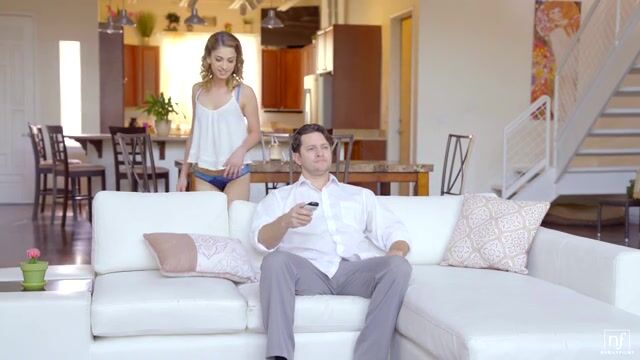 Kristen Scott sneaks up on Preston Parker and steals his remote control in a playful gesture that gets them both hot and bothered. By the time Preston catches up with Kristen, they are in the bedroom. Their mouths fuse together for passionate kisses as Preston leads Kristen to the bed and starts helping her out of her bra and sheer panties.Pulling Kristen's underwear aside, Preston dives face first into her landing strip twat. His tongue works overtime as he fondles her clit to the tune of her lusty moans. After taking a detour to suckle Kristen's tender breasts, he flips her onto her belly to continue working his tongue all over her soft snatch.Replacing his mouth with his stiffie, Preston rises onto his knees and then drives into Kristen's fuck hole from behind. Her position on her belly is wonderful for deep penetration, but when she rises to her knees changes the angle of penetration to be even hotter. Kristen can't contain her moans, nor can she stop the pulsing of her greedy puss.Whirling around so that she can take Preston's stiffie in her mouth, Kristen starts sucking with long slow slurps. She speeds up gradually, using her soft lips and tongue until she is deep throating Preston's hardon. Her BJ only stops when she gets on her back and spreads her legs so that Preston can have another go in her lusty snatch. After transitioning to a spooning position, he leaves Kristen right on the edge of cumming again.Instead of just plowing away at that glorious pussy, Preston gives Kristen the chance to dictate her own pleasure. She climbs on top of him, straddling his dick and taking him in a cowgirl ride that leaves her breathless with excitement. Falling onto her back one more time, Kristen takes Preston's dong until he is on the verge of exploding. Only then does he pull out, leaving it to Kristen to aim his cumshot all over her face and soft boobs.
