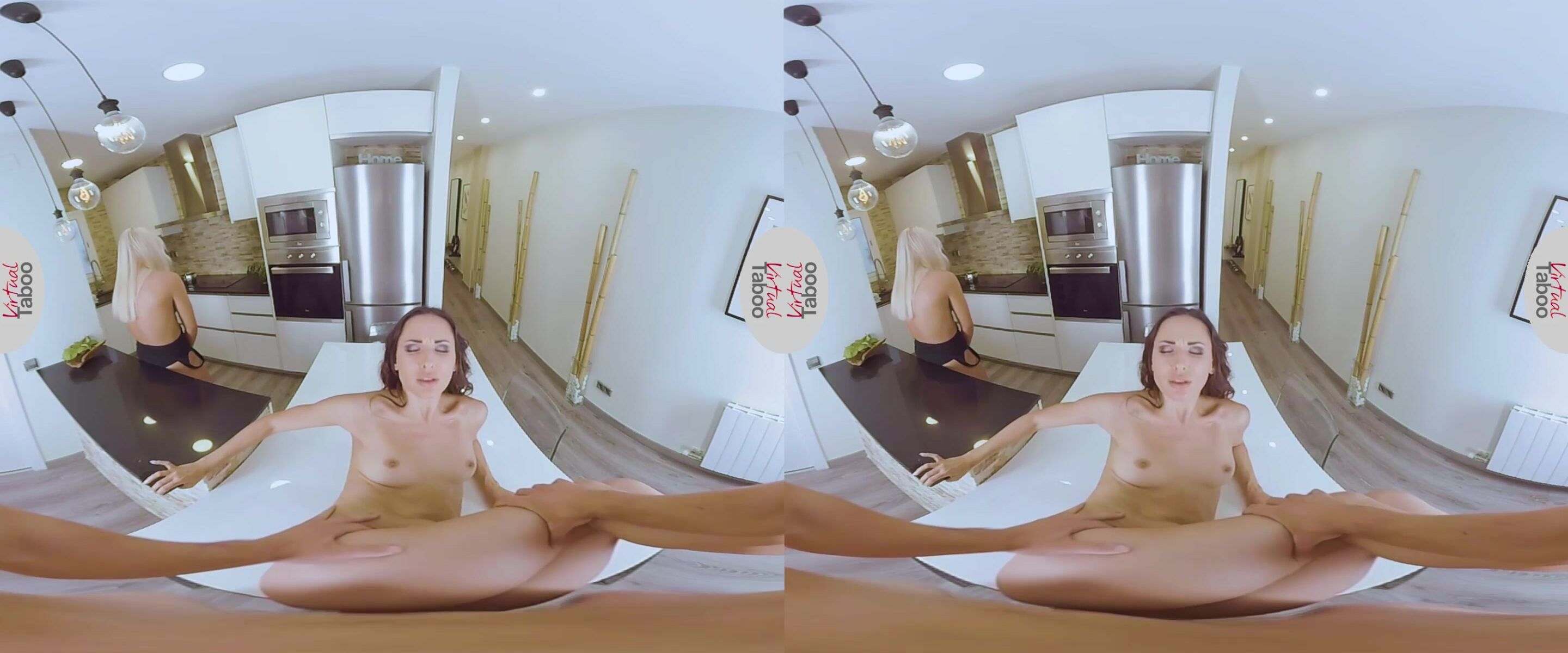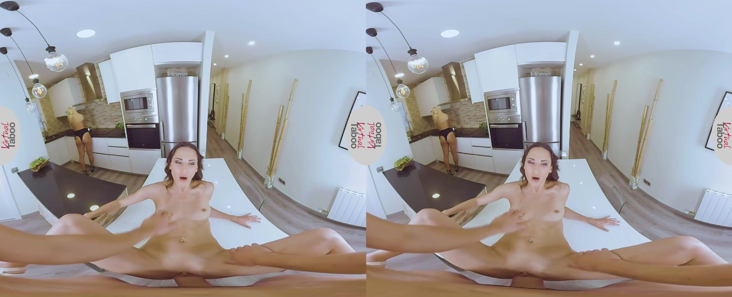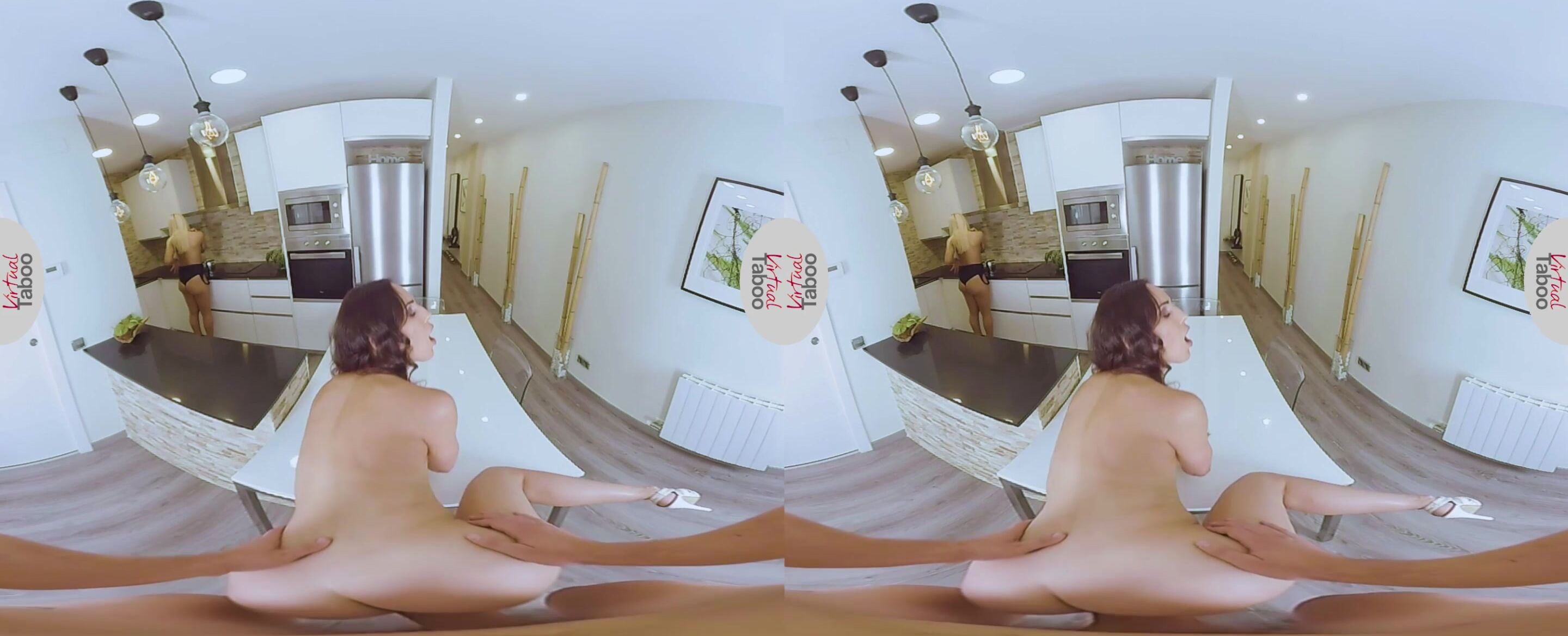 While you were discussing lunch plans with your lovely blonde stepsister Sofia, your hot brunette stepmother Lilu was lurking in the background and waiting for the right moment to pounce on your massive schlong like a veritable cougar that she is. When petite Sofia got up and started preparing the lunch, horny Lilu immediately went for your pants and got your hard pecker out in order to suck on it for a while. Getting up and leaning against the table, this mature stunner let you slam your massive dong deep inside of her moist cunt and drill her while making sure not to make Sofia notice anything. But, at the very moment your hot jizz hits your stepmom's cleanly shaved muff, Sofia finishes preparing the meal and turns around. The amazement on her face slowly turned to horror as she realized what has been going on behind her back.