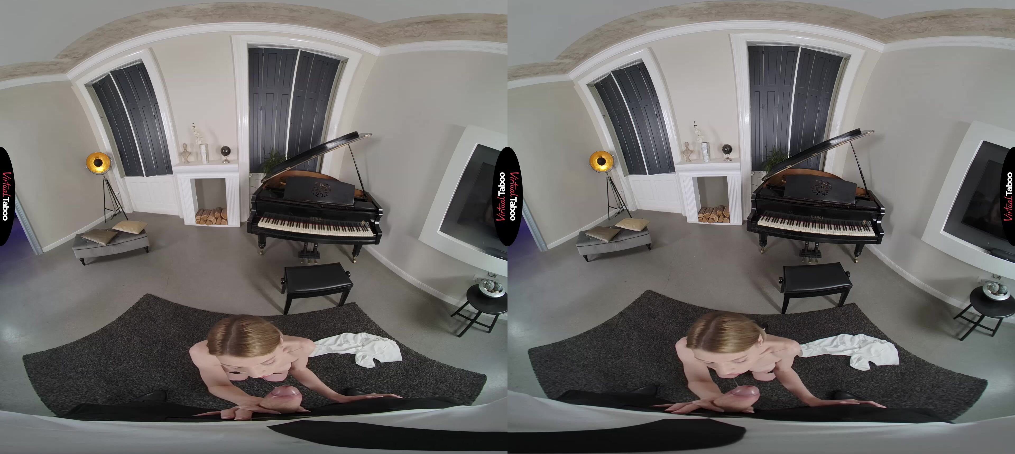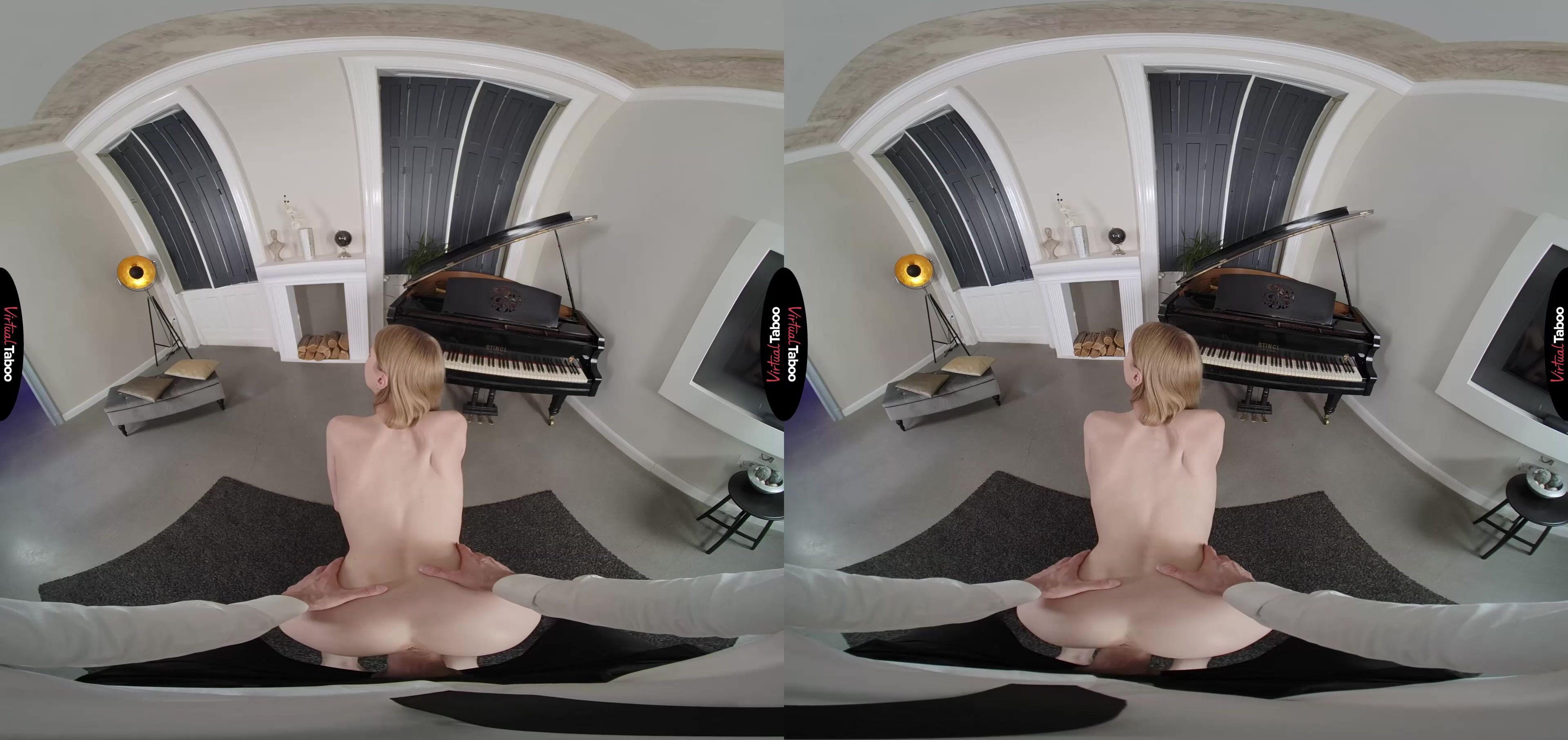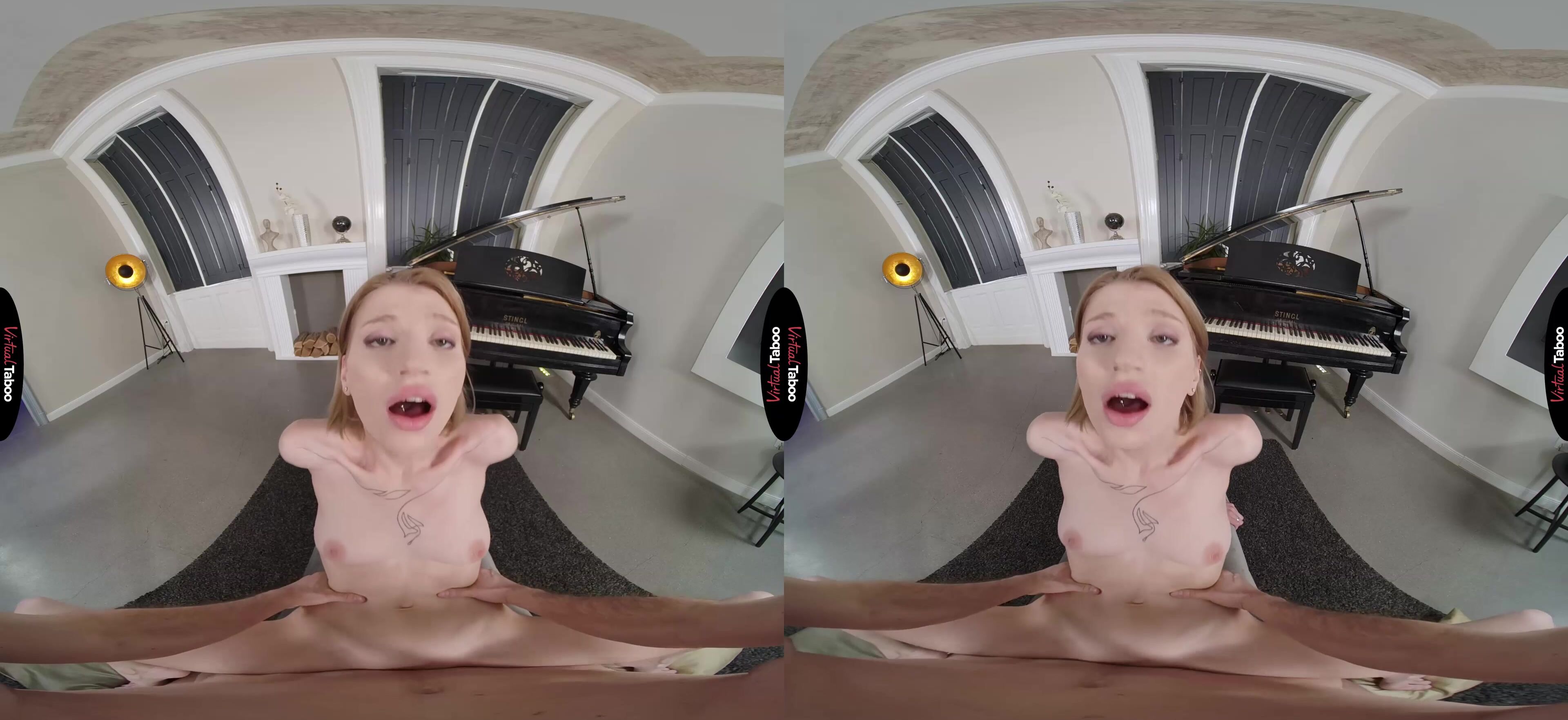 Molly Devon, the young and talented babe, always wanted to play piano. Her stepdad hired a piano teacher to teach her the finer things about music. She only had a few lessons and is embarrassed when you tell her that you want to hear her play. As she plays, Molly can feel your eyes on her, taking in every inch of her body. You do not know that Molly has been hiding a huge secret. She is in love with you since you married her mom. When you get a look at her perky breasts and hear her profess her desire to make love to you, you can’t hide the growing excitement in your pants. Molly was thrilled to see how hard your cock was and couldn’t wait to feel it inside of her. She was no virgin, but she had never seen one so big and never wanted to fuck as badly as she did at this moment. You were happy to see her on her knees ready to suck your fat meat. She still needs a few lessons, but picks up on your instructions quickly, giving you an enthusiastic head until you are ready to take her other hole. Molly bends over on the piano bench and takes you from behind. It is just like she saw in her favorite VR porn movies. You give her all the lessons you never dreamed you could, pumping her full of your throbbing prick until you are ready to explode. Proving she knows a few tricks of her own, she sucks your juices from you and then rides your pole until you can’t hold out another moment. She smiles up at you as she cums all over her face, knowing she has pleased you and hoping to repeat this VR porn taboo lesson in the future.