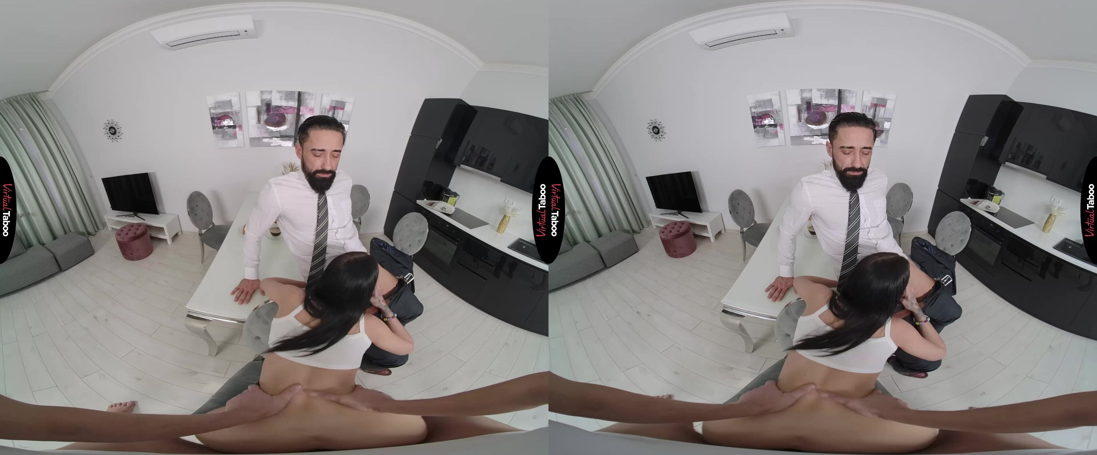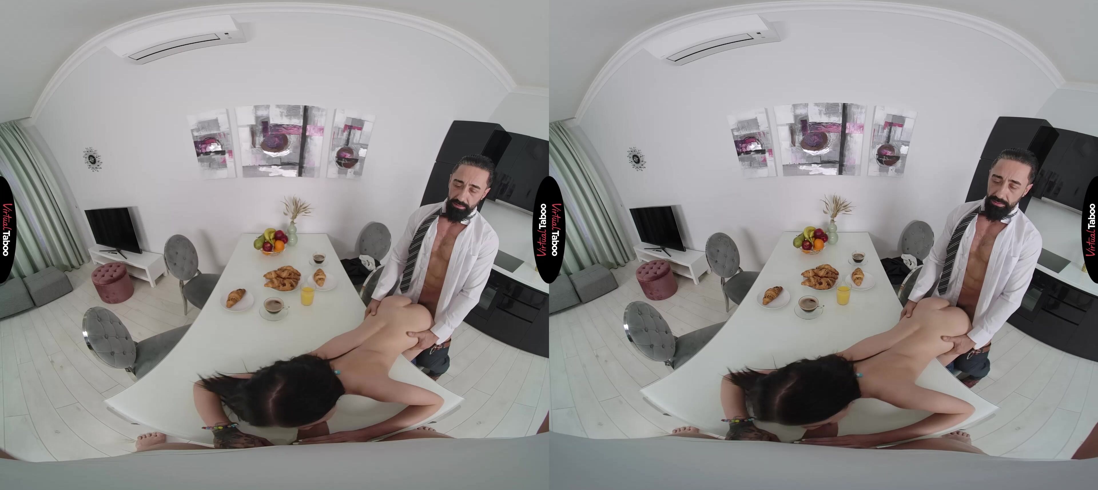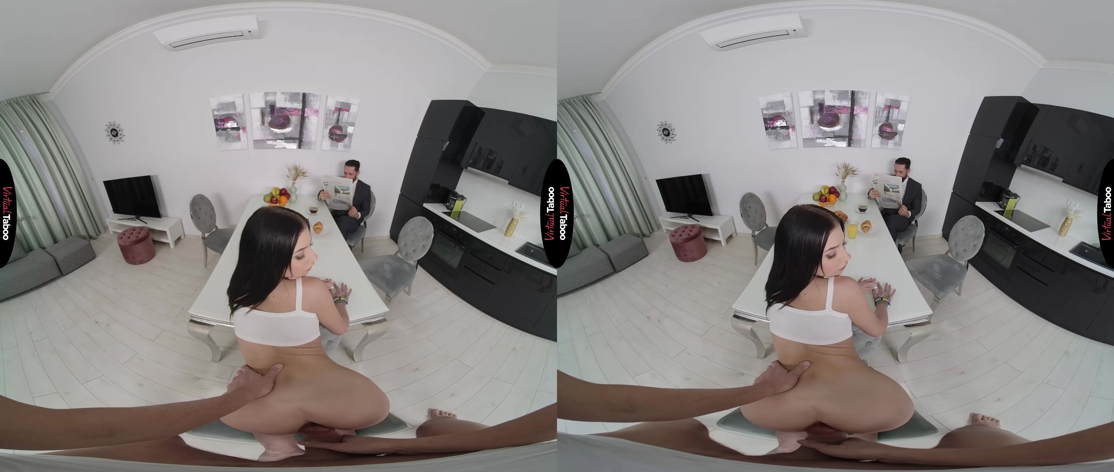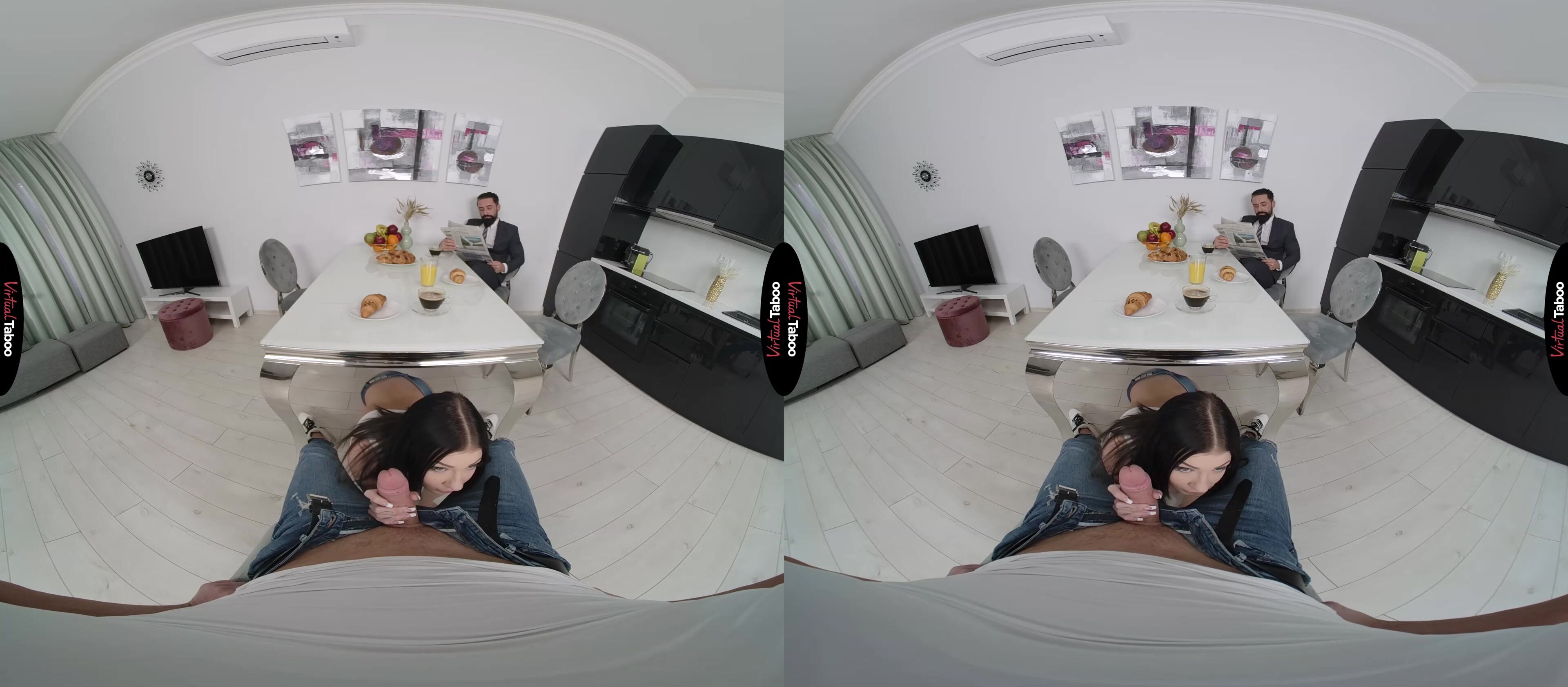 It is breakfast time in the house and Chloe Heart’s mom is away for the weekend. Alone with her stepfather and stepbrother, she has some wicked plans to make the most of the time. When they wake up, they smell something delicious coming from the kitchen. After serving her stepfather and handing him a daily paper, Chloe starts teasing you, flashing her tiny tits and wiggling her adorable ass. You can’t believe how bold she is as she acts like a professional VR porn model. You don't stop Chloe when she crawls under the table and takes out your cock. You love the way her mouth feels but is worried about getting caught. She is hoping her stepfather will notice and makes more noise as she gags on your big rod. You can’t take it any longer and have to have her on the table. Chloe's stepfather is shocked to see you bang her over breakfast, but rather than be upset, he wants to join in. That is exactly what Chloe wanted and she happily sucks your rod while getting daddy dicked from behind. The intense double stuffing from her mom’s husband and you is even better than she fantasized about while watching taboo VR porn movies. It is so kinky she can barely contain herself. You take turns pounding her holes and Chloe loves every thrust. She makes her stepfather tell her that her pussy is tighter than her mother’s and makes you tell her that she is a better slut than your girlfriend. That kind of filthy talk makes you both shoot big loads, one on her face and one on her pussy. Family breakfasts are going to be a new and filthy tradition.