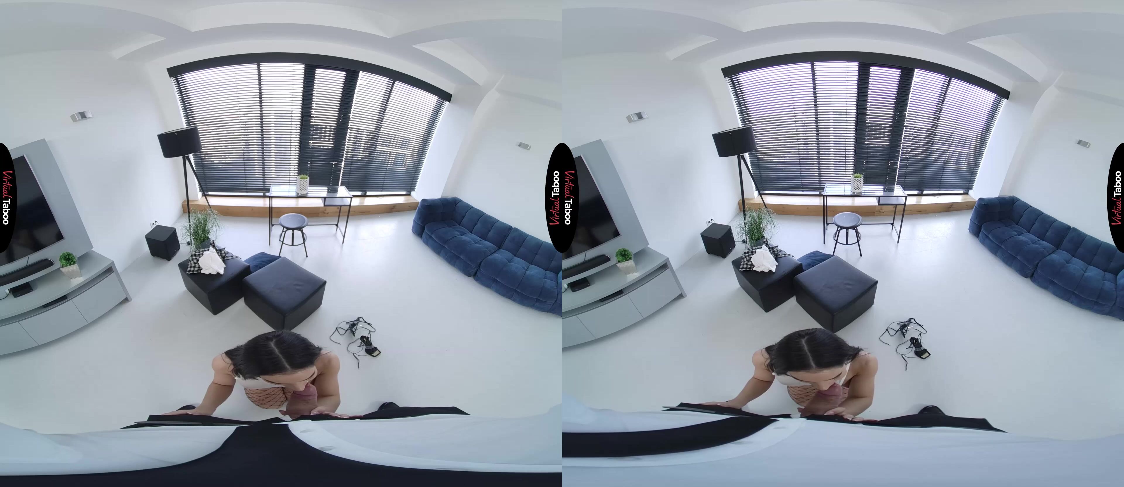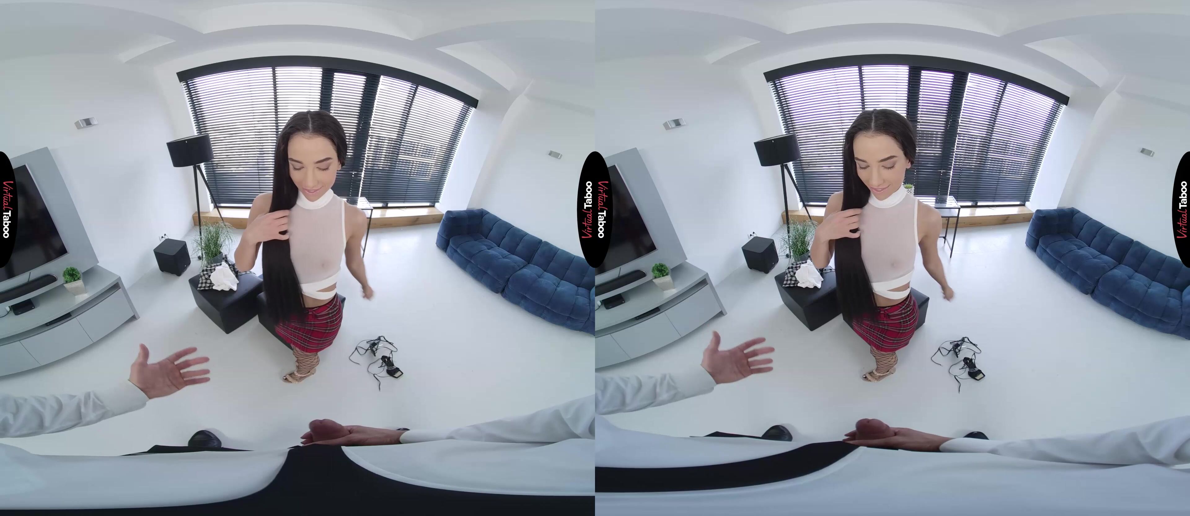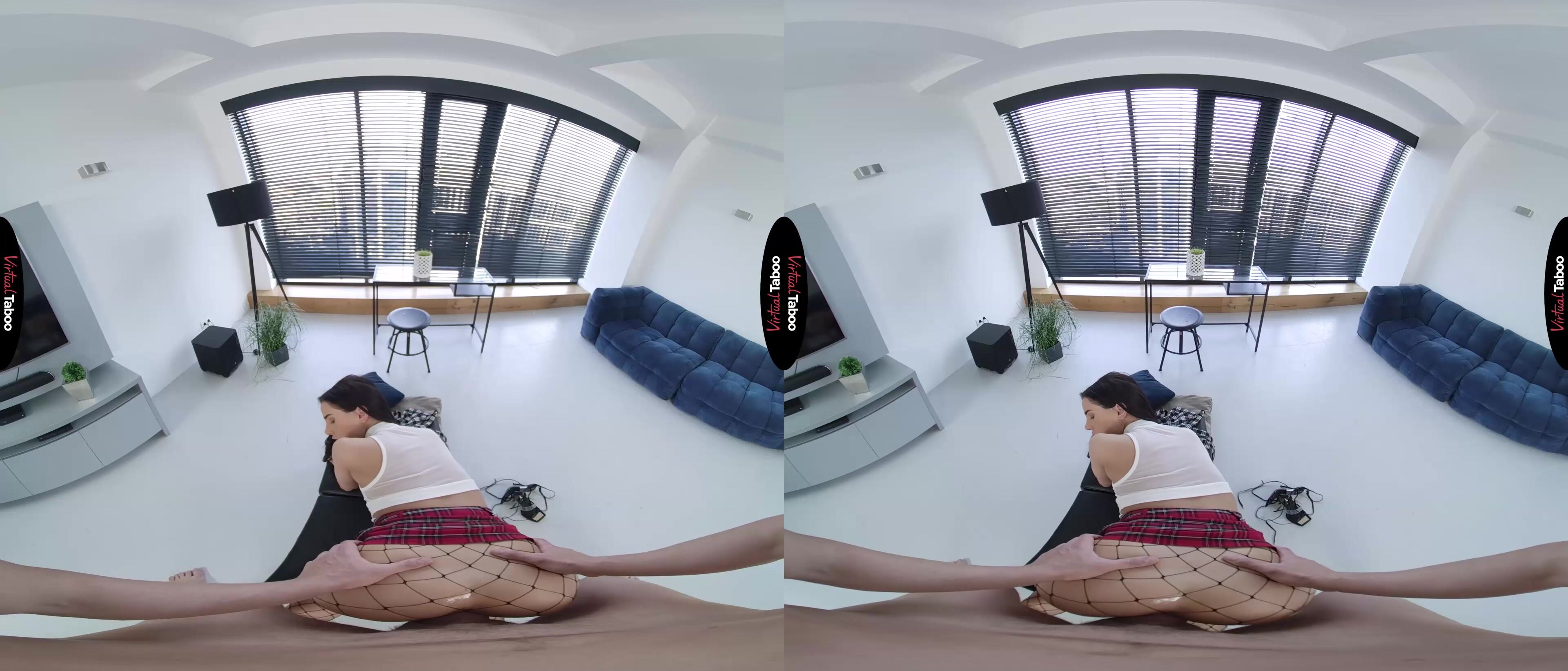 Kama Oxi and her friends are upset. The new college board has ordered that all students on campus must wear uniforms. Making matters worse for the popular coed is the fact that the deciding vote came from her own stepbrother. She wants to show you how boring the uniforms are and to confront you about the decision. Angry and determined to make you see the error of her ways she shows you how boring the uniforms are. You don’t seem to get it until she slips out of the old outfit and into one that is far sexier. The short skirt, fishnets, and see-through top get your attention immediately. Wouldn’t something like this be better on campus? Or at least more fun? You resist, but Kama has seen this look in men’s eyes before. She knows she has you right where she wants you and is going to take this all the way. She tells you that she has always wanted to fuck you and if you do what she asks, she will do anything you want. That convinces you and moments later, she is sucking on your hard cock like no one ever has. Kama is happy to prove that she dresses like a slut from taboo VR porn movies because she is one. Her short skirt makes it easy to slide into her pussy from behind, but you aren't happy until she is completely naked and you are balls-deep in her tight hole. She can’t wait to tell her friends that she got the uniform rule overturned, but can’t stop cumming on her stepbrother’s dick to think about anything but pleasure. She is having so much VR porn fun she almost gets a pussy full of cum, but pulls you out in time to eat your load instead. This deal is going to work out for both of you.