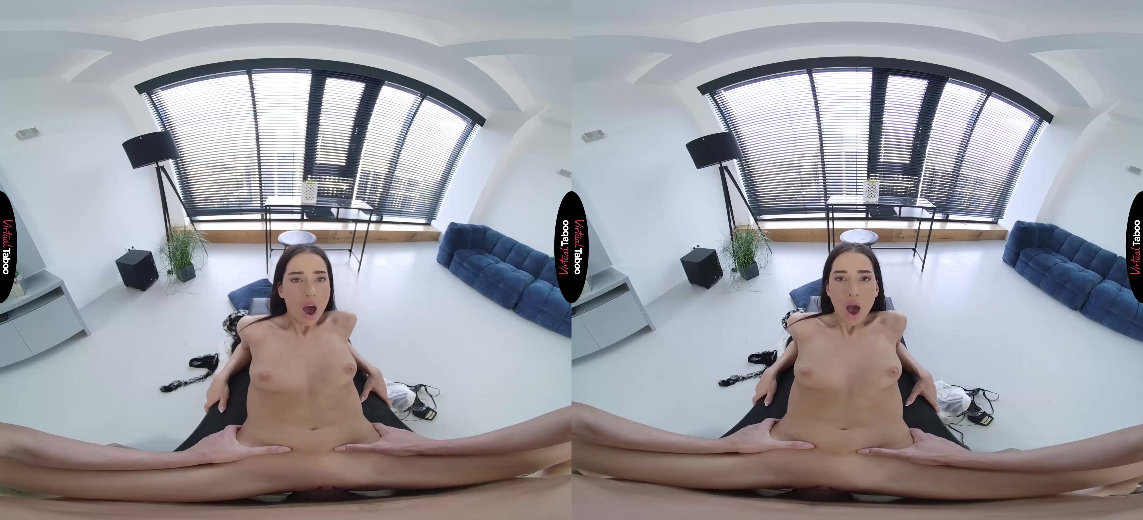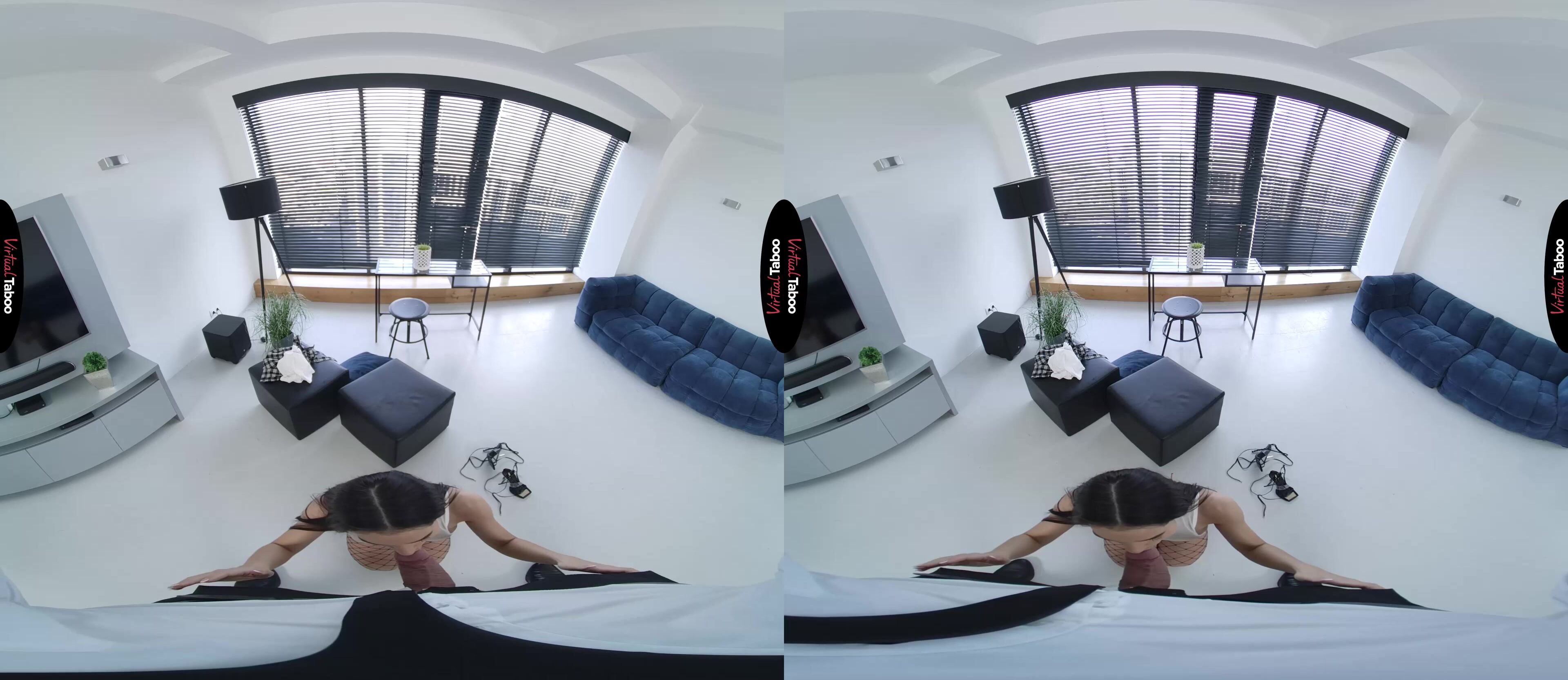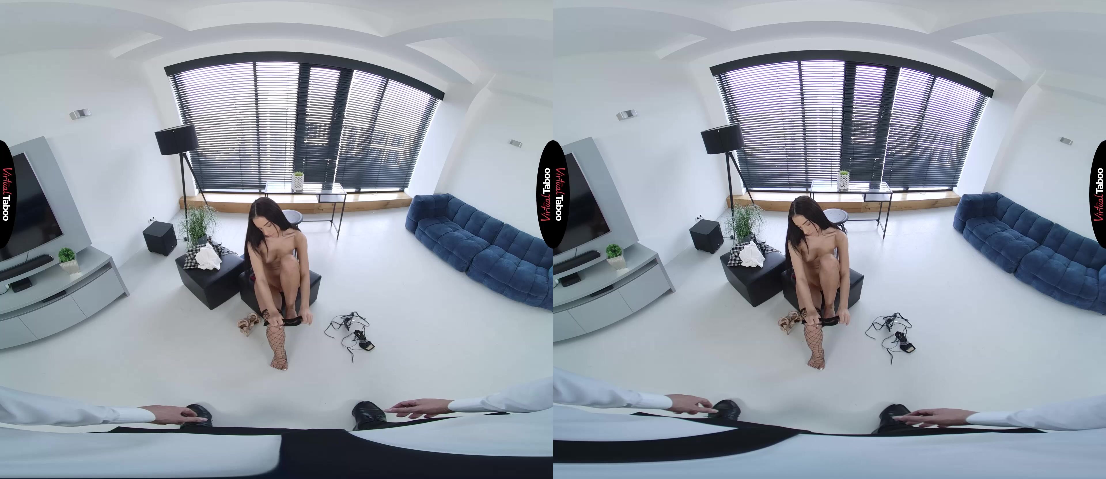 Kama Oxi and her friends are upset. The new college board has ordered that all students on campus must wear uniforms. Making matters worse for the popular coed is the fact that the deciding vote came from her own stepbrother. She wants to show you how boring the uniforms are and to confront you about the decision. Angry and determined to make you see the error of her ways she shows you how boring the uniforms are. You don’t seem to get it until she slips out of the old outfit and into one that is far sexier. The short skirt, fishnets, and see-through top get your attention immediately. Wouldn’t something like this be better on campus? Or at least more fun? You resist, but Kama has seen this look in men’s eyes before. She knows she has you right where she wants you and is going to take this all the way. She tells you that she has always wanted to fuck you and if you do what she asks, she will do anything you want. That convinces you and moments later, she is sucking on your hard cock like no one ever has. Kama is happy to prove that she dresses like a slut from taboo VR porn movies because she is one. Her short skirt makes it easy to slide into her pussy from behind, but you aren't happy until she is completely naked and you are balls-deep in her tight hole. She can’t wait to tell her friends that she got the uniform rule overturned, but can’t stop cumming on her stepbrother’s dick to think about anything but pleasure. She is having so much VR porn fun she almost gets a pussy full of cum, but pulls you out in time to eat your load instead. This deal is going to work out for both of you.