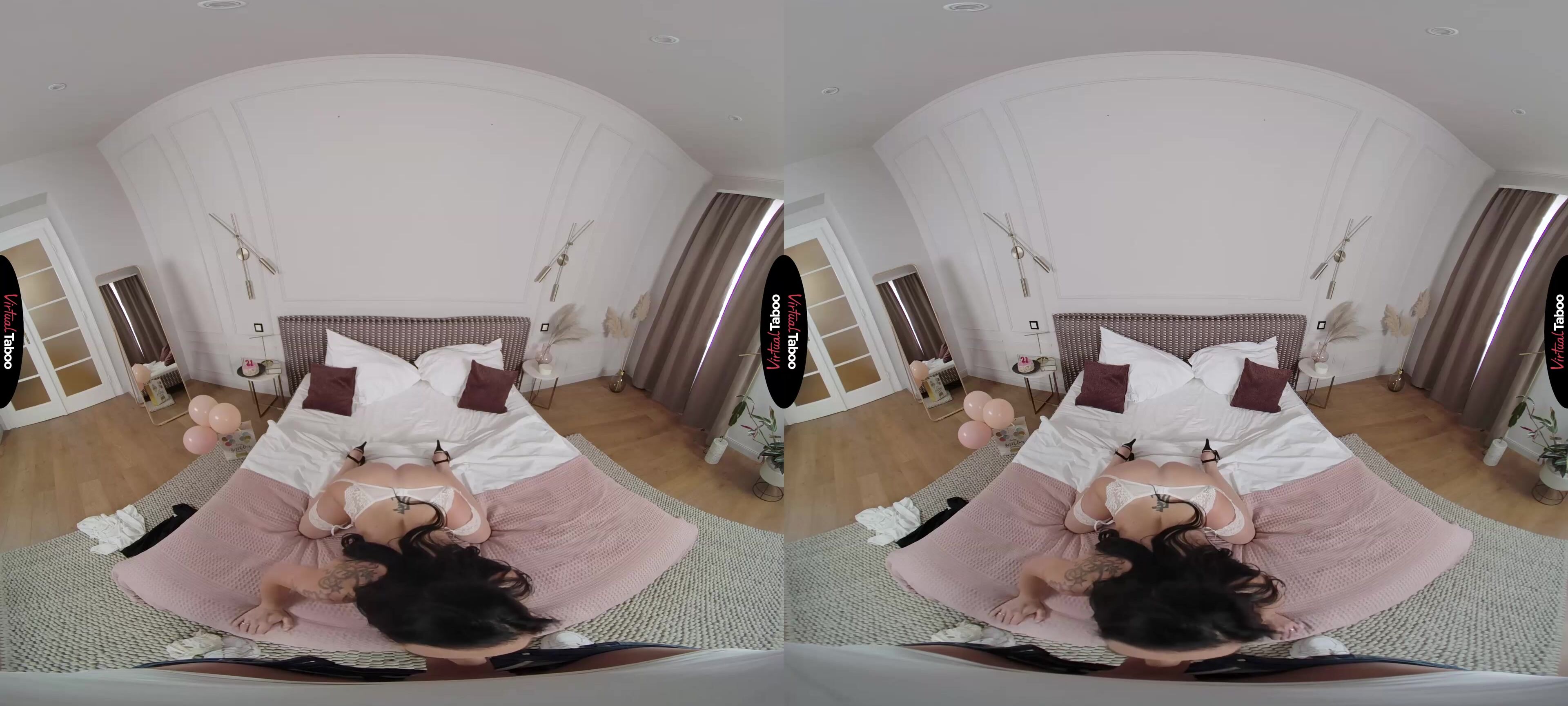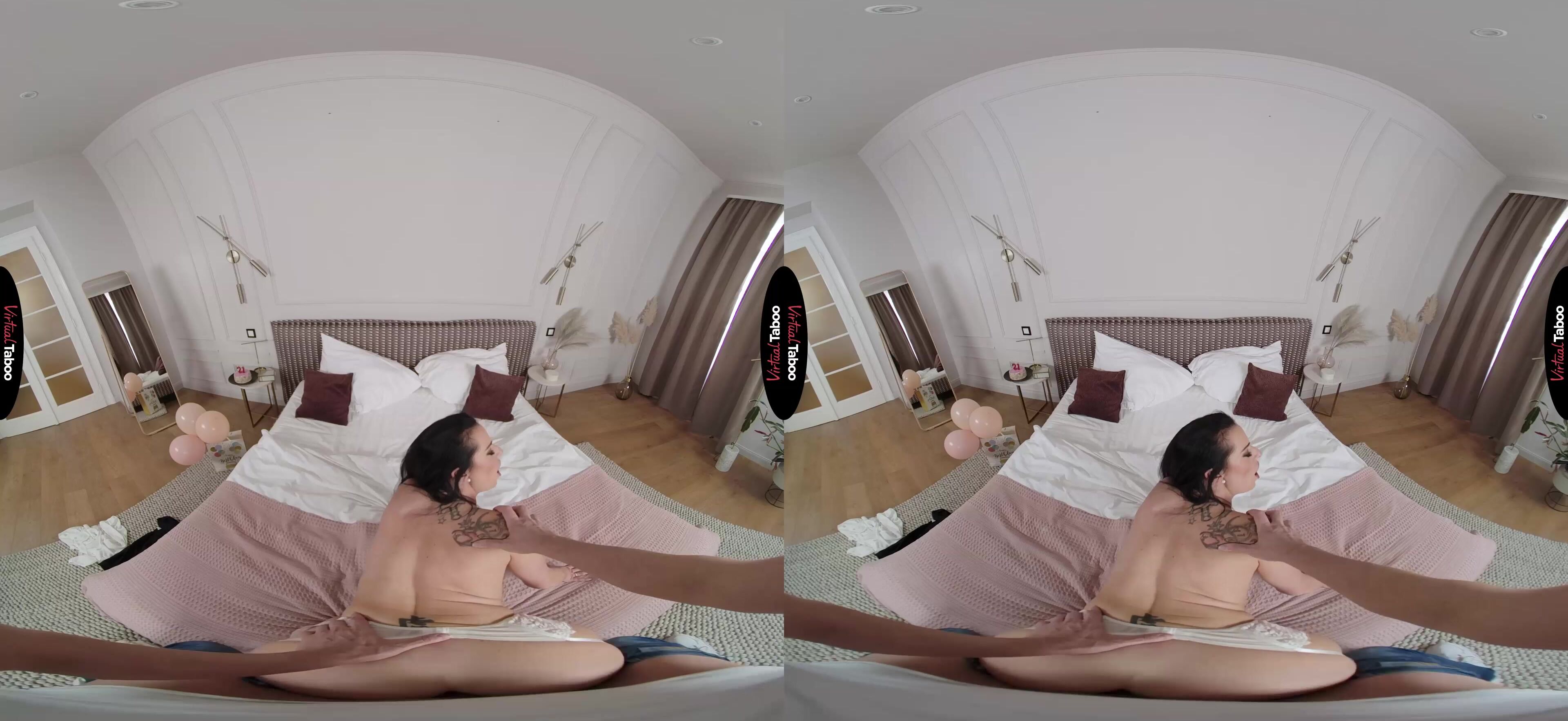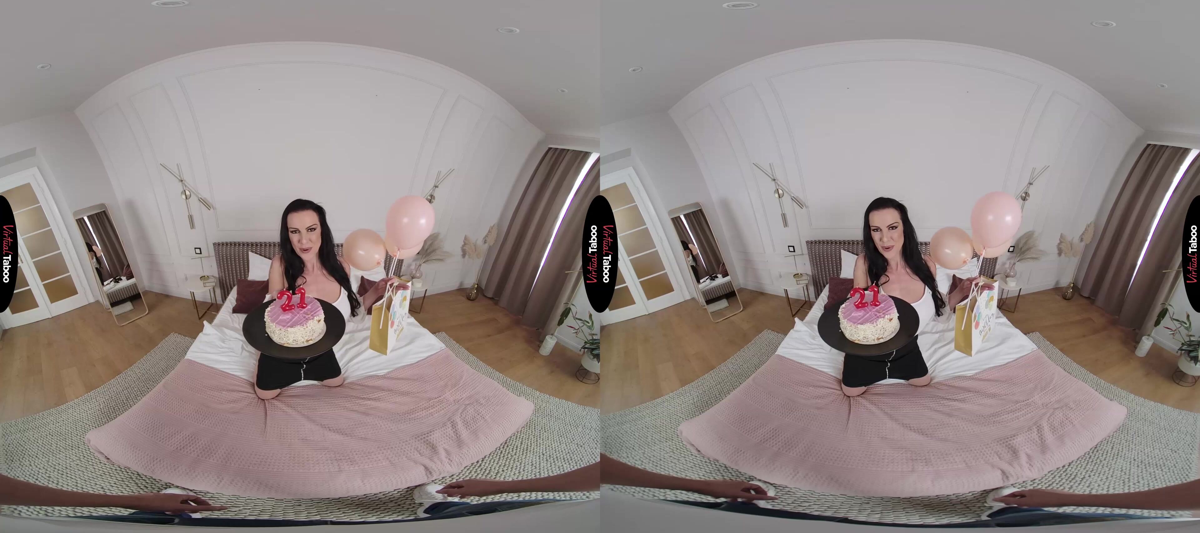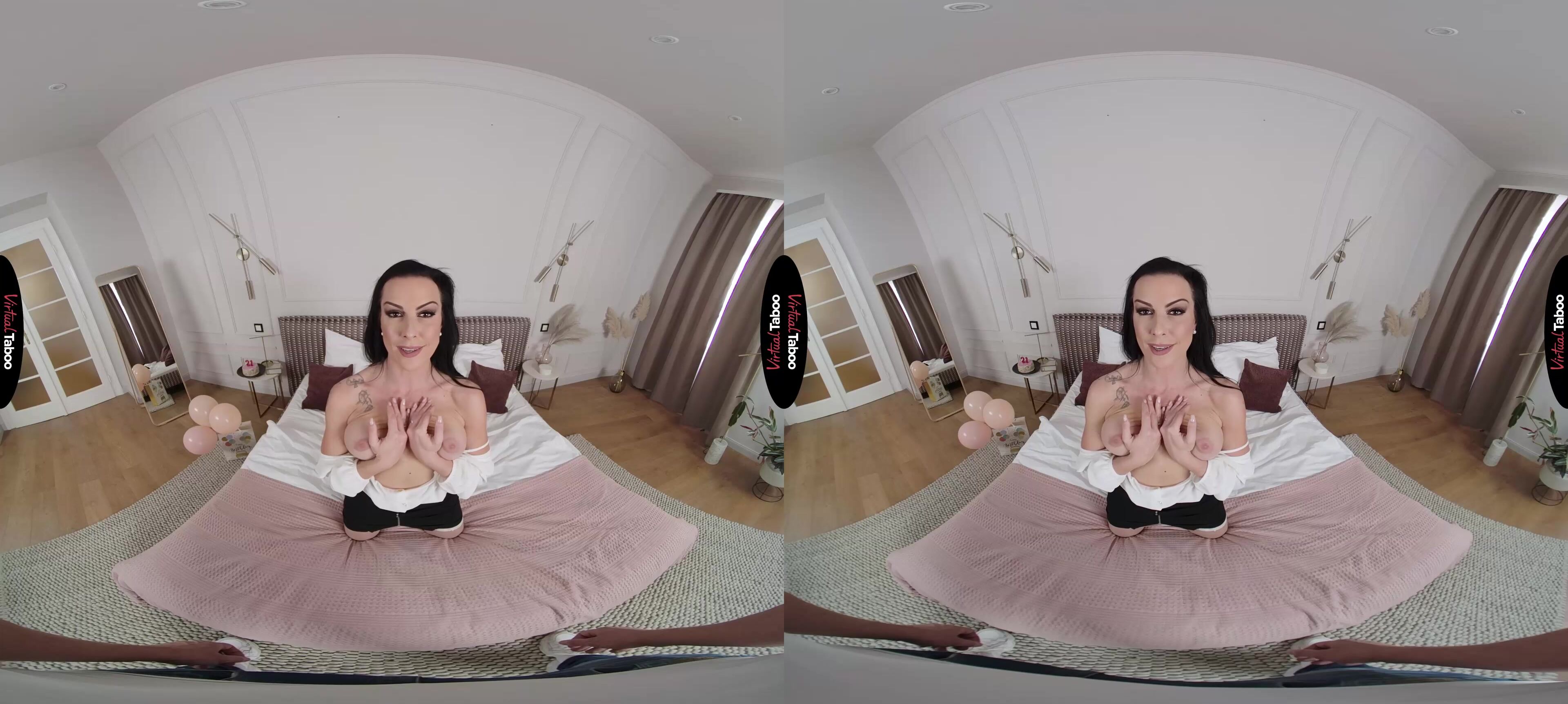 Texas Patti VR has planned a special celebration for her stepson’s twenty-first birthday. She surprises you when your father is at work with balloons, a cake, and a gift. You are surprised and want to know why she didn’t wait until your father was home. Texas Patti shows you the real present but takes down her top and shows you her tits. She has seen you staring at her and knows about the Taboo VR Porn you watch. She lets you know that it’s OK. She is flattered that you would think about her sexually and wants to show you that the feeling is mutual. Putting the cake aside, Patti strips, getting a thumbs up from you when she asks if you like what see so far. Now it’s your turn. She wants to see what you are packing in your jeans and smiles when she sees your young cock standing at attention for her. Your meat is in her mouth before you can even blow out the candles on your cake. Texas Patti knows how to make a man feel good and gives you the best head of your life. She pulls off her panties and invites you to take a ride from behind. Your young, hard cock makes her cum in record time and she shocks you by cleaning him off with her mouth before getting on top and bucking her hips. It feels so good for you both that she doesn’t notice you tensing up. By the time she realizes what is going on, it is too late, and your load is gushing out of her freshly fucked pussy. No point in worrying about it, but next time she knows to be more careful.