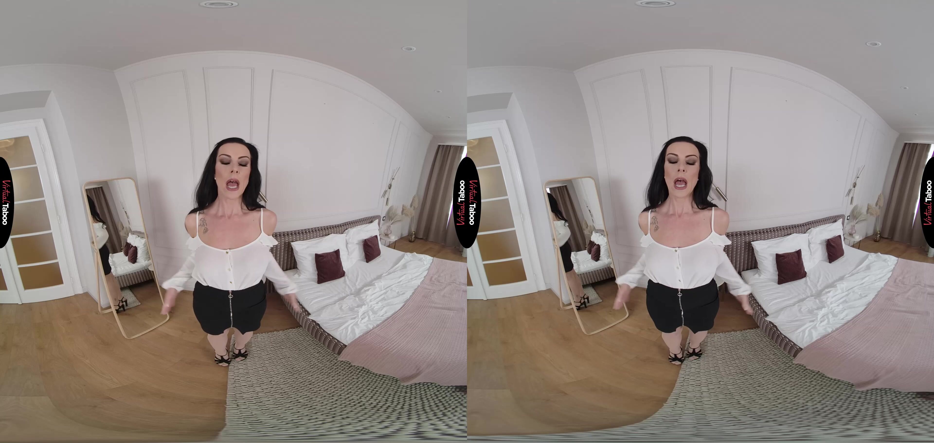Texas Patti VR has always been a great stepmom. She has taken care of everything around the house for years. Now that you are busy with college, she has taken a job outside of the home for the first time in years. Nervous about her first day in the big Virtual Reality company, she calls you into her room to give your opinion on her work attire. Her tight skirt and sexy top shock you a bit and she notices you staring. Not the reaction she was expecting from her stepson, but a flattering one for sure. Seeing your hard cock through your pants, she decides to tease you a little, adjusting her stockings and giving you a great view of her long legs. Now you're staring with your mouth open as she pulls down her top. You get a great look at your stepmom’s tits and can’t help but squeeze your cock. That is exactly what she wanted to see. It has been far too long since a man has looked at her with this much desire and she wants to see just how far you are willing to go. She smiles and tells you that she will take more off if you take your cock out and stroke it for you. Who cares that she’s your stepmommy. She wants to see you pump for her and slips her fingers into that hot wet pussy. You are both racing towards climax as she shows you just what a boss bitch she really is. You blow your load all over the floor watching her cum. If the guys in the office react this way, she will be running the place in no time.
