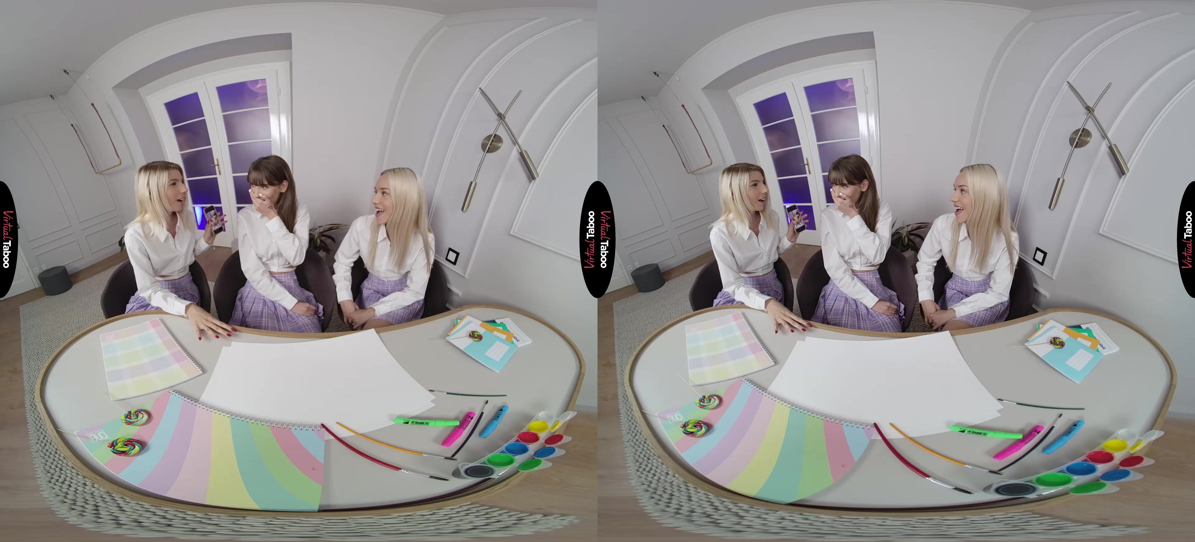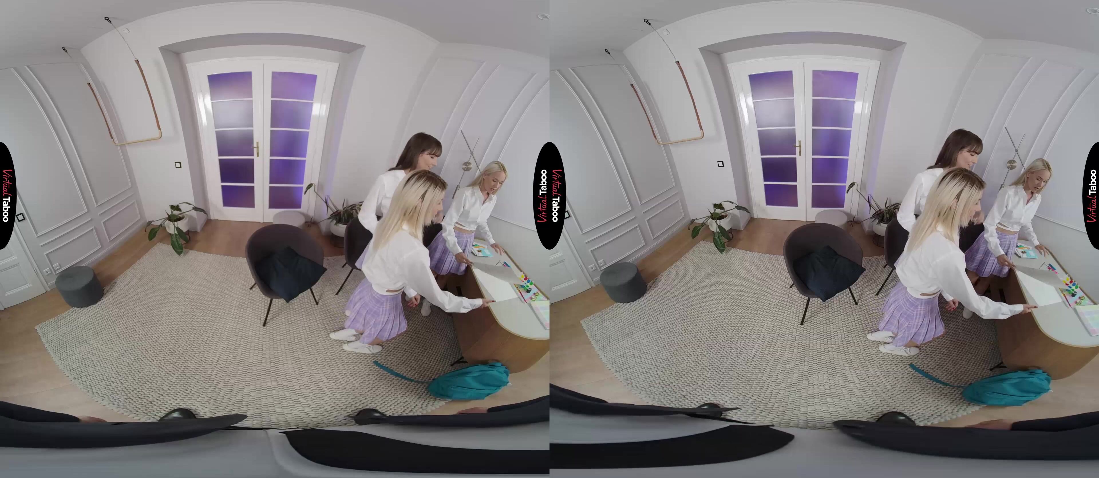 After fucking their handsome professor, Missy Luv, Barbie Brill and Lili Charmelle decide that they have to show their love to their teacher. They know exactly what to do to get the professor’s attention. In this VR porn video, they paint a sign to make their feelings clear and then pick out sexy matching schoolgirl uniforms before paying him a surprise visit. You are nervous when all three of them show up at your door, but their clothes and demeanour give you the idea that they are here for fun. If their “We Love You” sign wasn’t quite enough, their collective tit flash certainly does the trick. Their panties come off as your cock comes out and the two sexy blondes are eager to introduce their friend to his throbbing meat pole. They pass it back and forth, each one trying to suck you better than the last. Lili gets to fuck you, but keeps her mouth busy thanking and satisfying her horny classmates. Knowing it could cost you your job, you are sure to get as much pleasure out of this impromptu private VR porn tutoring session as possible. You fuck each tight pussy with long deep strokes, enjoying your second time with young ladies. Though they are fine sharing your dick, all three girls are greedy when it comes to your load. They all want to be the one to make you shoot, but you are smart enough to spray your cream across all three pretty favourites. It wouldn’t be proper for you to show favouritism after all.