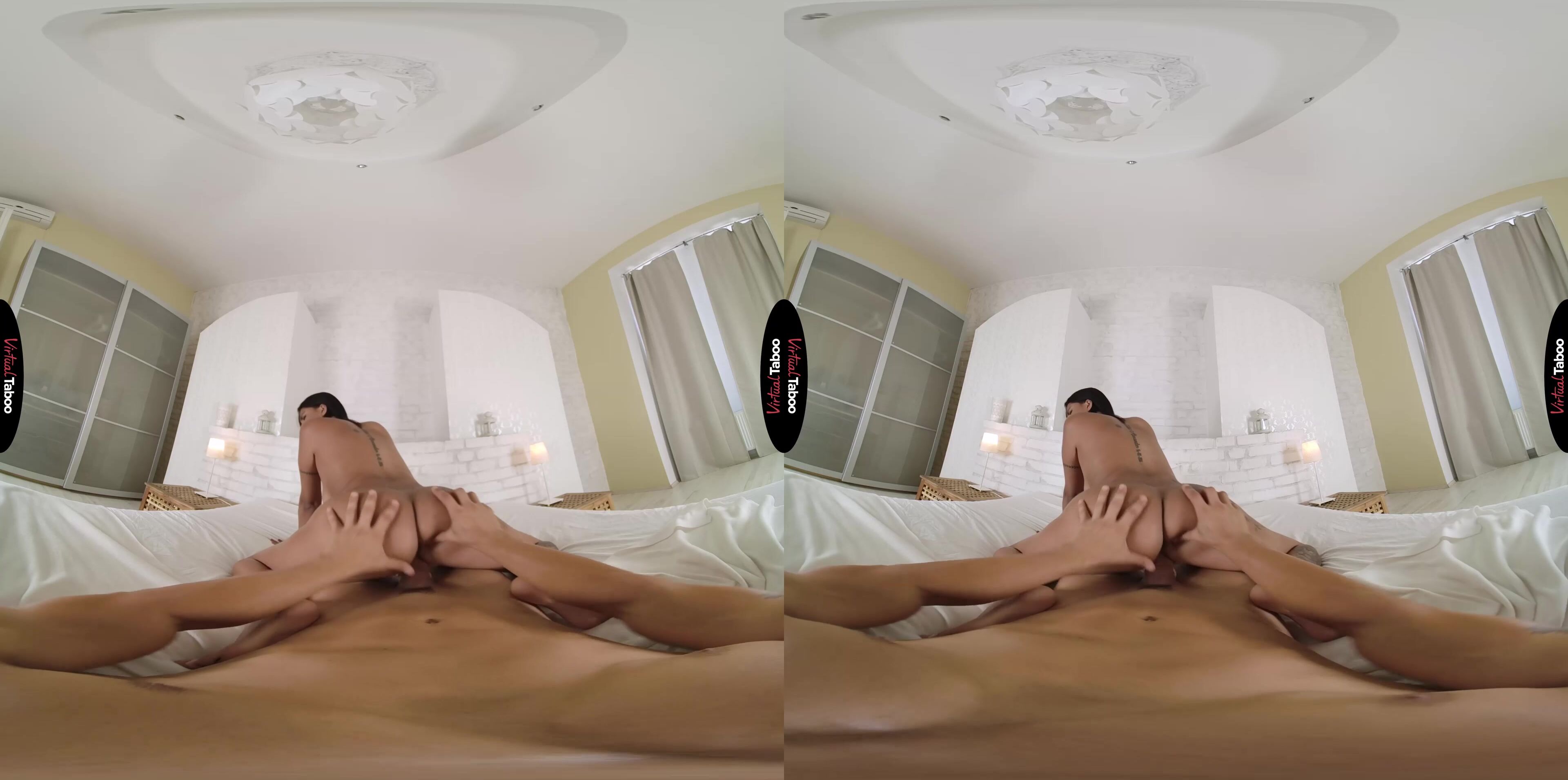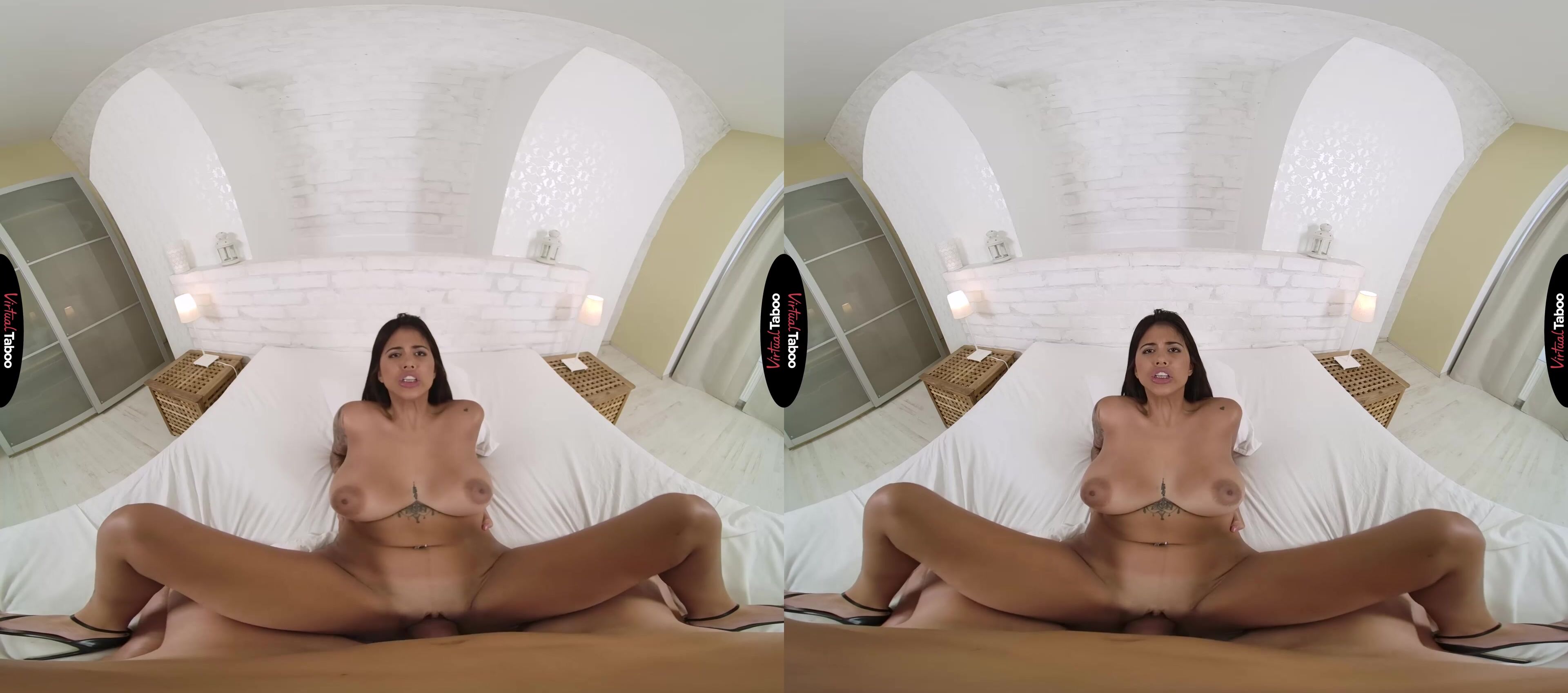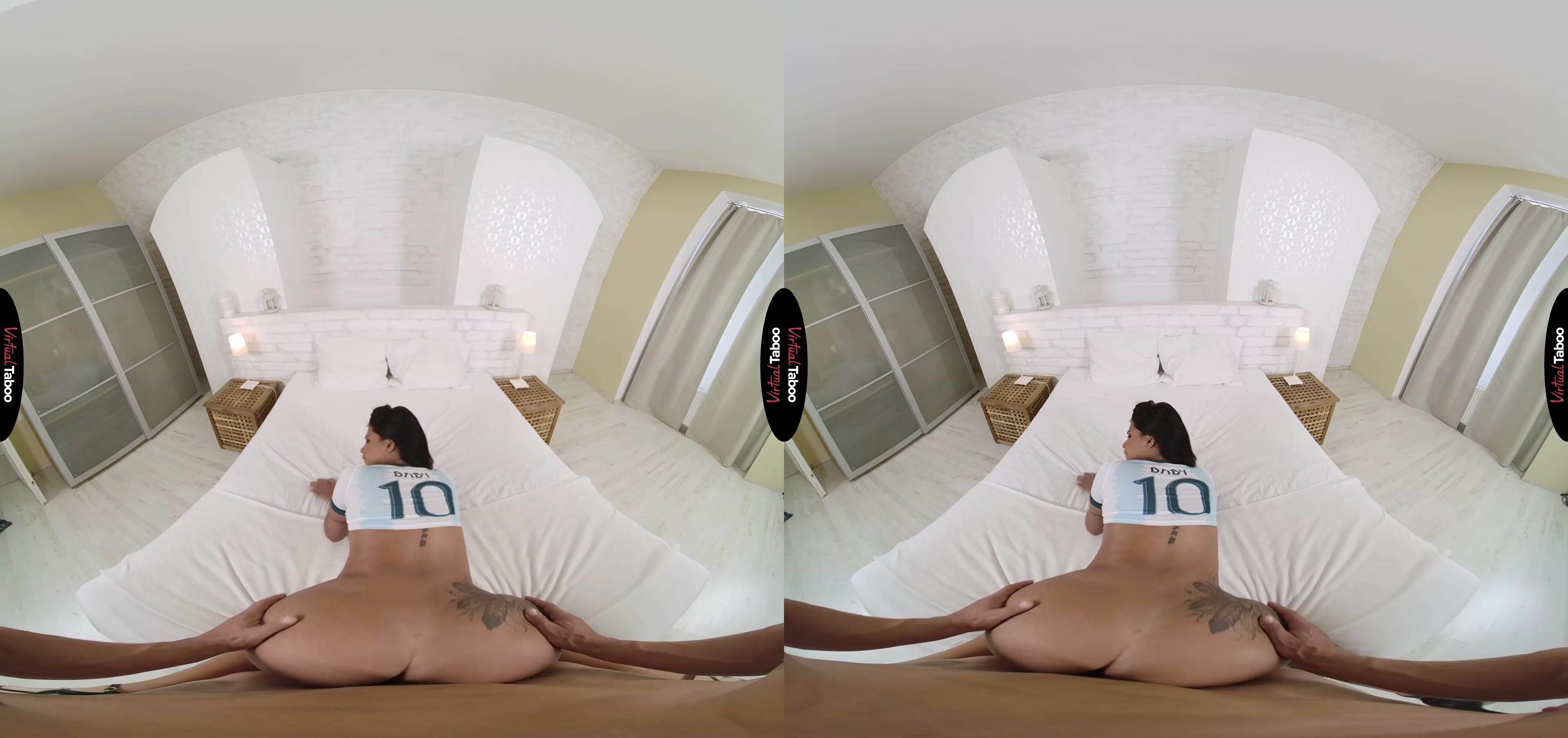 Yorgelis Carillo VR has had a crush on her stepfather for a long time. Shortly after turning eighteen, she decides that she needs to let him know that she wants him. Knowing that his favourite thing in the world is football and that he lives and dies with his team, she comes up with a plan. The busty teen figures that the best way to get his attention is to don the colours of his favourite team. She squeezes into an outfit that shows off her curves and leaves little to the imagination and starts snapping some selfies that she plans to send him when her mom is away. She is getting naughty with the pictures, showing off her juicy ass in tight shorts and bouncing her titties and acting like a professional VR porn model. Yorgelis doesn’t hear you when you come in and catch her. You can’t believe what you are seeing, but also can’t hit the big hard-on in your pants. You love her outfit and want to be inside of your sexy stepdaughter as soon as possible. She is shocked at how big your cock is, but is happy to take it into her mouth and show you that she knows how to please a man. You like her outfit so much that you have her leave it on, pulling the shorts down just enough to fuck her tight holes from behind. You give it to her good, making her moan and scream with each thrust. She wants to make sure you want to fuck her again so she wraps her tits around your dick and pumps until you are ready to blow. No way her mom can do that and she would never let you cum on her tits the way she does. She is the winner and happily claims her trophy as a top football slut.