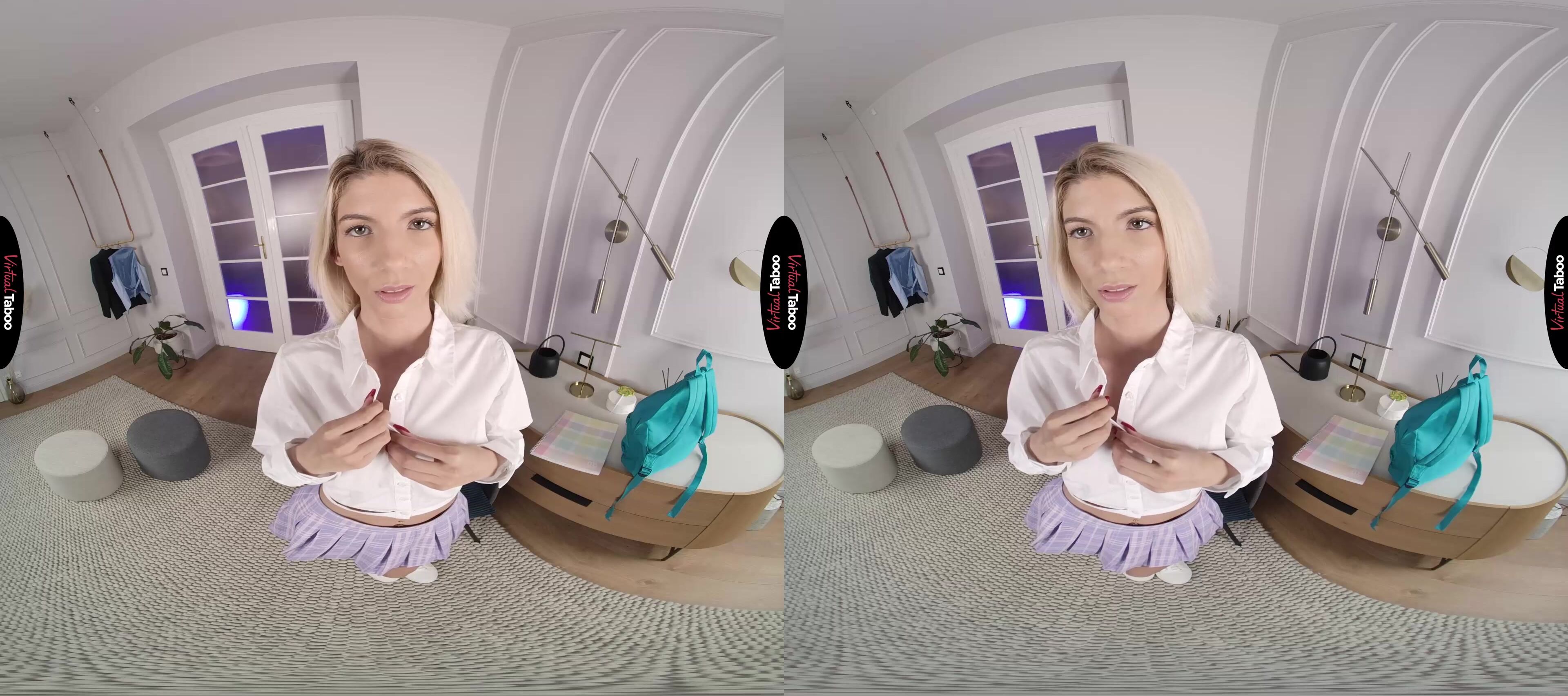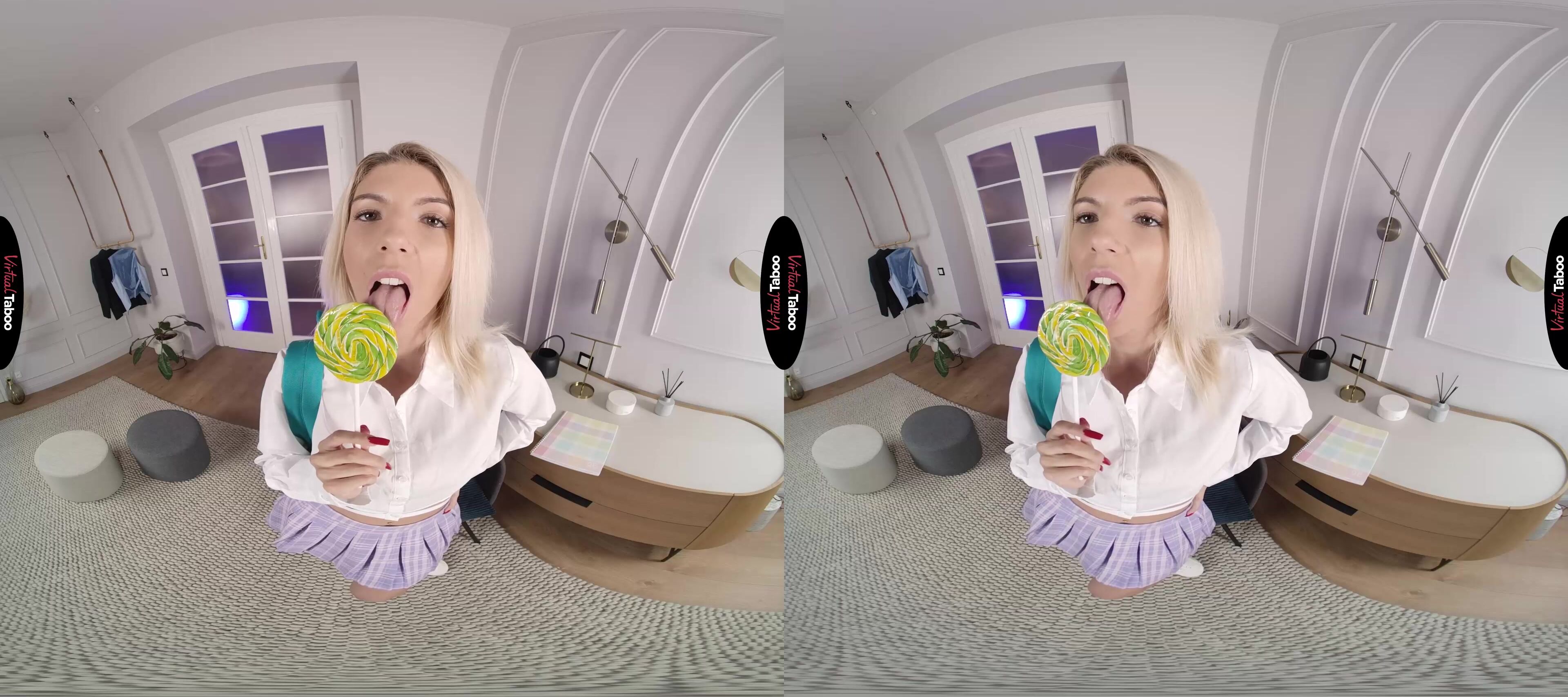 You love your girlfriend, but after a few years together the sex is getting a little stale. She is worried you might be drifting apart and after a little snooping, has discovered your VR Porn history and your school uniform fetish. Wanting to spice things up, she does a little shopping and has a huge surprise for you. You are shocked when you come home and find Missy Luv in a short skirt and uniform top. She can see by your reaction that you aren’t quite sure what to do so Missy licks her lollipop and tells you that she has been a very bad girl and needs to be punished. You can see her thin white panties getting wet as she rubs herself and stares at the growing bulge in your pants. Slowly pulling them aside, she gives you a better look but stops you when you try to get too close. This is not that kind of date. This is more of a look and enjoy kind of evening if you’re up for that. Why not? She looks great and is putting on a really good VR porn show as she encourages to take out your cock and jerk it for her. You are happy to show her hard she has made you and join her as she works her fingers over her sweet wet lips. The cute outfit is a nice addition, but you can’t take your eyes off of her tight body and pretty face as she encourages you to for her while she watches. She spreads even wider and drives her fingers in deep while she begs to see you shoot. Who will get there first? You know that no matter who it is, you are both in for a long and wild night.