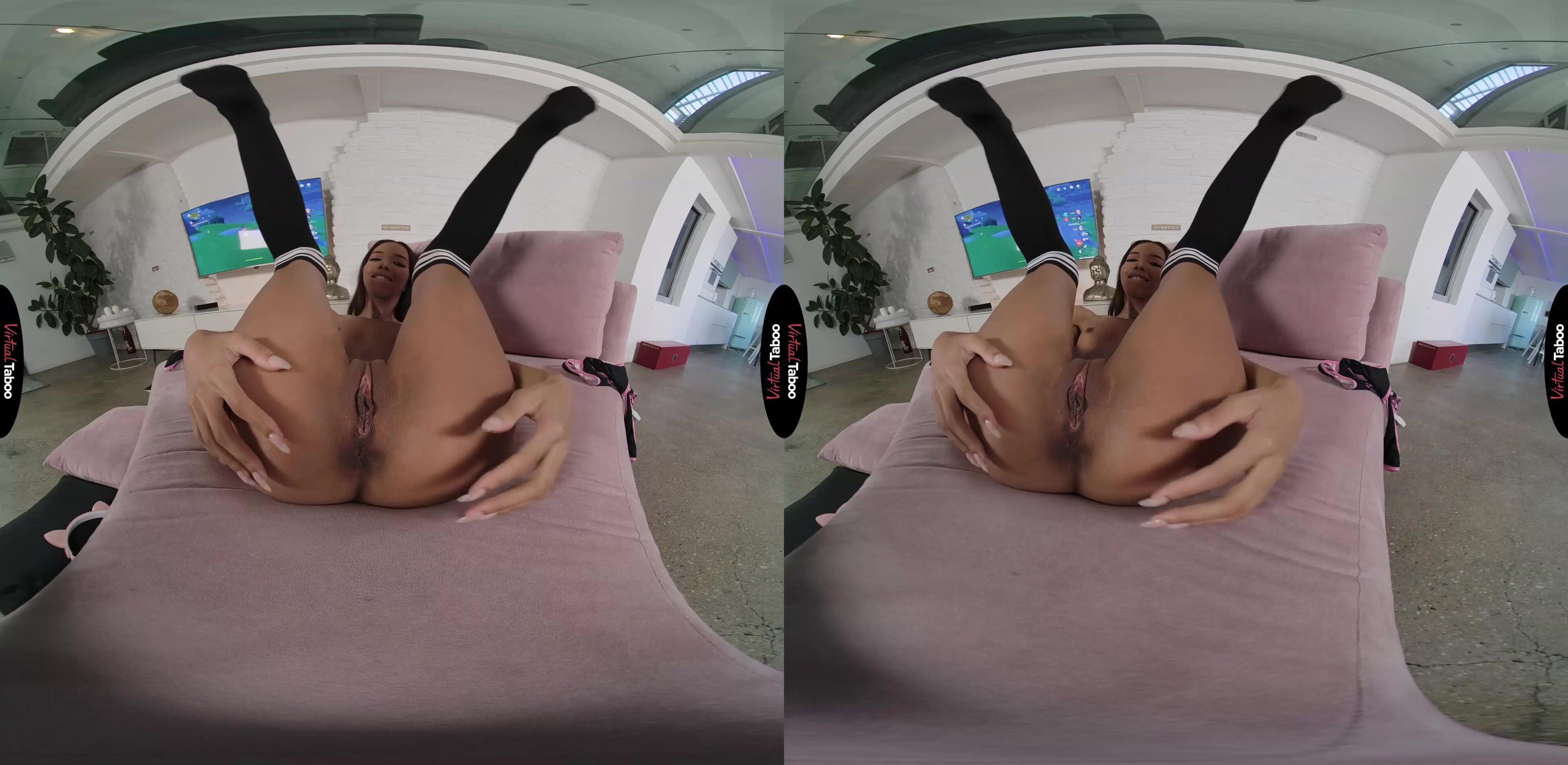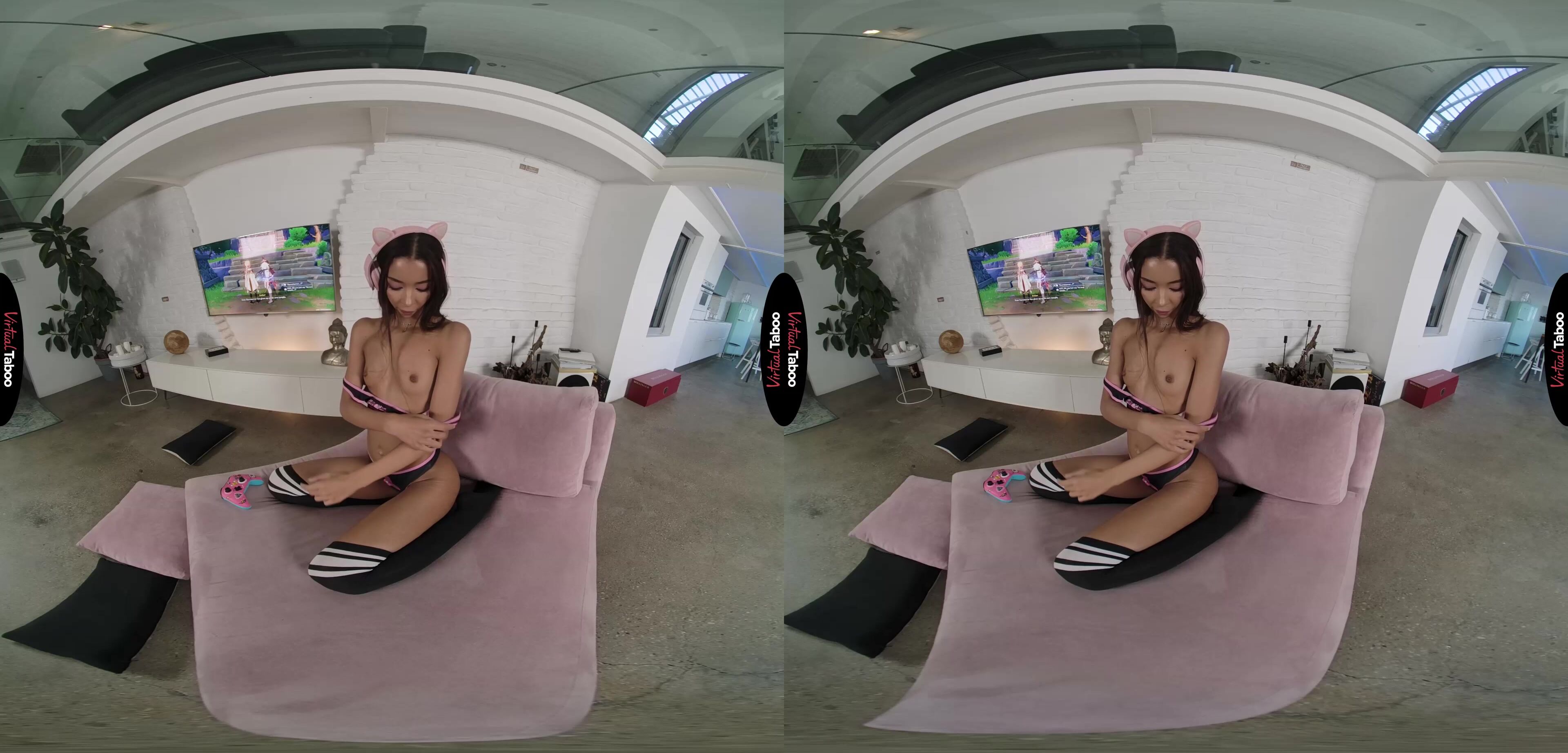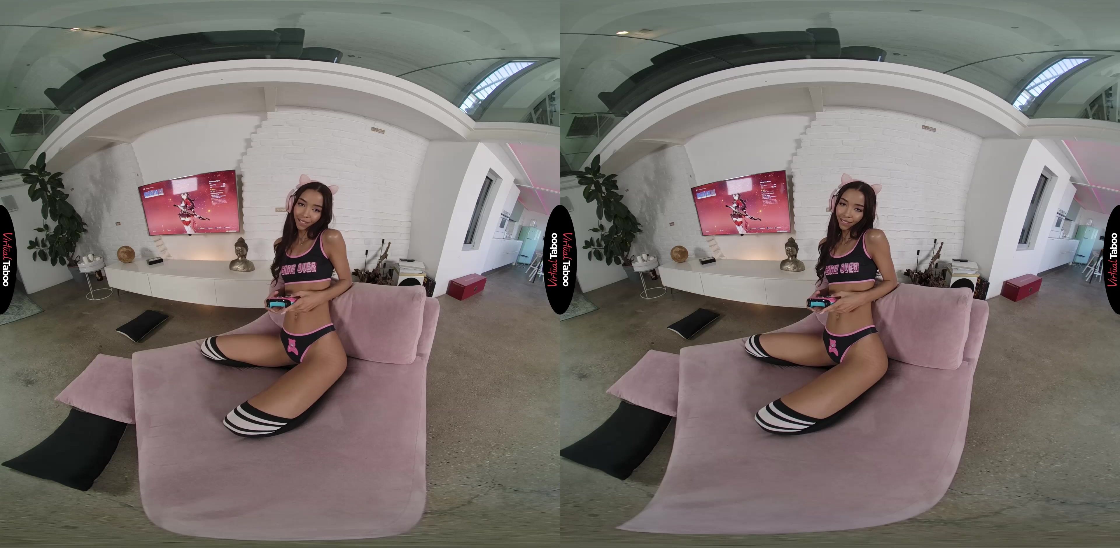 Lia Lin had a reputation at school as a slut long before your mom married her dad making her completely off limits. That meant having your friends talk about fucking her and knowing that she was doing live gaming streams half naked in the same house. You tried to ignore that by spending your time locked in your room watching VR Porn, but the hot taboo scenes only fueled your desires for your former classmate turned step-sibling. Your lust was not much of a secret. Lia was used to guys staring at her and wanting to fuck her. She knew exactly what you were watching behind your closed bedroom door and it turned her on too. One night you see a note slipped under the door inviting you to watch her gaming stream live from her bedroom. When you enter the room you find Lia in one of her skimpiest gaming outfits. She invites you to sit down and watch this very special VR porn show. As she plays, she tells you that she knows you watch her and think about her when you’re jerking off. She confesses that it is hot, but now that you are step-siblings it just wouldn’t be right to do anything. That doesn’t mean that you can’t watch her, with your cock out and enjoy yourself. You agree and stroke yourself while Lia plays, teasing you with her tight teenage ass and sultry stare. Seeing how big your cock has grown, she takes off her top and plays with her nipples. This is making her super horny and because she is a gamer, Lia has a challenge for you. Stroke at full speed while she plays with herself and see if you can hold out until after she cums. Can you do it? Are you man enough to wait for her before you explode? If you win, who knows what she might do next.