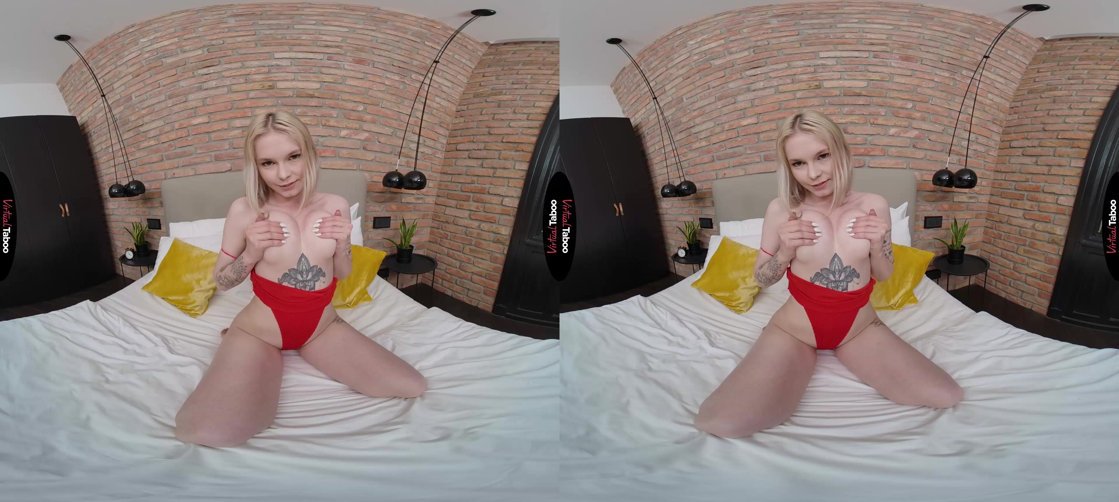 You weren’t sure what to expect when your step-sister Mimi Cica invited you to her bedroom. She is smoking hot and you went right home after a new date to jerk off to taboo porn on your VR headset. You come to her room and are stunned. She meets you in an outfit that barely covers anything. Not that you are going to complain. She looks like a taboo VR porn model. Her long legs and tight ass are exposed and her boobs look perfect in the red bodysuit. When you pick your jaw up off of the floor, Mimi explains that she needs your opinion regarding her new swimsuit. She is in a good mood and would like to have some fun. No touching of each other is allowed, but you can watch her touch herself and if you feel like jerking off, she is very interested in seeing what kind of tool you’re packing. That is an offer you won’t refuse and she smiles when she sees that your cock is already hard. You stroke it while she shows you her body, bending over while you admire her ass. She can see from the way your cock throbs that you really want to see more of her tits. Holding them close to your face, she squeezes them and tells you how she likes them licked. You make notes for later, but are so close to cumming now. Watching you explode in your hand turns her on her and bucks her hips as she creams her own fingers. You have passed the test so he lets you taste her juices on her fingers. Wait until you see her next time.