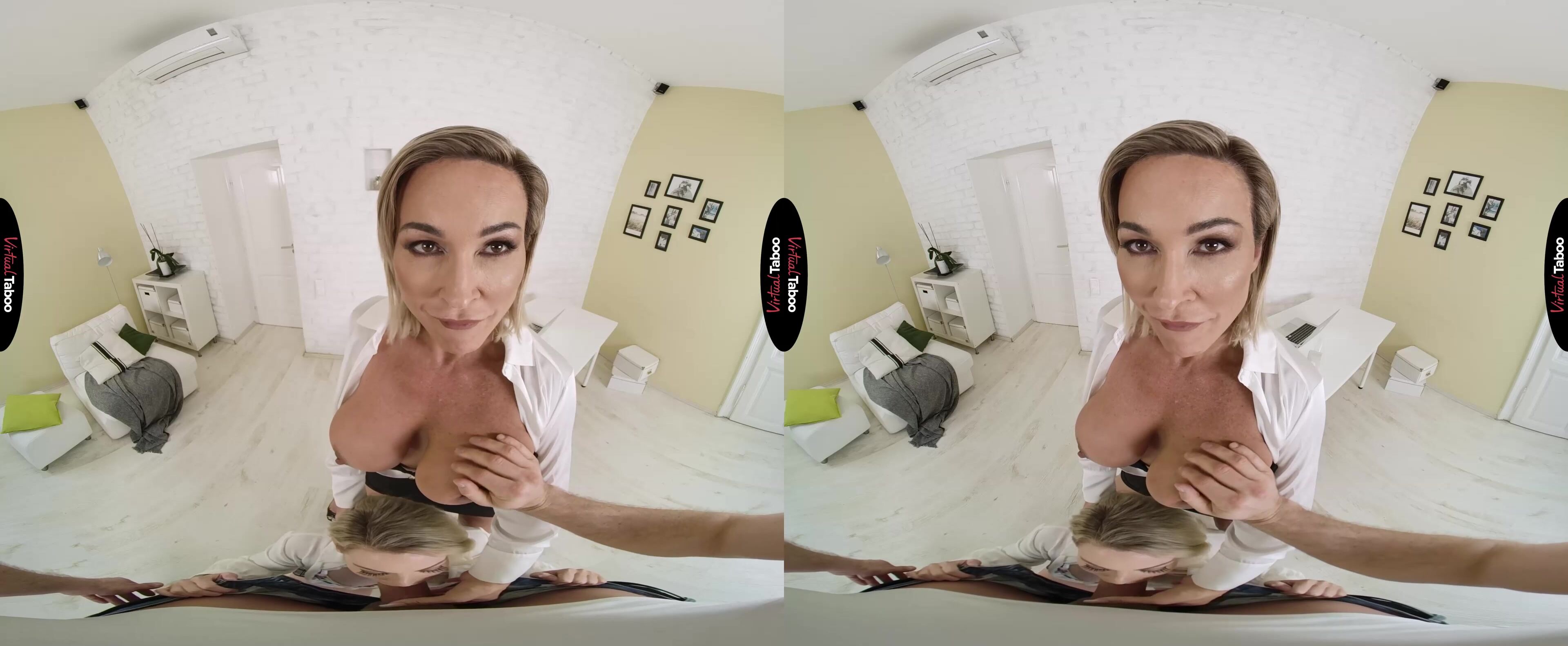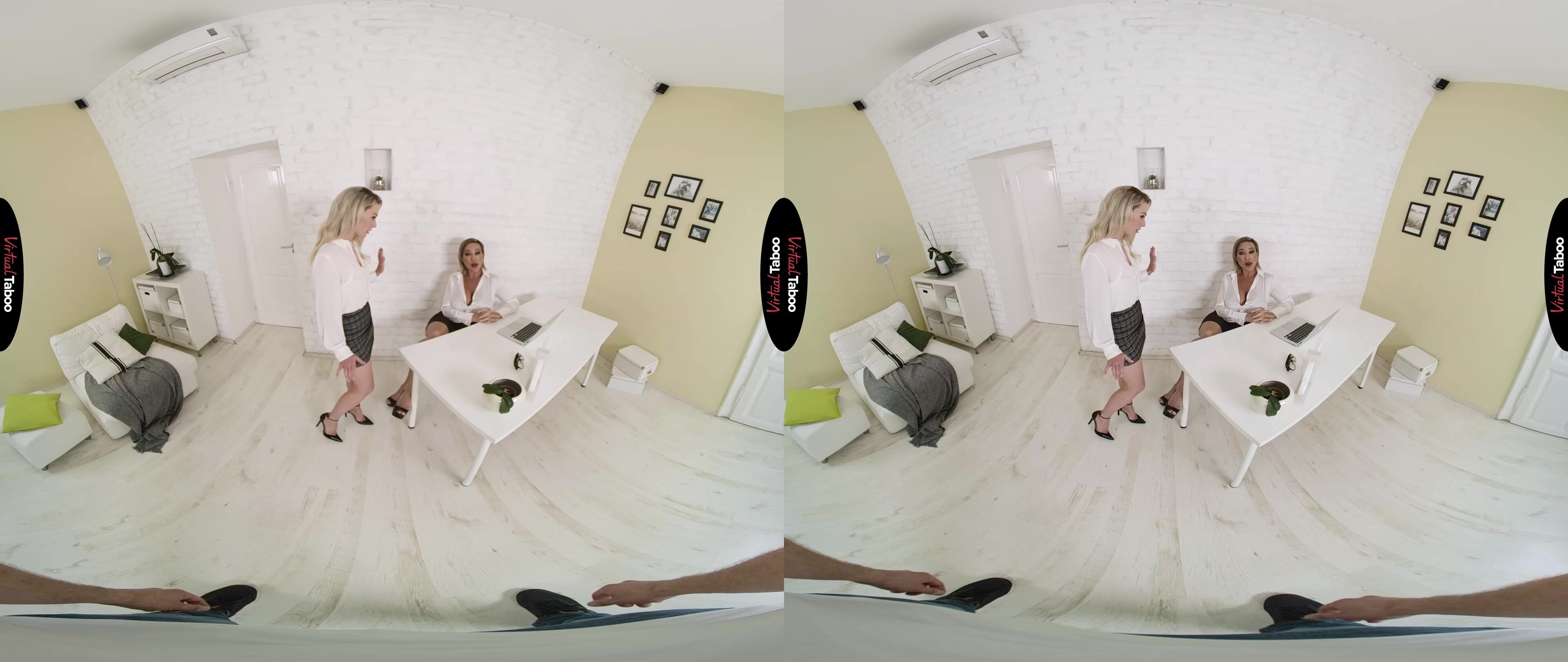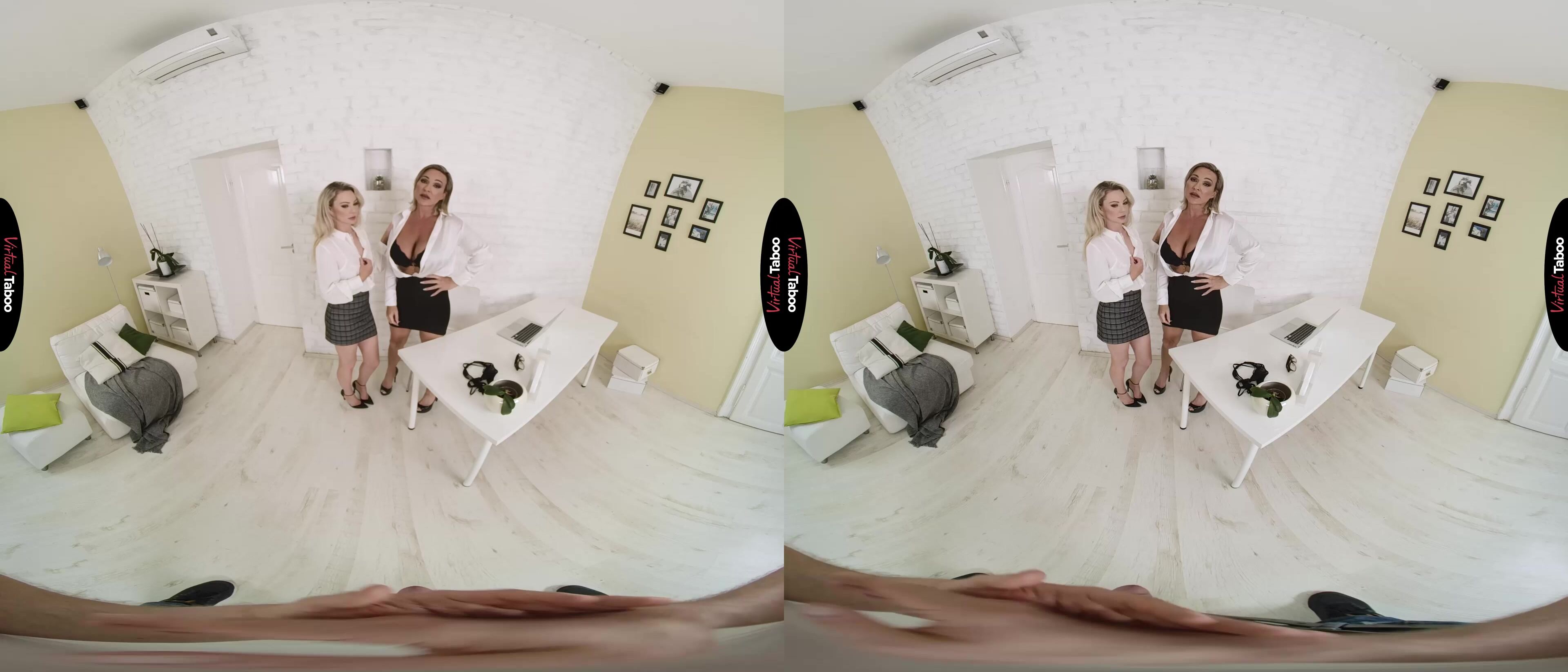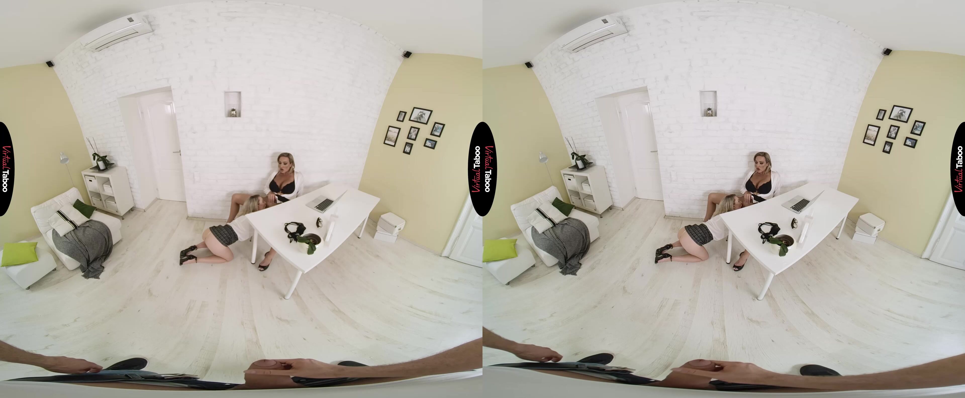 Aubrey Black has built up her home business to the point where she needs help. She has enlisted the help of Isabelle Deltore to assist with the launch of her new VR online store. Aubrey didn’t just hire Isabelle for her business skills, however. She is quite fond of how the pretty young blonde looks in short skirts and the way her lips taste when they take frequent breaks to make out. Since Aubrey’s husband works and her stepson is in college, they usually have the house all to themselves. This leaves plenty of time and privacy for Isabelle to crawl under her boss’ desk and please her mature pussy with an eager tongue. They are so engrossed with each other that neither of them notices when Aubrey’s stepson comes home early. You were hoping to get some alone time to watch some VR Porn, but instead, catch Isabelle going down on your sexy stepmom. They don’t really mind the interruption and ask if you would like to join them. You try to hesitate, but the huge bulge in your pants gives away your true feelings. Impressed and already all warmed up, the two blondes attack your meat with their hungry mouths. Isabelle goes first, but she can see the lust in Aubrey’s eyes. She wants to fuck her husband’s son so bad that she can’t wait. Helping her friend and boss on top of that big young cock, she bounces Aubrey up and down while playing with her big tits. Letting Isabelle have her turn, Aubrey saves a surprise for the end. After sucking your load into her mouth, she spits it into her friend’s mouth so they can share a big sloppy kiss. They both agree to hire the young stud to help make the days even hornier.