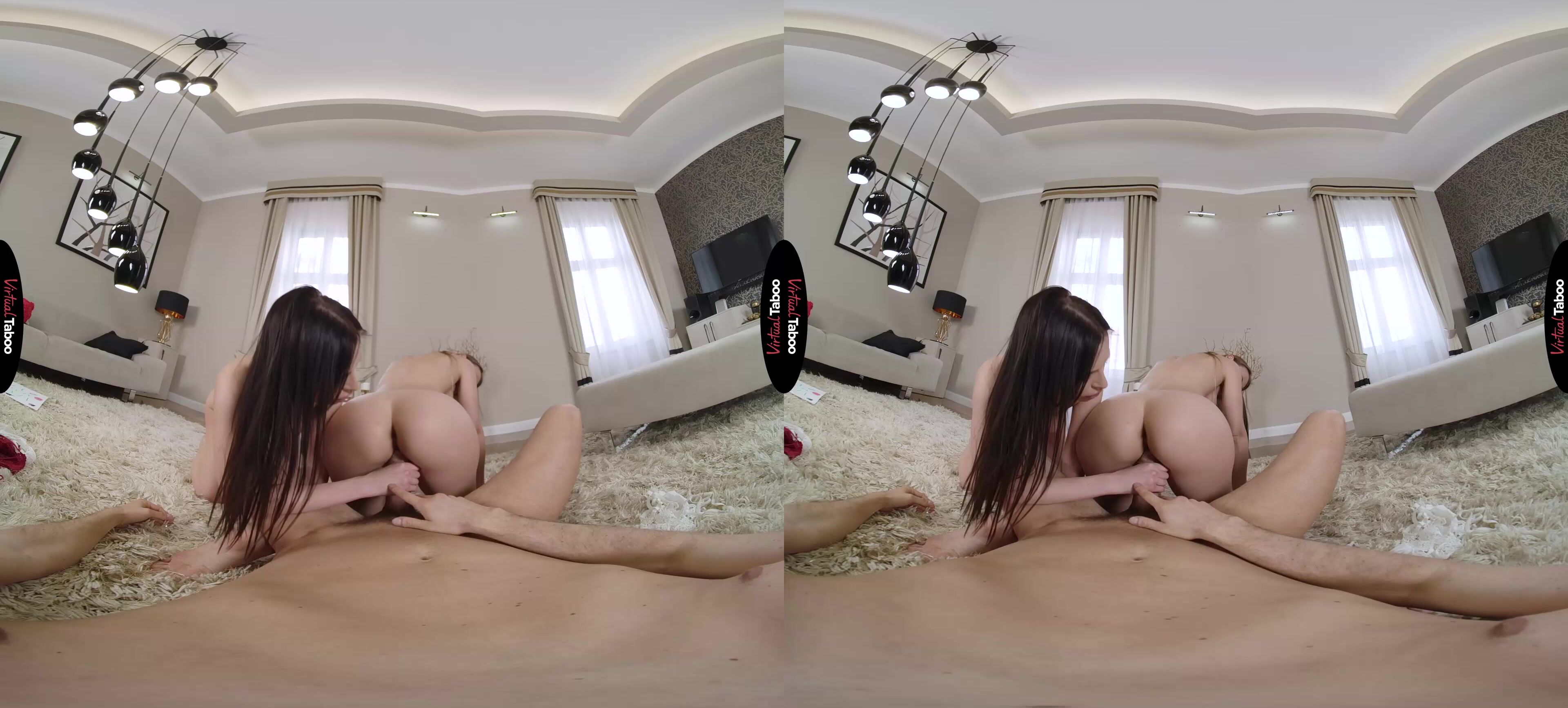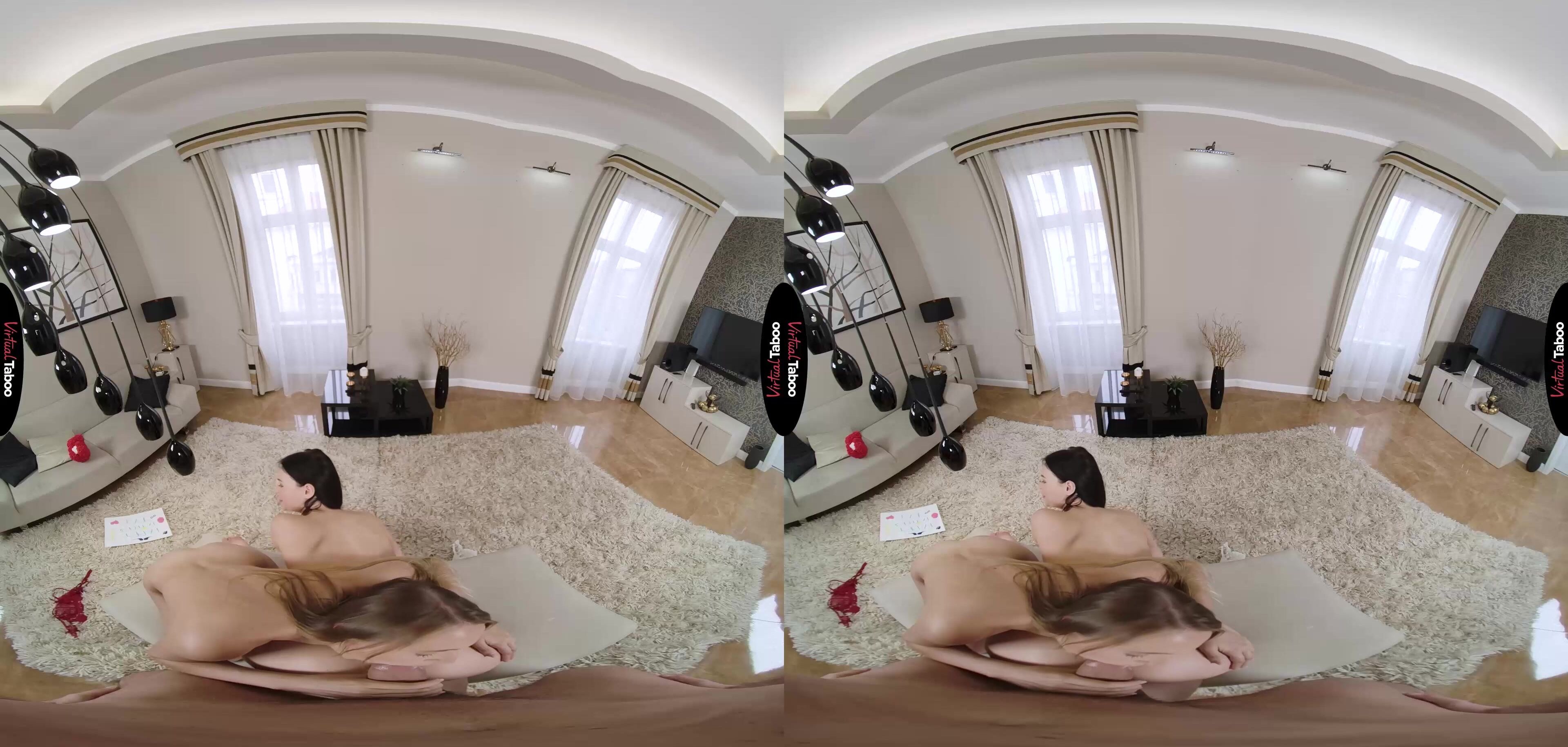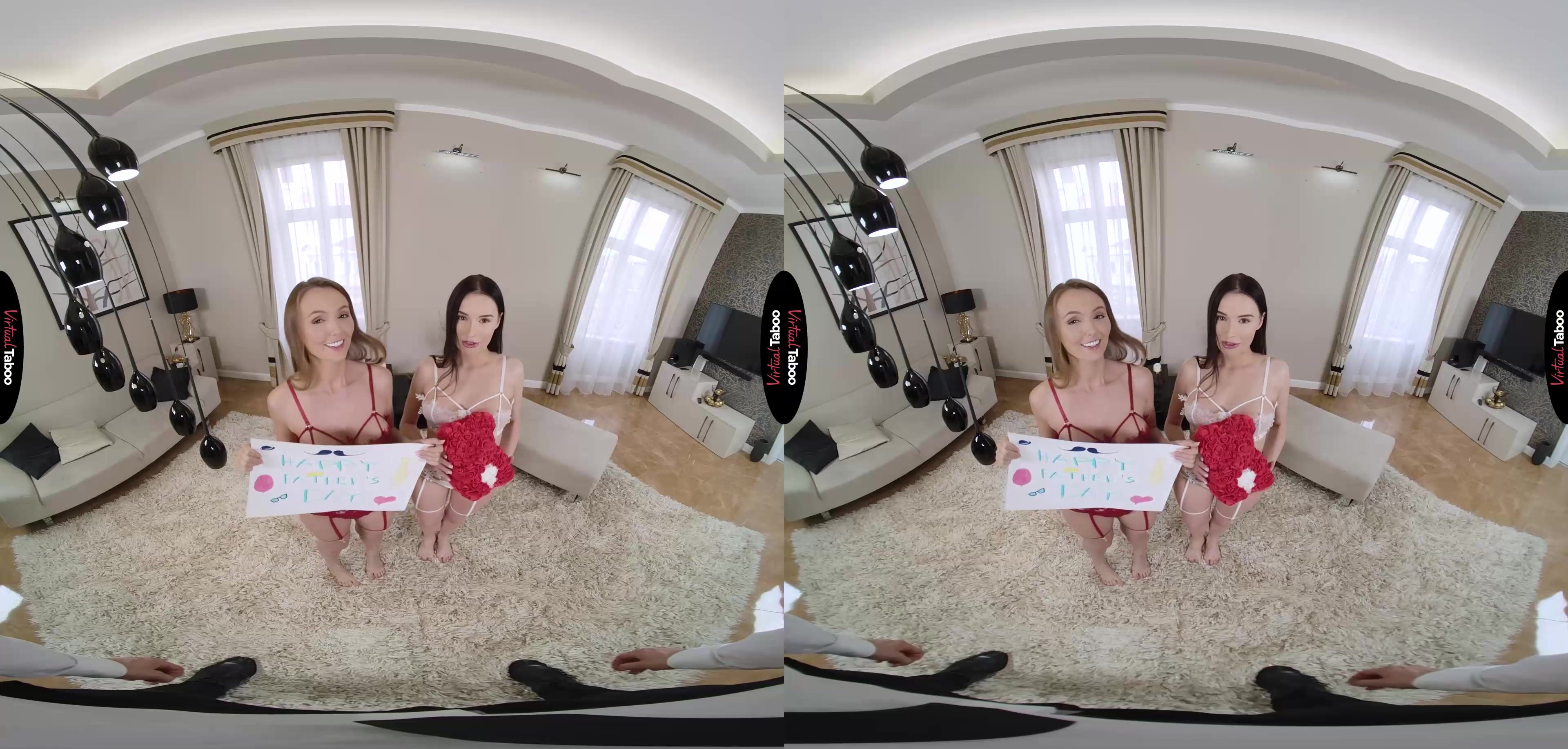 Sia Siberia has developed a huge crush on her stepfather in recent months and wants to show him how she feels by doing something special for him for Father’s Day. She enlists the help of her friend Milena Ray who is shocked by the idea at first, but can’t resist helping her friend to seduce the handsome older man. They buy matching lingerie in red and white and are ready for you when you come home. Holding up a sign to let you know they are your gift, the girls see a worried look on your face, but a growing bulge in your trousers. At first, you focus your attention on Milena, but Sia is not about to let you get away with ignoring her. Stepdaughter or not, she is here to play and play naughty. Any resistance you might have is lost as soon as Sia puts her lips around your throbbing cock. Your VR porn fantasy came true. She is much better than her mother and you let out a big moan to let her know what a good girl she is. The girls share your cock and know that they have succeeded in seducing you. Now you just need to decide which wet teen pussy to fuck first. In this VR taboo episode, Milena is the one you choose, but you can’t stop looking at your stepdaughter, wanting her until you finally pull out and switch to her pussy. From here the two teens take turns with your dick until you feed them a huge load of cream that they pass back and forth while you watch. Mission accomplished, but this is Father’s Day. Sia has plans for your second load that are sure to make mommy jealous.