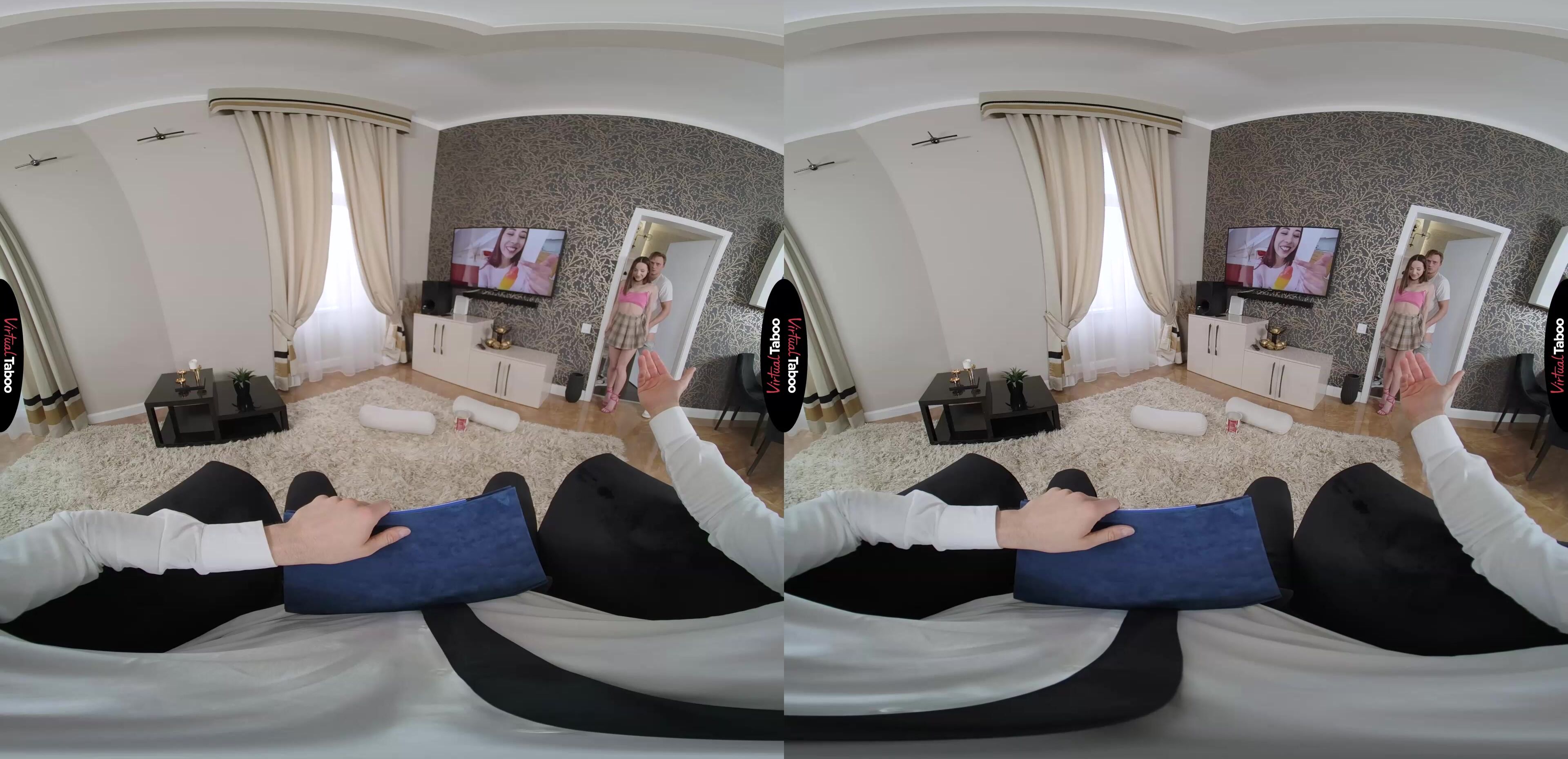 Kate Quinn hasn’t been able to see her boyfriend in a few weeks. She thinks she is finally going to get some alone time when her mom and stepdad have big plans for the weekend. When her mom gets stuck out of town, Kate and her boyfriend have an unwelcome third wheel for their date night. Their hot and sexy time is quickly scrapped and VR porn movie night with her stepdad takes its place. Not about to let her stepfather ruin their evening, Kate finds ways to sneak in some sexy flirting. She flashes her man some naked titties while you are distracted. Her boyfriend is worried about getting caught, but can’t resist her naked body. Overcome by lust, he slips his dick into her from behind and starts banging. After just a few strokes, they get caught by you. You shock them both by whipping out your cock and telling her to suck it. She has always wanted a threesome and often fantasized about you so this is a VR taboo dream come true for the horny teen. Enjoying two dicks at once, she feeds on hard meat and lets her tight little hole cream all over thrusting rods. Watching Kate fuck her stepdad is turning her boyfriend on and he shoots his load all over her. She looks up at her mom’s handsome husband and feels his jizz spray her pretty face. As she sucks the last few drops out, Kate can’t wait until the next time her mom is away. She might just keep you for herself.