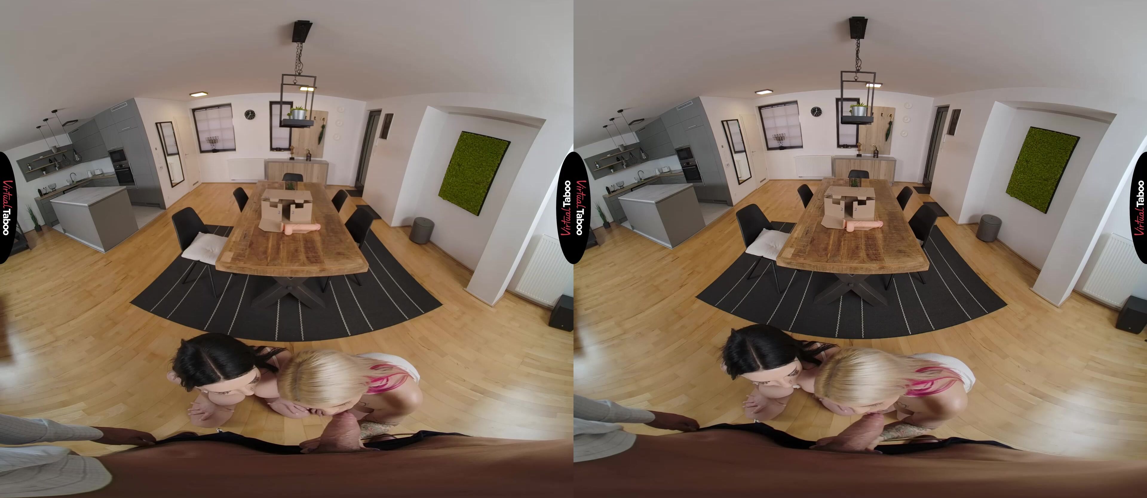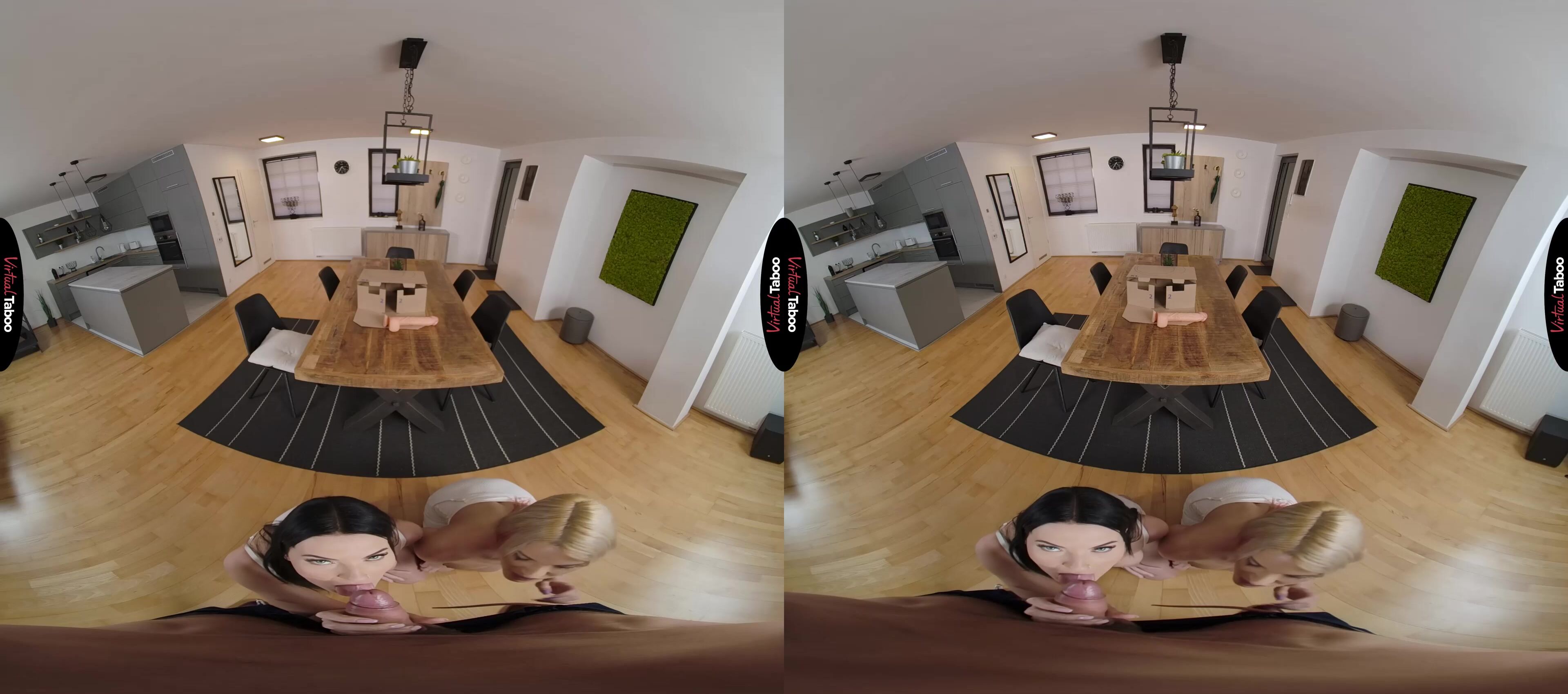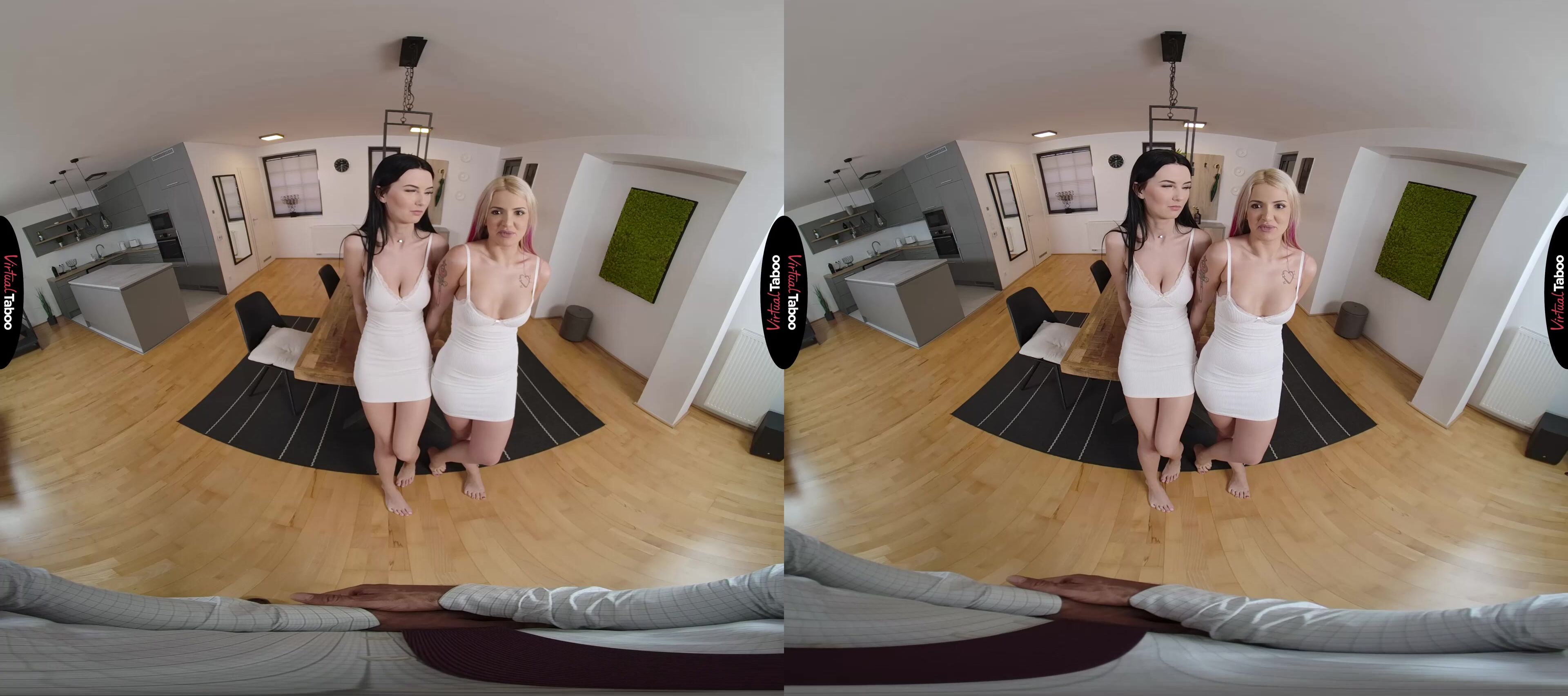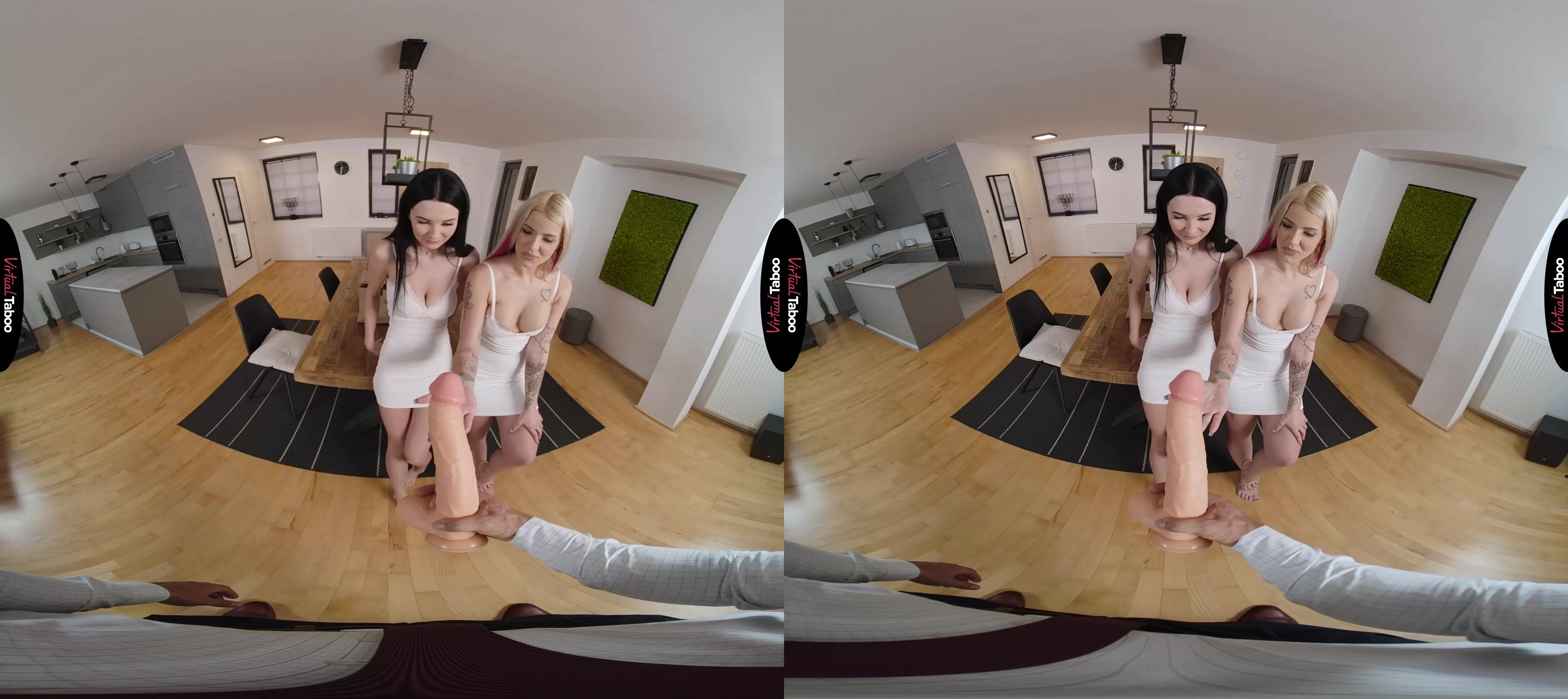 Crystal Richie and her best friend Simon Kitty have been very frustrated with their sex lives in college. The guys they hook with are nothing like the studs they see in VR Porn and nowhere near as big. They decide to be adventurous and order a big sex toy to see if bigger is really better. When the toy arrives, they are both excited and shocked to see that it is way bigger than they expected. Deciding it might still be fun, the two girls play with the monster dong and are so involved in their play that they don’t notice Crystal’s stepfather has come home. You aren't angry and encourage the girls to continue their exploration together. Simon has always had a thing for both her best friend and her stepfather so she is all for a horny taboo VR porn threesome. Crystal isn’t sure at first, but when you pull out your cock she forgets all about what her mom might think and join her friend on her knees to suck your dick. While not quite as big as their toy, your meat is far larger than any the girls have seen at school and they can’t wait to feel it inside of them. Since you are her stepfather, Crystal gets to go first, bending over and loving every inch as you work into her from behind. Simon is happy sucking on her pretty friend’s nipples until it is her turn to get boned. The girls can’t believe how big he is or how long you can fuck as they take turns riding and enjoying your delicious dick. As they share your hot sticky load they learn that the real thing is just so much better than any toy.