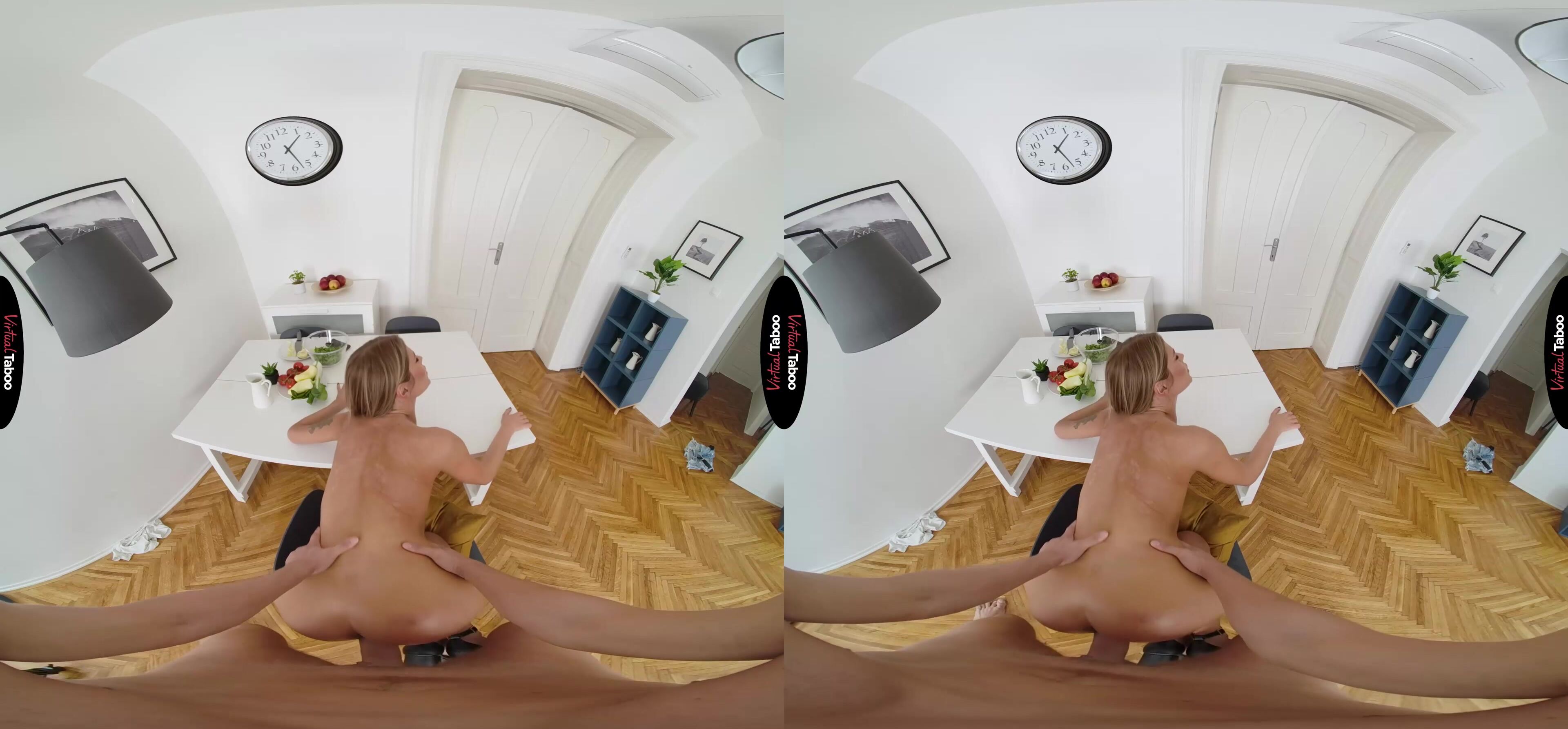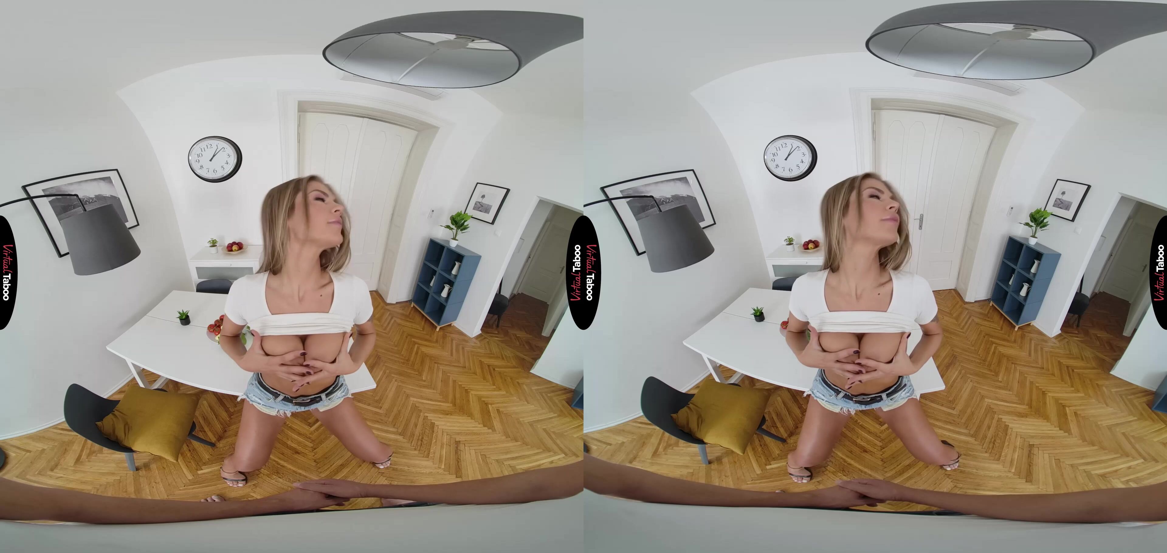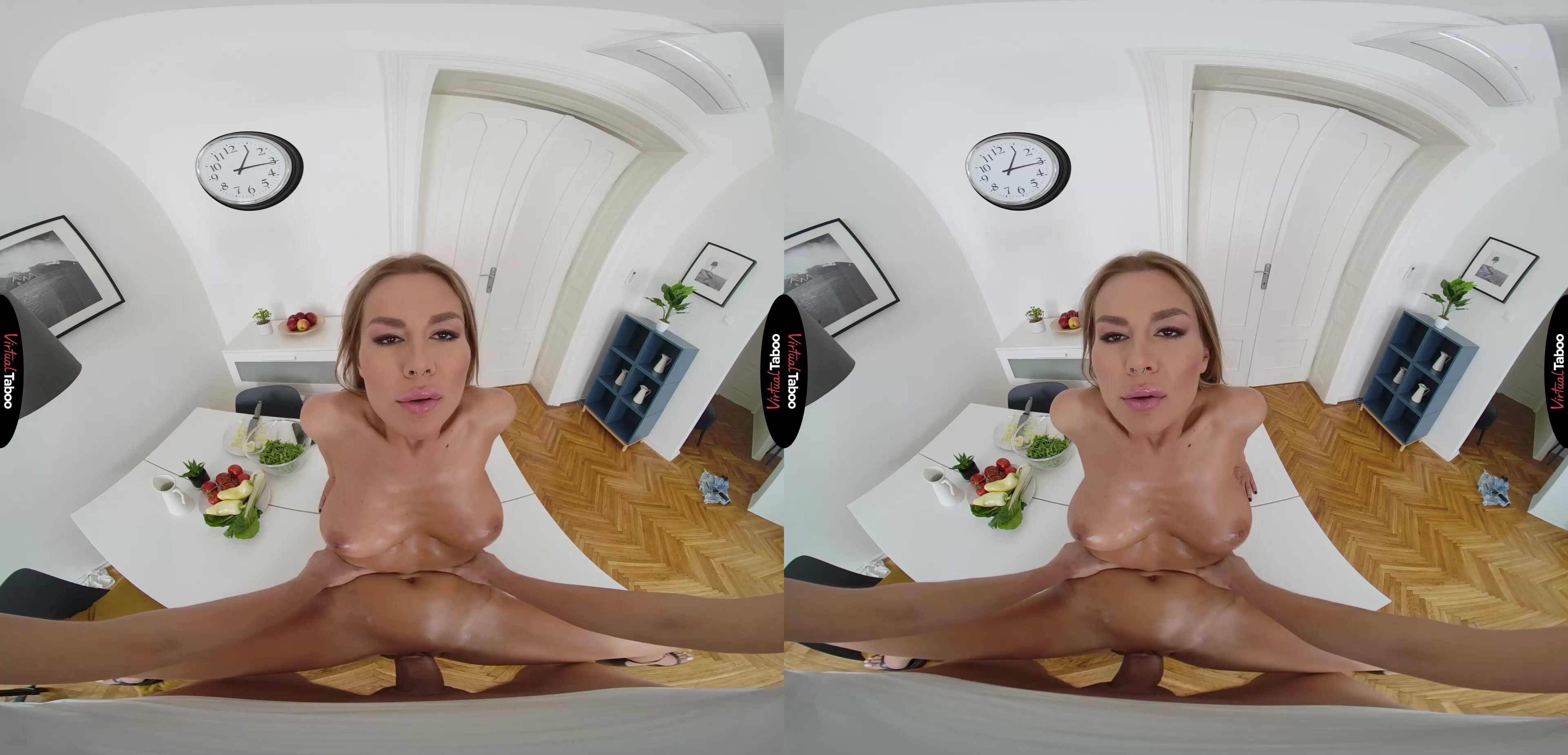 Zlata Shine has never had trouble attracting men. She is gorgeous, fit and always down to fuck with a guy she likes. Her new boyfriend is more serious though. She really likes him and wants him to be happy long term. Her mother suggests that she cook for him and Zlata tries. The trouble is, she is useless in the kitchen. After several failed attempts at a full meal, she decides to make him a salad instead. To make sure he wasn’t too disappointed she got dressed up in a crop top and the tightest shorts she had her in wardrobe hoping that the sight of her hot body might take his mind off of the food. Her stepbrother watched her preparing the meal and couldn’t help but notice just how hot she looked in her outfit. She looks like a hot VR porn model from your favourite taboo movies. She noticed you noticing her and was shocked at first, but turned on to see the way you were looking at her. In this VR porn video, she loses all interest in cooking and forgets that her boyfriend is on his way over. There is a hard cock waiting for her. Pulling down her shorts, she slowly pours salad oil all over her body and asks you if you would like to have a taste. Her slicked up flesh makes it easy for you to slide your cock right into her wet pussy. After a few hard strokes, she has forgotten all about her boyfriend or the dinner she was supposed to make. Instead, she focuses on wrapping her big tits around her stepbrother’s big cock and sucking all of her pussy juices from your meat. She loves bouncing on you so much that you both get lost in the moment and you shoot a big load deep inside of her. It looks like she may be serving her boyfriend a creampie for dinner.