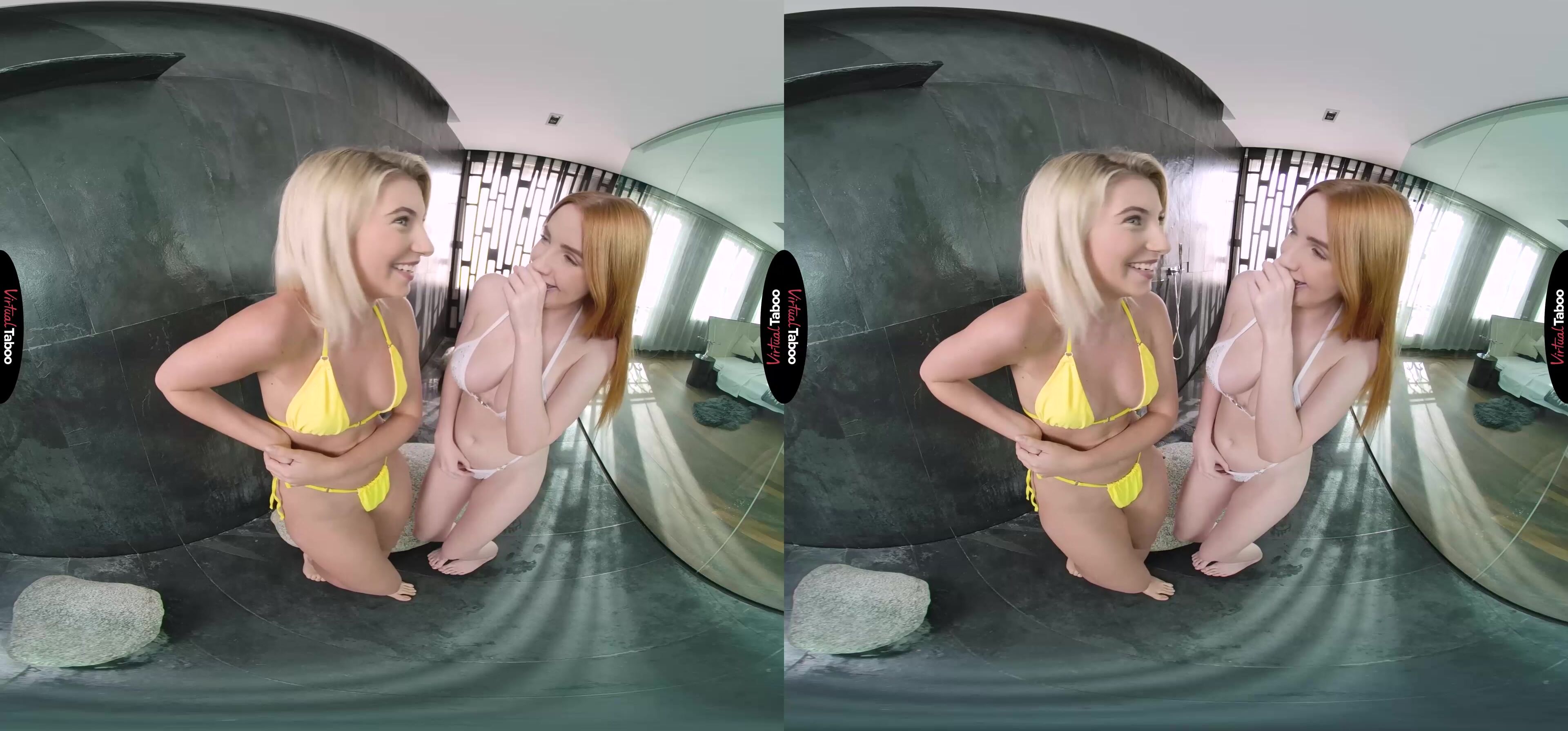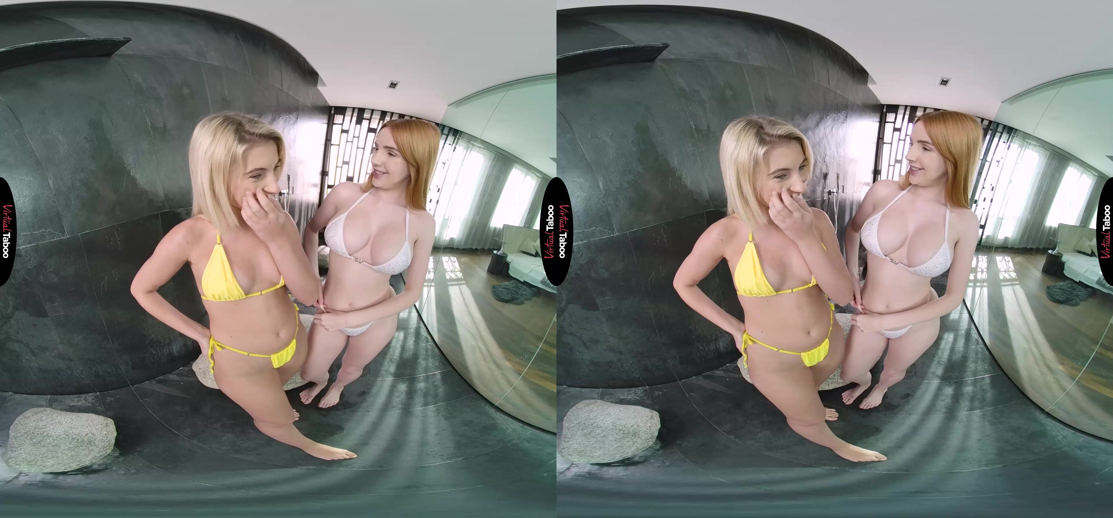 You have been married to Scarlett’s mom for a number of years. They haven’t all been happy ones. With her mother always jetting off somewhere for business, she hasn’t been the best mother or the most attentive wife. Scarlett has always appreciated how well you take care of them though. As she started college, she knew that it was your hard work that has helped pay for things. She has also noticed the way you have been looking at her pretty friend Lilly Bella when they hang around the house. Wanting to thank you for all of your hard work, Scarlett comes up with a great idea and is thrilled when she agrees. In this VR porn episode, you come home from the office and as usual, her mom is nowhere to be found, but you hear the shower running. Checking it out you find Scarlett and Lilly in their tiny bikinis kissing under the warm spray of the water. It’s OK, you don’t have to go. This is for you. As a thank you for all you do. I know you have always liked Lilly and I see you checking us out. So relax and enjoy the VR taboo show. Scarlett undresses her pretty blonde friend and then smiles at you when Lilly helps her take off her top to show off the big tits you have always tried not to notice. Getting back under the spray, the girls spread their legs and show you their tight, wet pussies. Don’t you want to fuck one? Or maybe both? Take out your cock, maybe you can. Who is going to be first? The tight blonde or your big-titted redheaded stepdaughter? Why not both? Can you hold off while they cum all over their fingers?