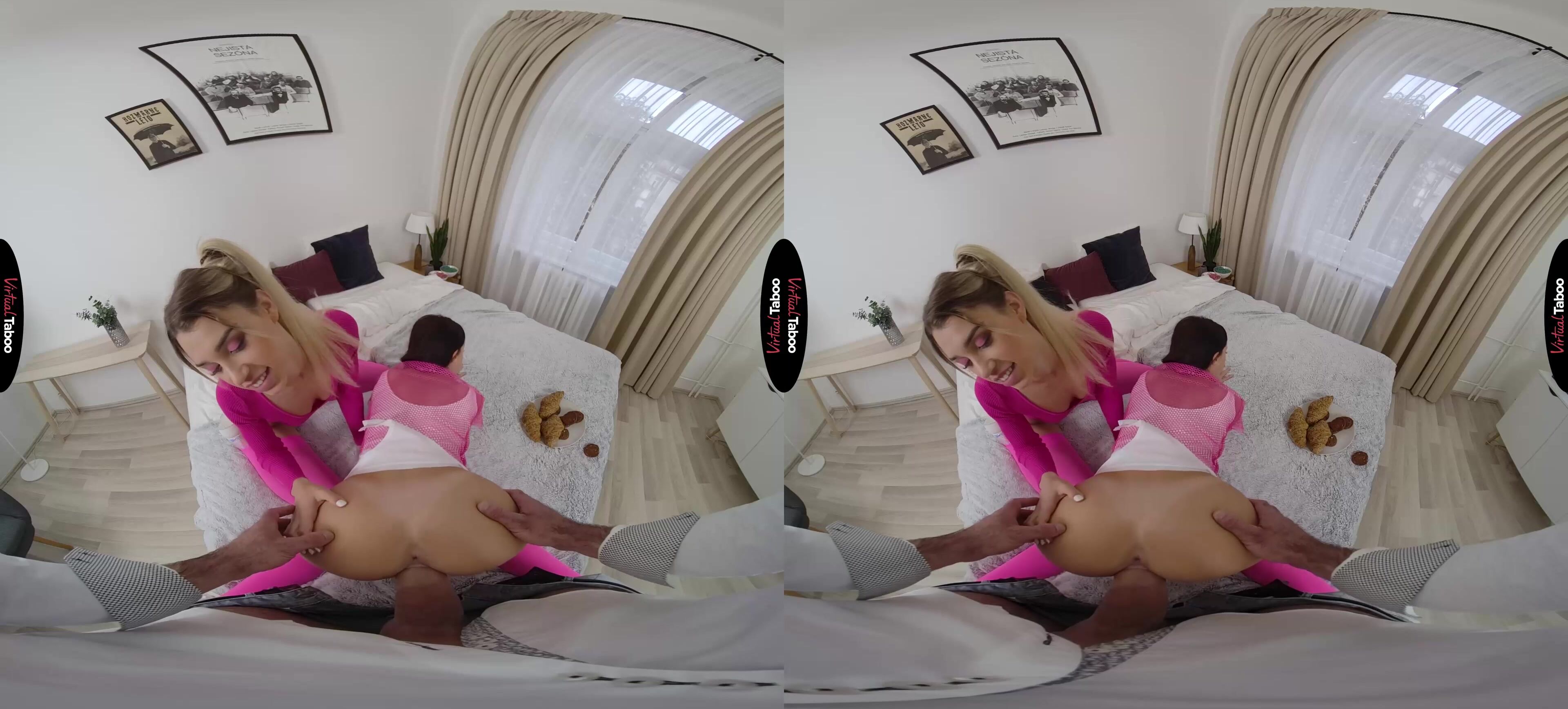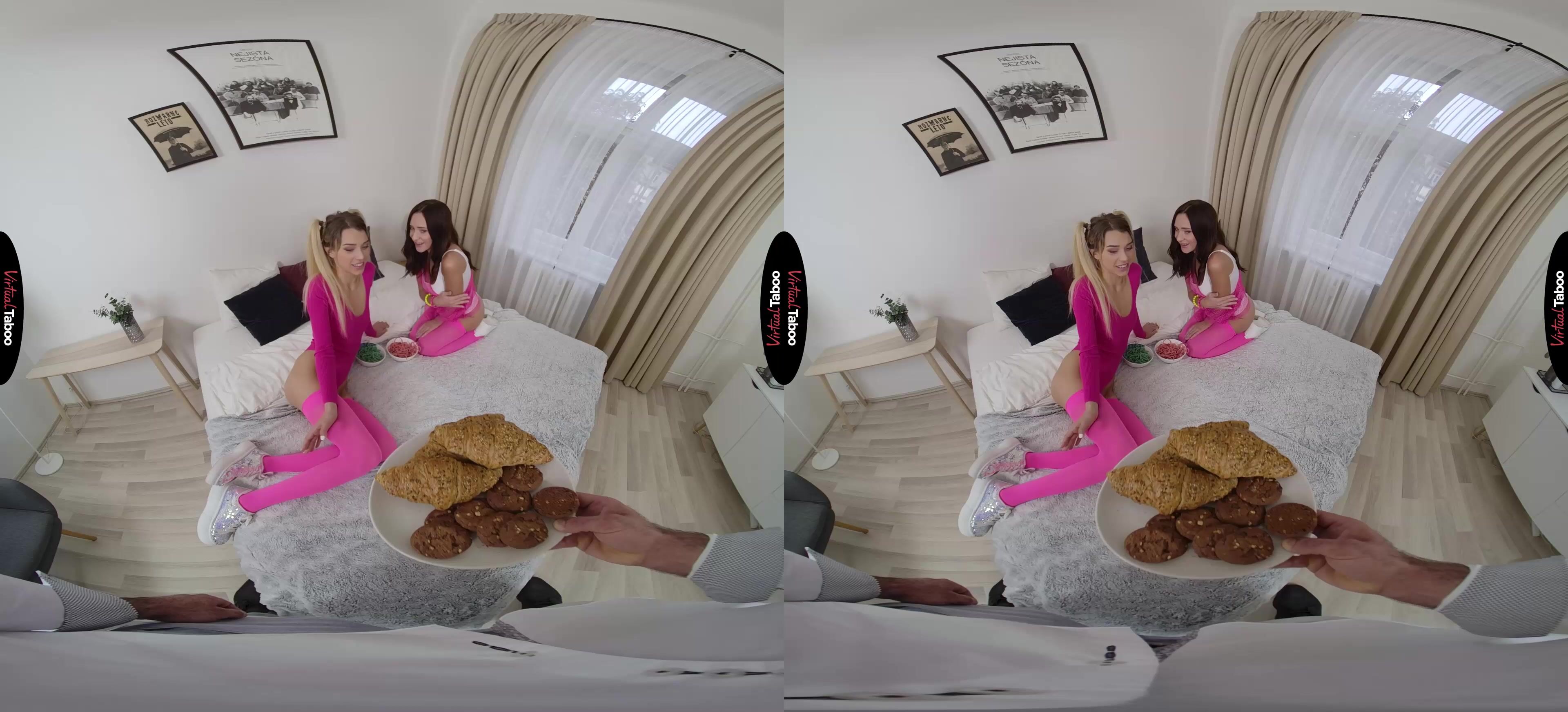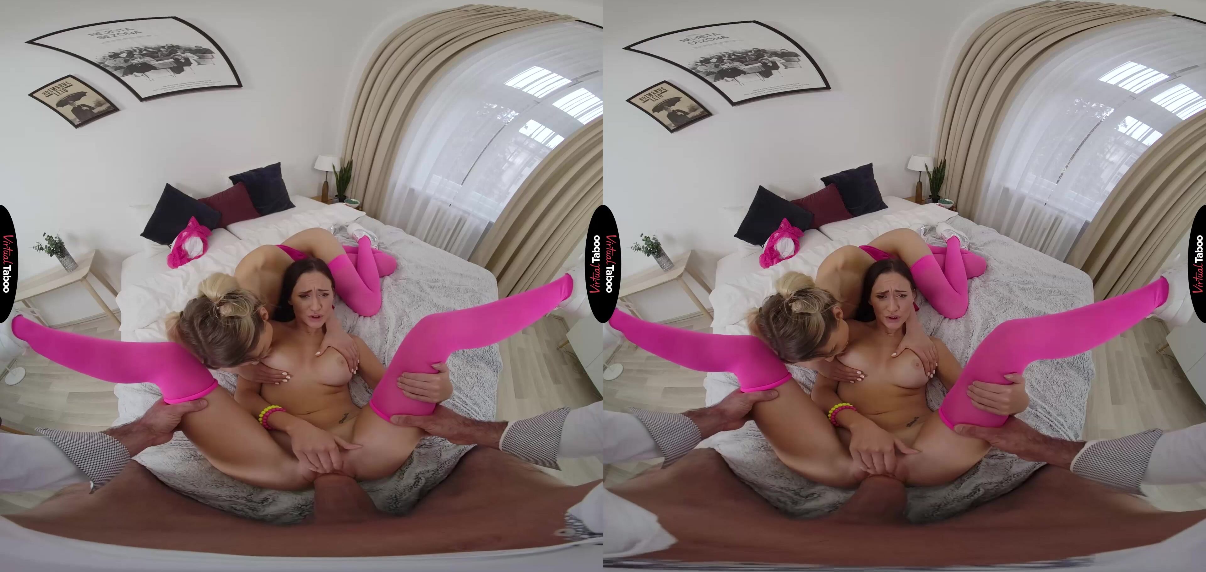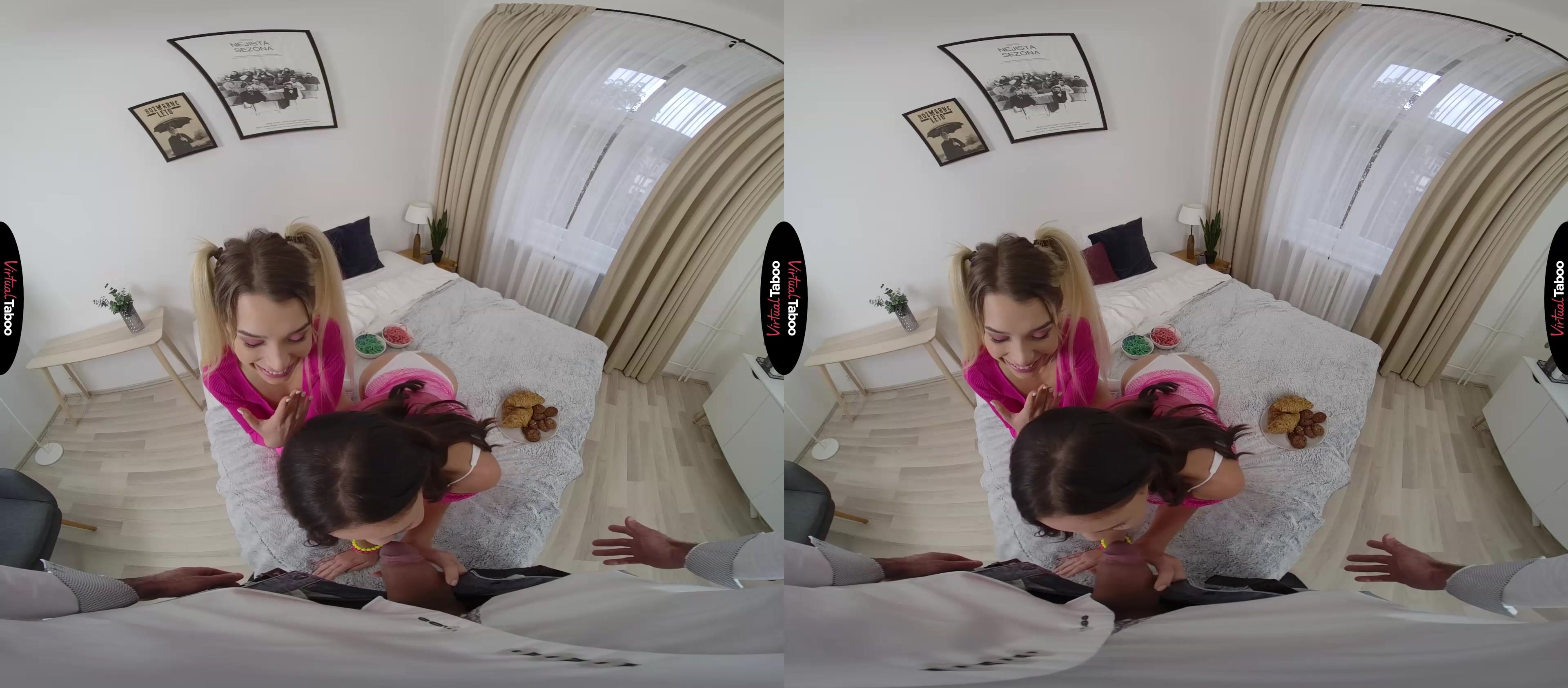 Elena Vedem has her best friend Mina Moreno staying at her house for a sleepover. They watch VR taboo movies, talk about the boys they like at their college and break out some sugary sweet treats. The long strands of candy stretch between their mouths as they playfully eat, getting closer and closer to one another. When their lips touch, the long-time friends can’t resist the urge to kiss for the first time. Their lips are soft and the sugar makes them even sweeter. In this VR porn video, they are enjoying their first kiss so much that neither of them hears when Elena’s stepfather enters the room with a plate of sandwiches he made for the girls. You burst in angrily and begin to chastise your stepdaughter, but Elena notices that your cock is hard and starts rubbing it through your jeans. You might be angry, but your dick is telling them that you are horny after what you saw. She takes your cock out and starts sucking it, assuring you that it is all right since they are both old enough and Elena isn’t your real daughter anyway. With that, you feel your pretty blonde stepdaughter’s tongue on your dick and just moan in reply. All of that kissing has Mina’s pussy wet when she turns around and begs you to put it inside of her. Watching your big cock penetrate her friend is hot, but Elena can’t wait to feel it for herself. It is bigger and better than she ever could have hoped for. The girls take turns and continue exploring one another while you bang their horny teenage holes. You blast their faces and as she licks cum from her best friend’s face, Elena knows she won’t have to share your cock with anyone else for much longer.