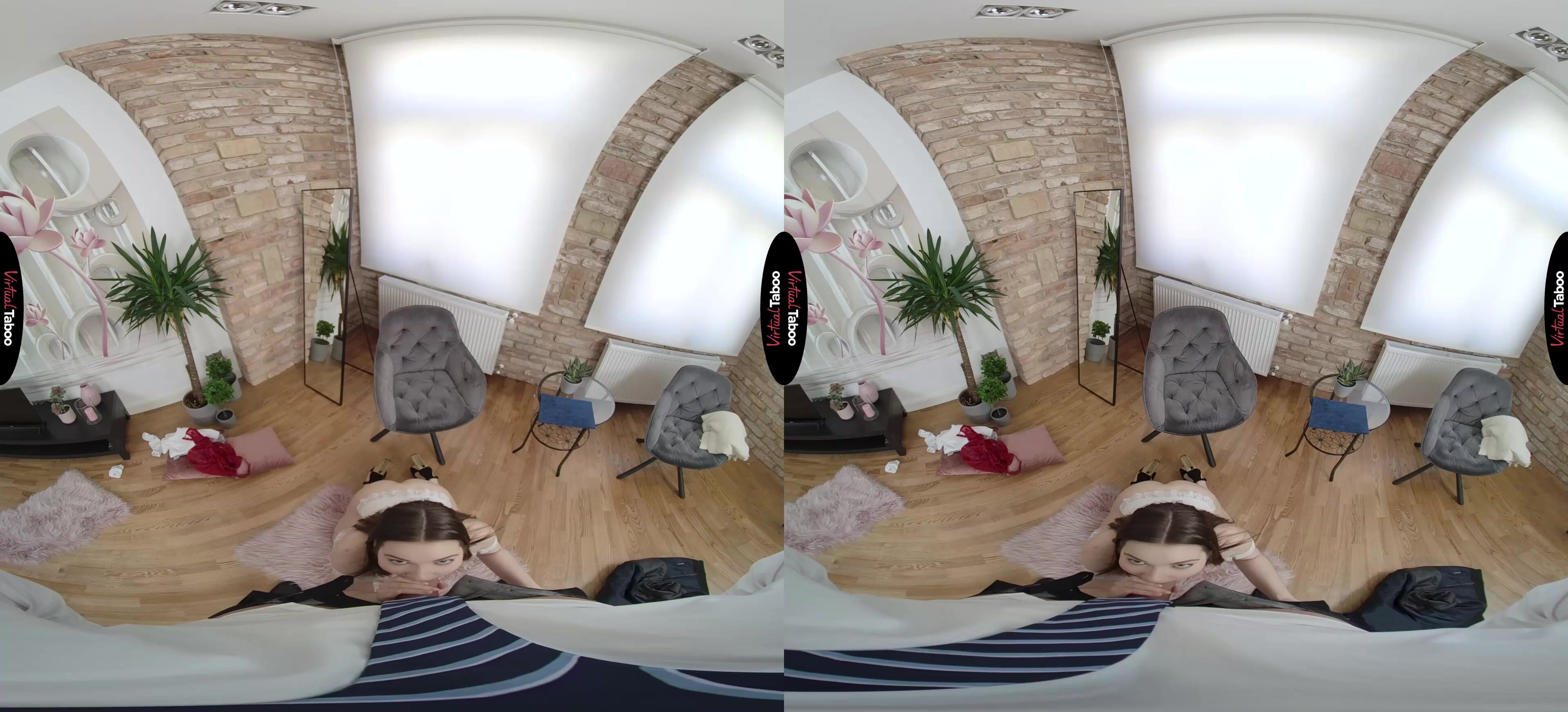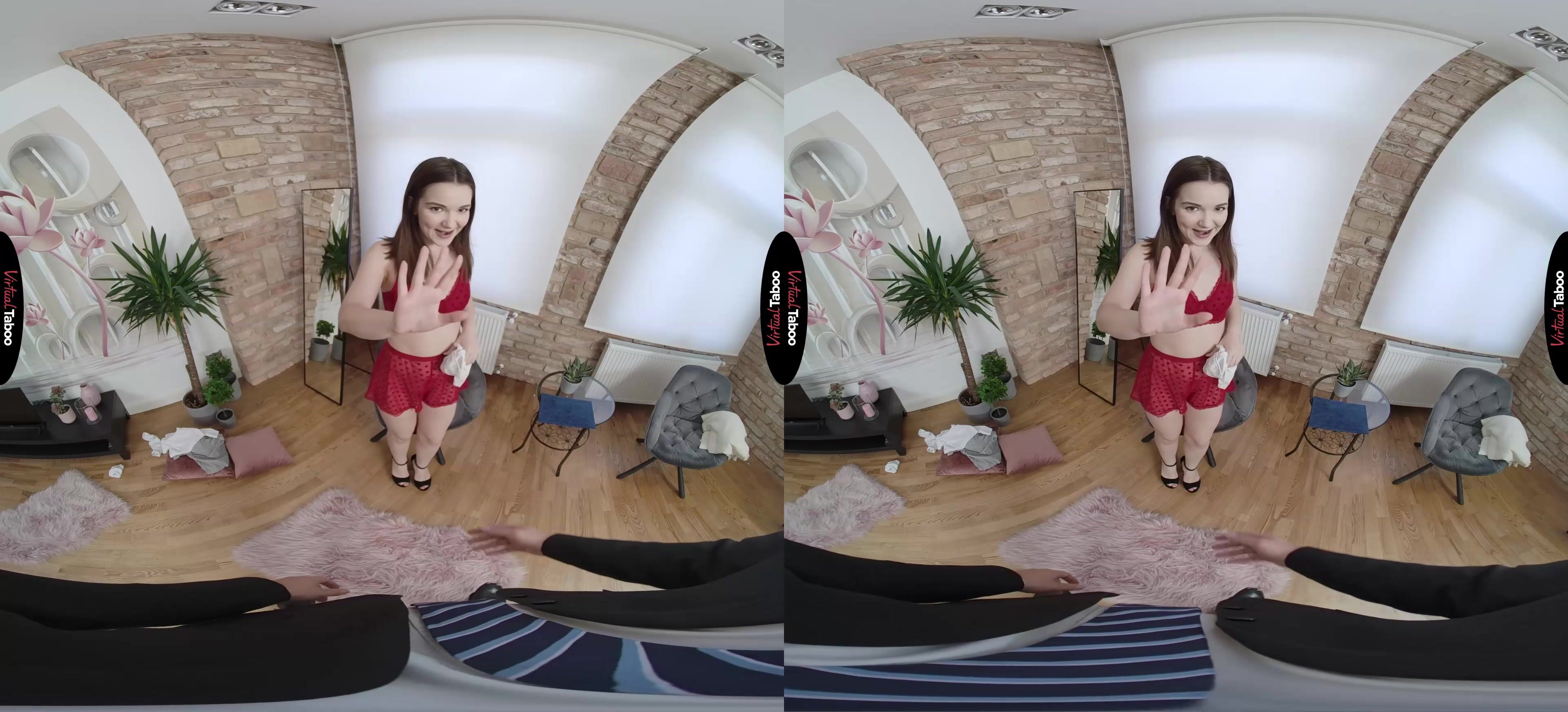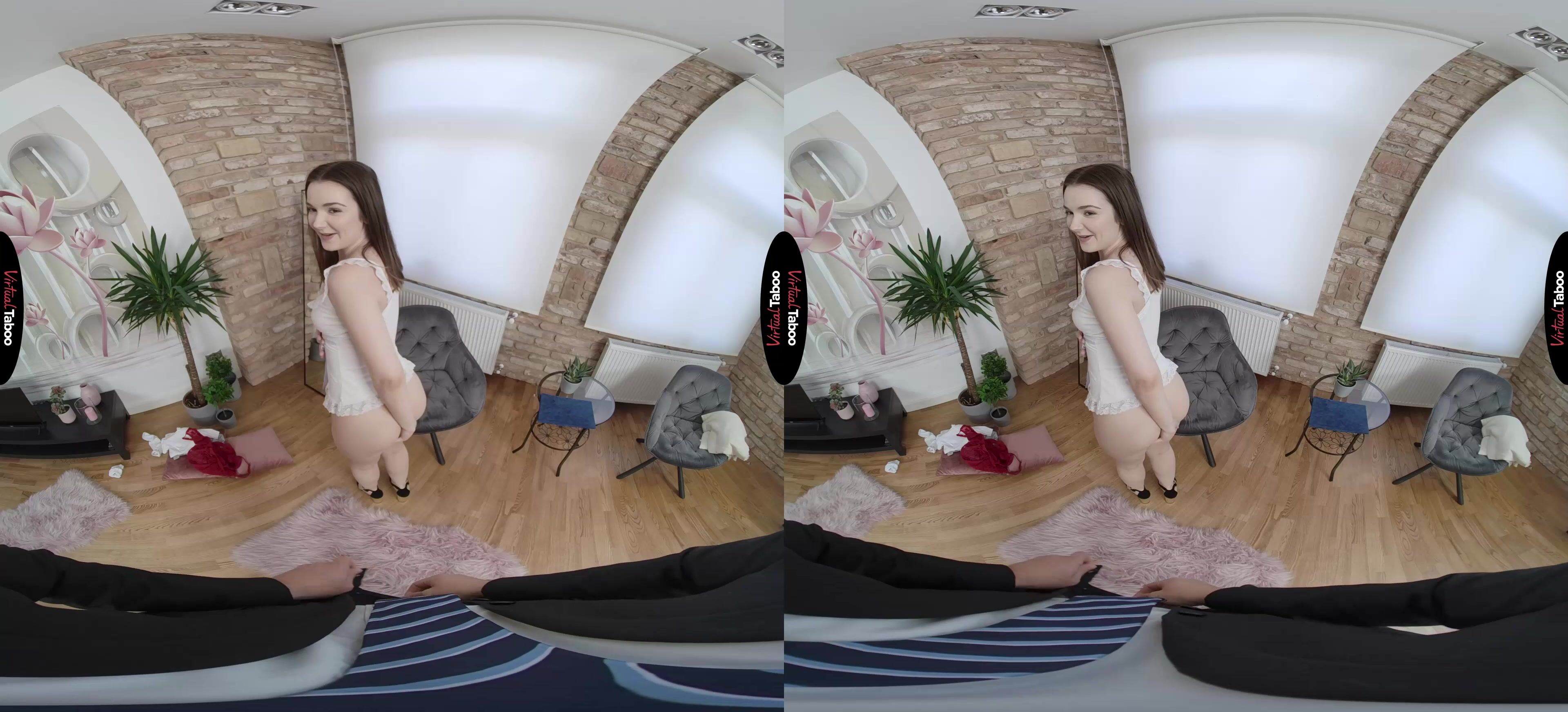 Returning home from college, young Simona Purr finds her stepfather waiting for her. He bought her a special gift and can't wait to give it to her. You brought her a couple of lovely and very expensive lingerie sets. Simona is embarrassed but she loves the gift and asks you to put it on. She tells you to close your eyes while she changes into the new lingerie. Unable to resist temptation, you peek at her as she slips out of her skirt and shirt. You know you shouldn't be looking, but can't help but get horny at the sight of your stepdaughter's lovely young body. Simona feels shy, but also notices that you are aroused by the sight of her in her new lingerie set. She checks out your pants and sees how something inside starts growing. Feeling daring, she reaches out and touches him through your pants. Taking it from your jeans, she sucks him slowly, feeling it throb on her tongue. Her pussy is wet and dying to be fucked. Simona needs to feel stepdad's cock inside of her. Watch the High Definition Virtual Reality as Simona learns about fucking from her stepfather. You spin her around and fuck her from behind. It doesn’t matter how wrong it is, her pussy feels too good and she is thrilled to be riding your experienced meat. She can't believe that she finally gets to feel your big cock in her tight pussy. She rides you and cum over and over, hoping to milk a load from you, but you don't want any accidents. You pull out and Simona strokes your cock into her mouth, purring and begging for you to feed her. You hold out as long as you can before exploding into her mouth and watching as your stepdaughter milks out every last drop. Simona wants you to keep their fucking a secret, but also can't wait to do it again.