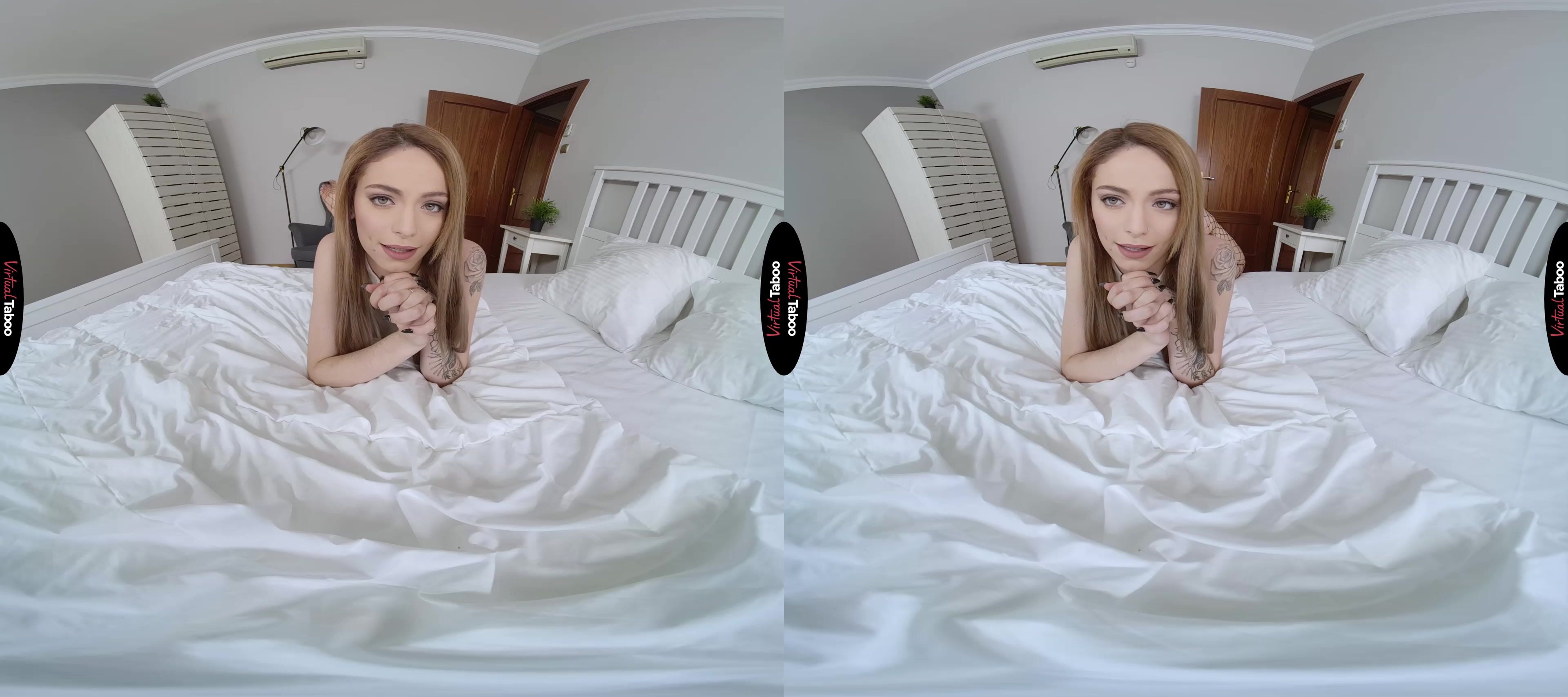 Pretty coed Clara Mia has never had any trouble finding guys to date. She is good looking and has a reputation at her college for loving sex. Still, she is feeling a little bored and a lot horny just hanging out at home. She could easily call up one of her regular fuckboys or hit a VR porn dating app for a quick hookup, but today she has something different in mind. Today she wants to get some dick without leaving the house. Slipping into a pair of fishnet stockings she marches into her stepbrother’s room. As she expected, he has his VR headset on, probably watching taboo porn. You try to hide what you are doing, but she flops down on your bed and wiggles her exposed ass. She tells you that she knows you masturbate in here thinking about her and if you will just admit it, she is willing to let you do it with her right in the same room. Before you can even think, she spreads her legs and sticks her feet in your face. You aren't about to say no to such a fantastic opportunity and pull your hard dick out of your pants. Impressed by what she sees, Clara instructs you to pump while she plays with herself. She is as pretty as any of the girls you get off to with your VR headset and she can see the desire in every throb of your cock. Sliding her fingers inside she starts to moan along with you, begging to see you shoot your load. It is every bit as hot as she hoped and her fingers push her over the edge. You loved the show, but ask if you can fuck next time.