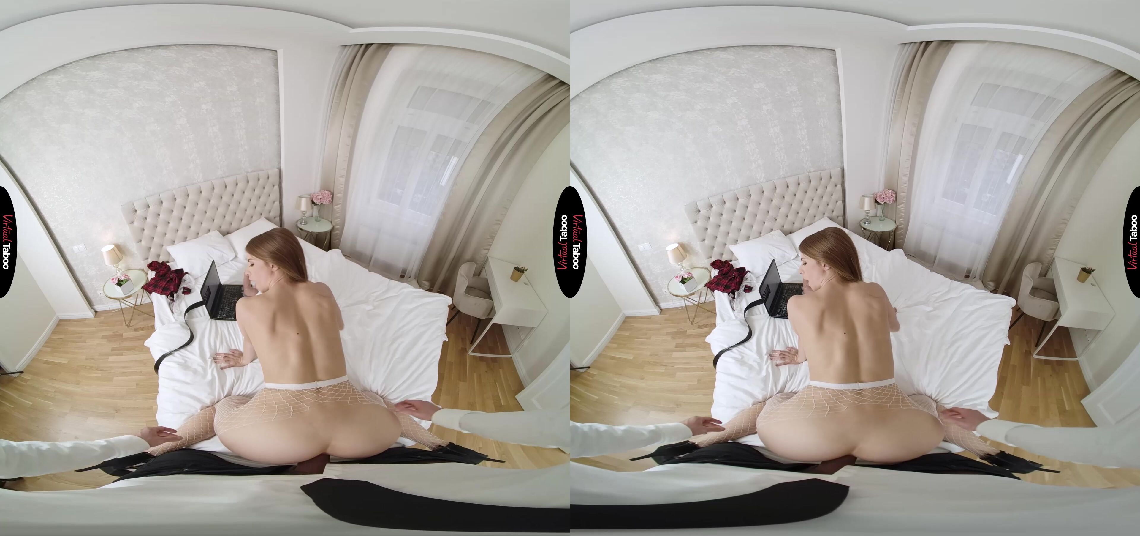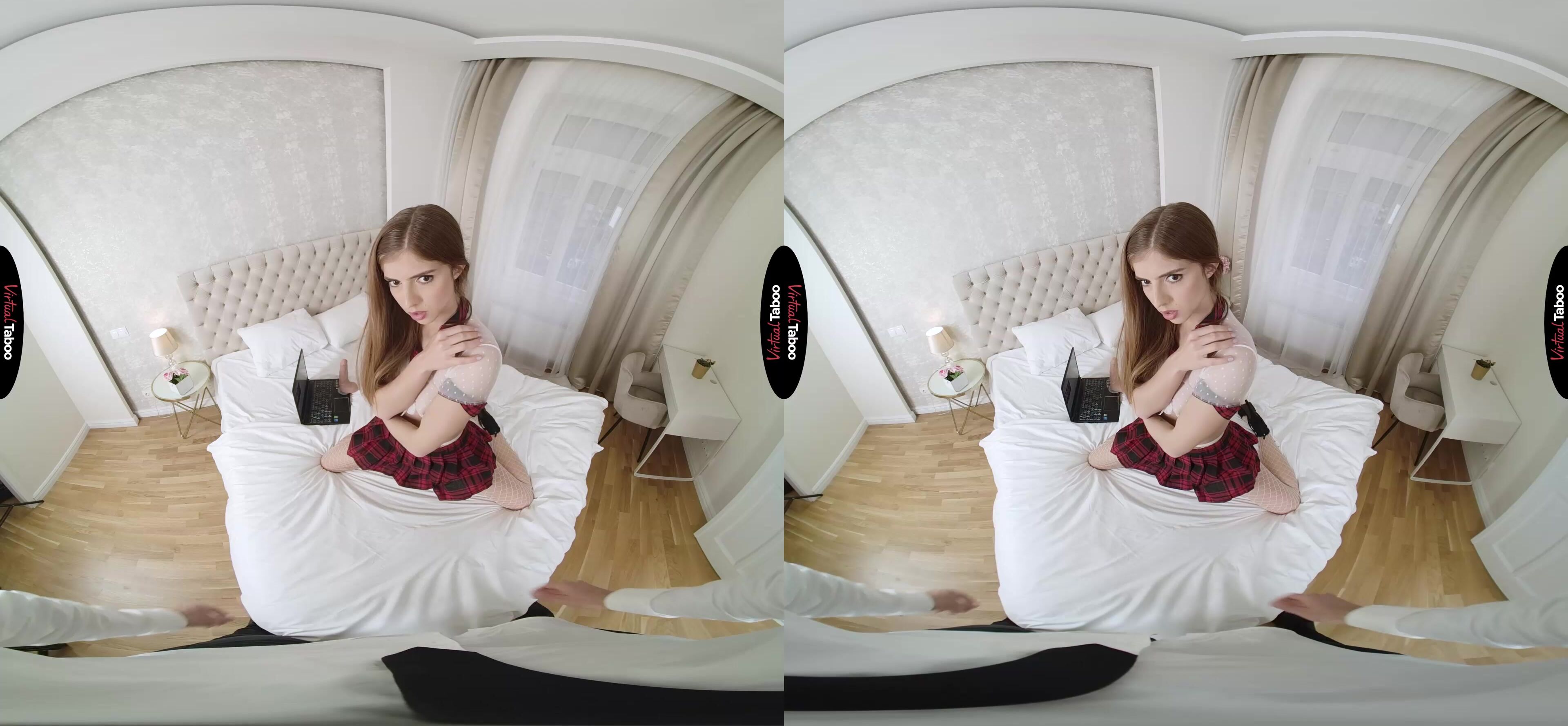 Emelie Crystal works hard to get good grades in college. It hasn’t always been easy balancing her class load with a regular work schedule. Fortunately, she discovered a VR porn cam service that allows her to make good money, set her own hours and still have plenty of time for her studies. She has kept her new job a secret from her overbearing mother and her new stepfather. They would never understand, but she isn’t about to stop. The money is good and she loves the thought of hundreds of strangers each night looking at her naked and bossing her around. Her favourite thing to do is dress up in a naughty schoolgirl outfit and play with her big toy. Right in the middle of a very steamy VR porn show, her stepfather walks in and watches for a few moments as she pushes the big toy deep into her sweet mouth. By the time she notices you, your cock is throbbing hard and you have pulled it out of your pants. Worried she might be in trouble, Emelie is relieved to see that your cock likes the show enough to ignore how wrong it is and let her do to you what she was doing to the dildo. Your big dick fits nicely into her mouth and slides down her throat so quickly that she forgets to turn the camera off. Her viewers get a chance to see her stepfather pounding her pussy from behind like a close-up VR Porn scene comes to life. Watching the tips come in, Emelie screams “fuck me daddy” for all of her horny viewers. She gets more than she planned for when the words excite you too much and you shoot your load deep inside of her. She can’t wait for a second show.