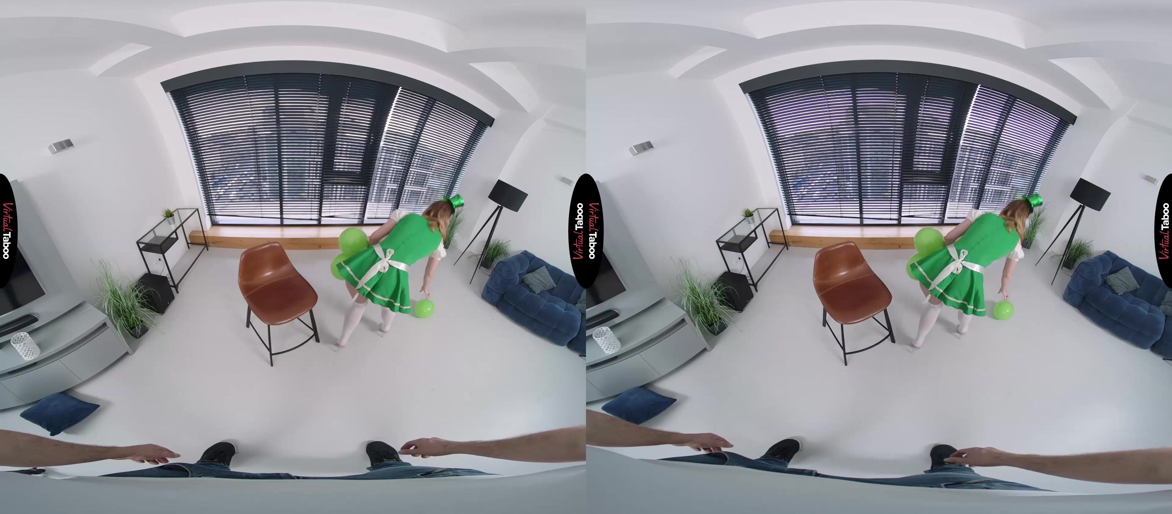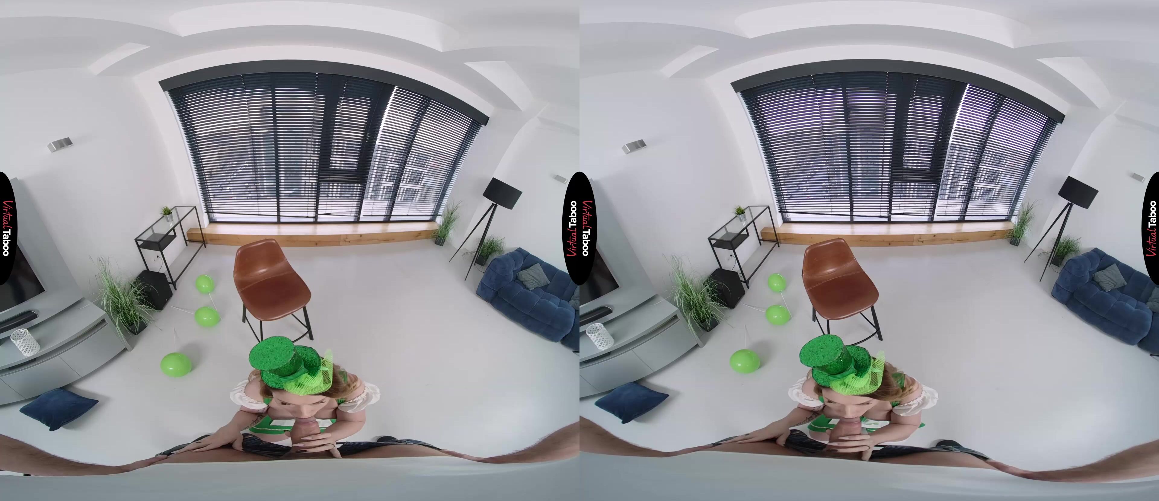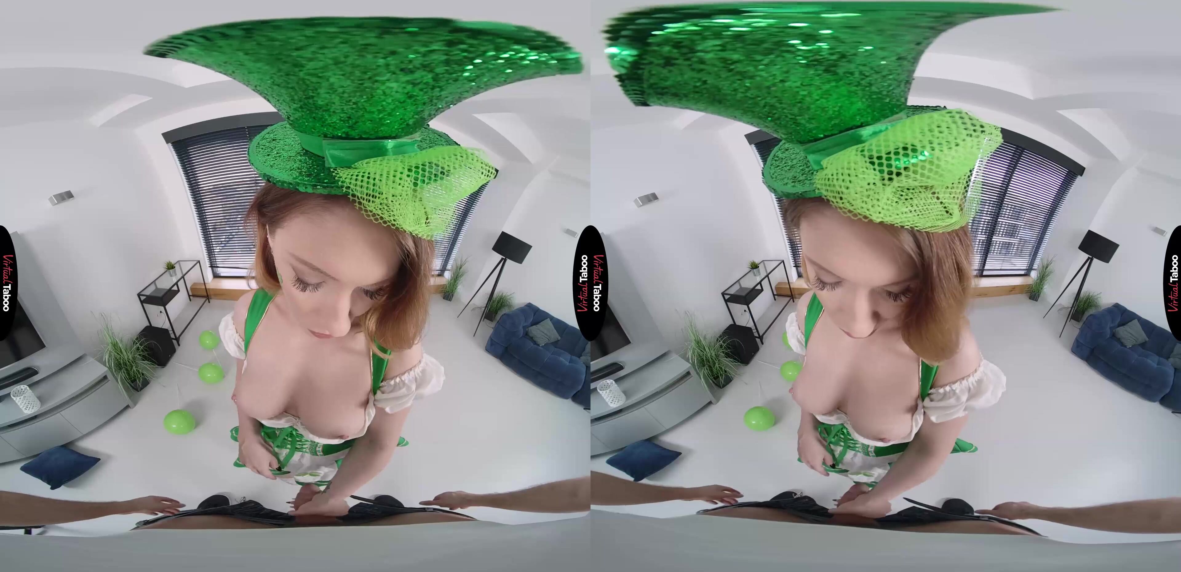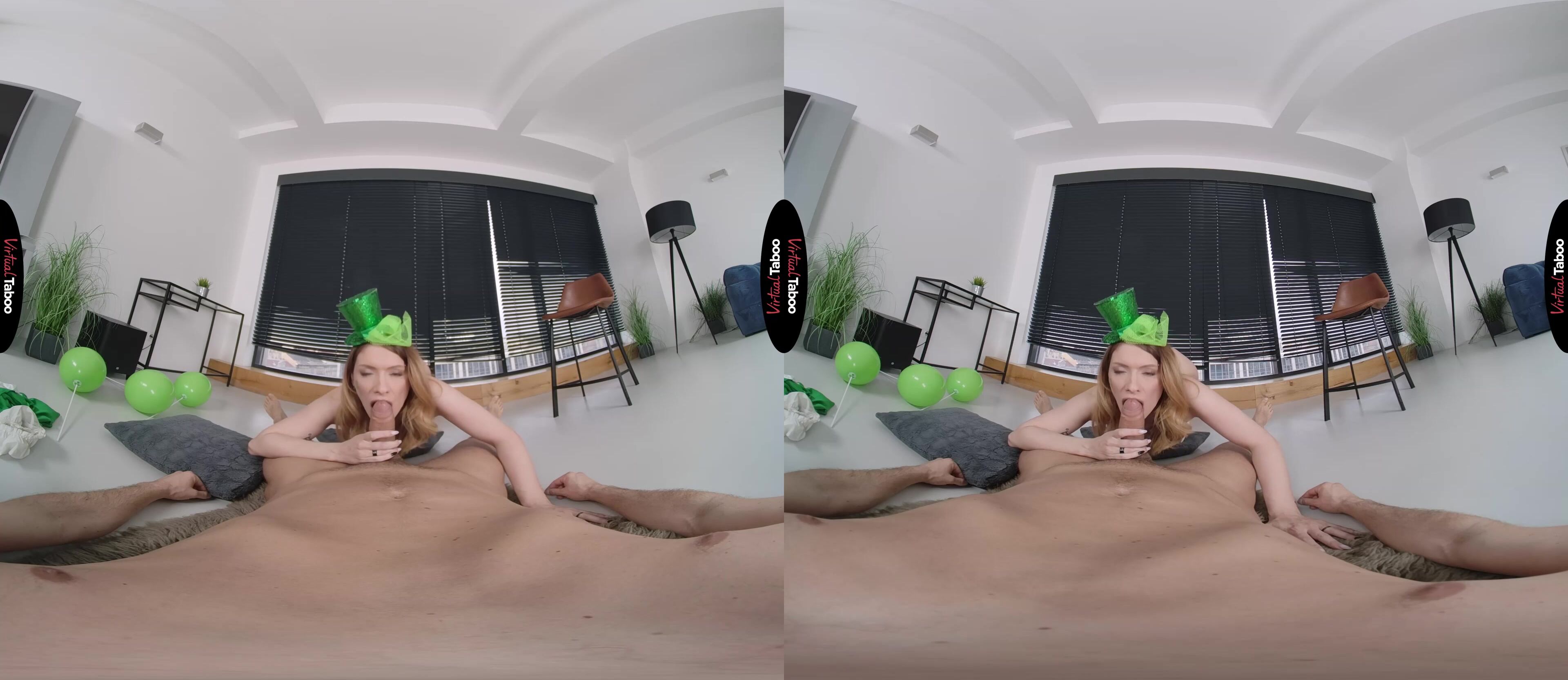 It’s St. Patrick’s Day and this year Sata Jones plans to go all out for the celebration. After two years of staying home, she has a big night planned with her friends. She also has her eyes on a special guy and wants to make sure that her outfit is going to catch his eye. When she is all dressed up and ready to go, Sata tries to get her stepbrother to come along. At first, you resist, so she decides to give you some incentive. In this VR porn scene, she bends over and shows you that she isn’t wearing any panties. This gets your attention, but also leads to something she didn’t expect. Your cock is rock hard and way bigger than she ever imagined. It seems the sight of her naked pussy has you interested in acting on the slutty step sister fantasies you have jerked off to with your VR headset. Looking at your big dick, Sata decides that staying home seems like a pretty great idea. Why bother leaving the house when she has such a big hard cock ready for her at home? She gets on her knees and you show no objection as she slides her lips over the head of your dick and down the throbbing shaft. Sata wanted to get laid tonight and there is no way they are going to make the party so she bends over and lifts her skirt. Your cock hits all the right spots as you fuck her better than any of the guys she has been dating. She gets so excited and caught up in her own orgasm that she forgets to tell you to pull out. They hope their luck doesn't run out so they can have many more fun nights together.