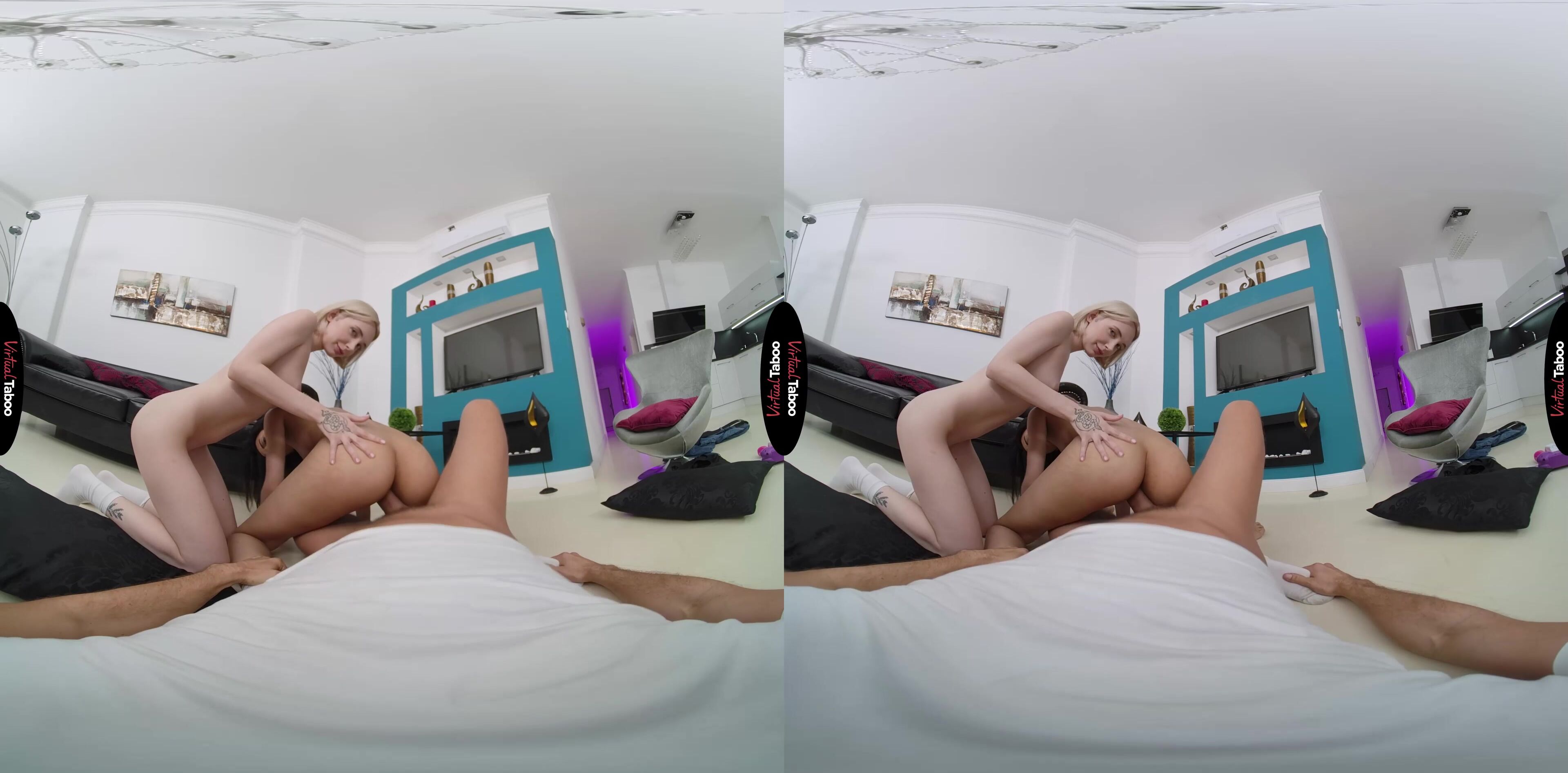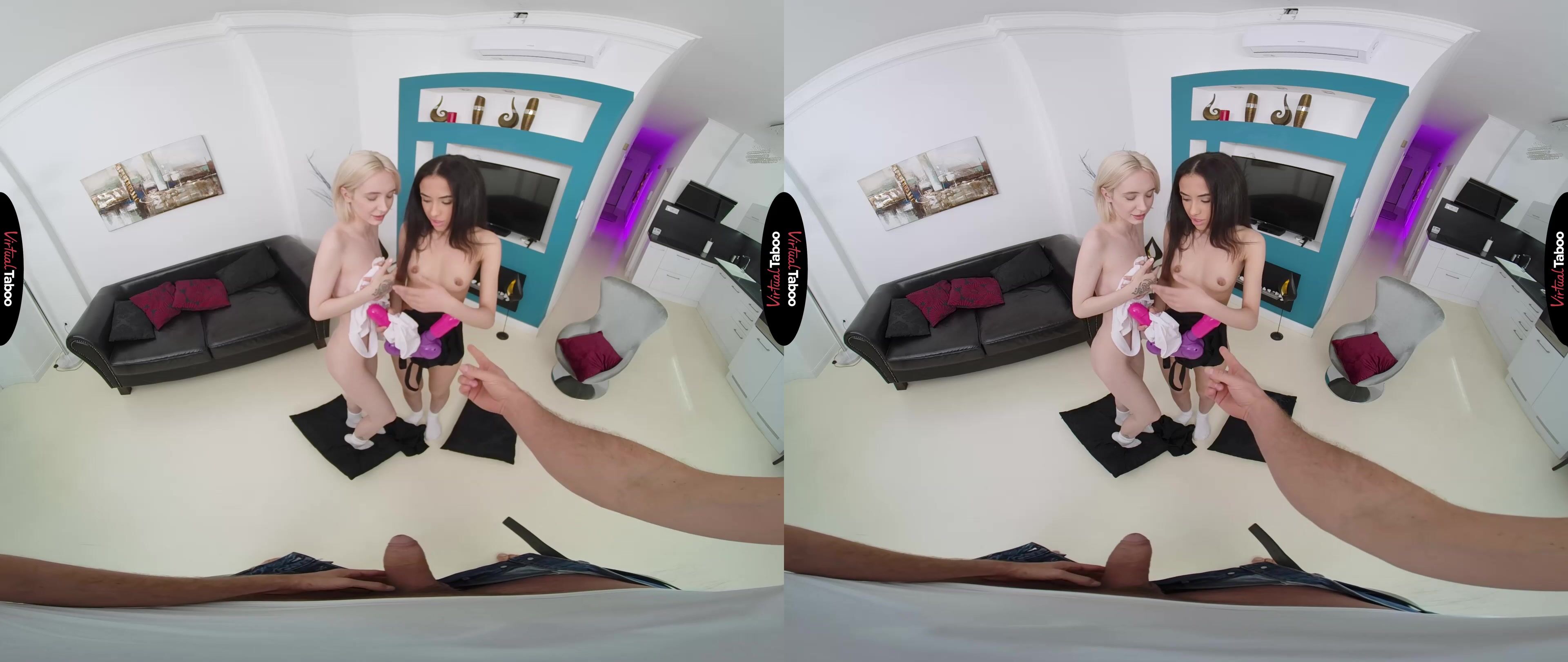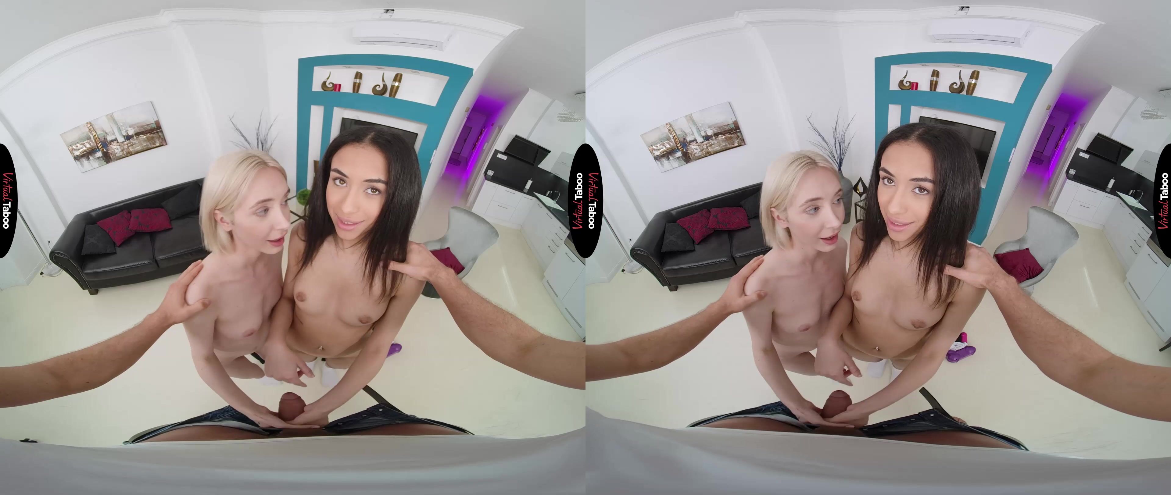Mia Delphy and her best friend Tasha Lustn have been having a great time at college. After being shy and quiet growing up, they are enjoying being around new, hot guys at parties every weekend. The only problem is that neither of them has much sexual experience. Mia buys a special sex toy that she saw in a VR porn movie. It is designed to train women how to please men and enjoy themselves. The trouble begins when they try to use it. Since neither of them has any experience with actual dicks, they are clueless about the confusing sex toy. They tug on it too hard with very little success. Just about to give up, they notice Tasha’s stepbrother staring at them. They assumed they were home alone and had not counted on you being home watching VR Porn during their little experiment. Deciding to waste a perfect opportunity to get the practice they crave, the girls flash their tits at you and ask if you will help them gain some experience with the real thing. You happily agree, whipping out a cock that makes your stepsister and her sexy friend gasp. They put their warm tongues on your meat and you give them tips on how to open wide to take the head to the back of their throats. You offer to let them ride you and Tasha is the first one to say yes. She doesn’t care if you are her stepbrother. She just wants that dick inside of her pussy. After watching her friend cum, Mia wants her turn and bounces up and down like a greedy slut. Your dick makes them happy, but the girls also learn to use their tongues on another to keep things hot and heavy. You fuck them for as long as you can before feeding them a bit load of cream. Any time they want more practice, your dick is available.