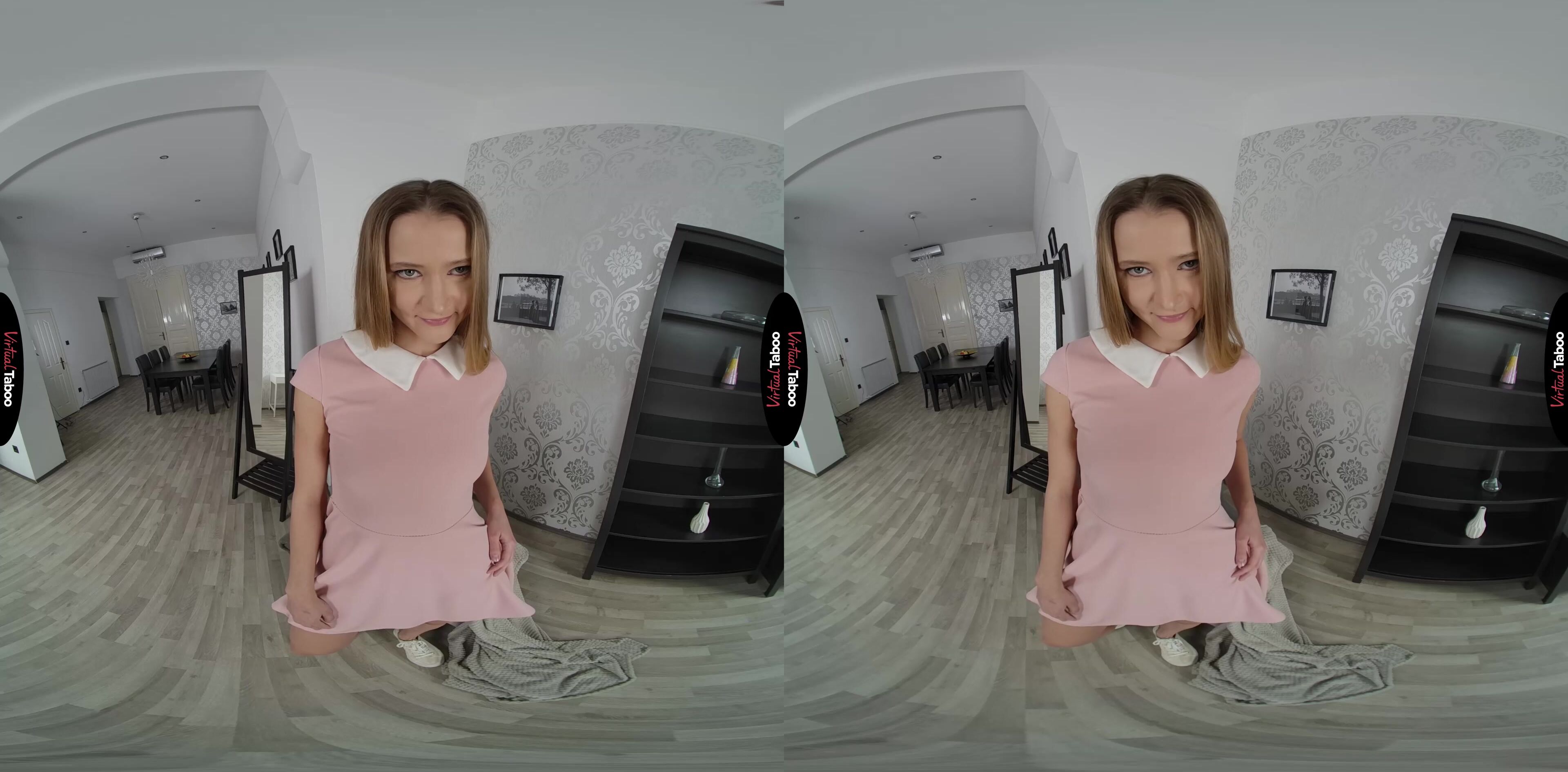 Adorable teen Ivi Rein is very excited. She has had a crush on a guy from college for years and he finally asked her out. Her mother helped her pick out a new dress for the occasion and she is just dying to try it on. Mom is gone, but Ivi decides to show off the dress for her stepfather. She goes into his room where he was just about to settle in for an evening of VR Porn by himself and asks for his opinion on her new outfit. You were already a little turned on by the thought of some hot VR taboo smut and she notices the bulge in your pants while you compliment her and assure her date will love the dress. Hoping to rush her out so you could finish what you started, you get frustrated and turned on as she lifts the dress up to tease you with a view of her legs and cute ass. Feeling bold and a little naughty, she lets the dress ride up a little too high to show you that she isn’t wearing any panties. Knowing she has your full attention, Ivi strips the dress off and enjoys the lustful look in her stepfather’s eyes. She asks you if you think her date will like her this way as well. You had no words, but rub your throbbing dick through your pants in response. She wonders how long it has been since you have been laid and asks if she can watch you play with your dick. You agree and the sight is so hot that Ivi just has to join you and play with her wet pussy. As she sees you shoot your load on the floor, she cums hard on her fingers and wonders how soon she can get home from her date and fuck daddy properly.