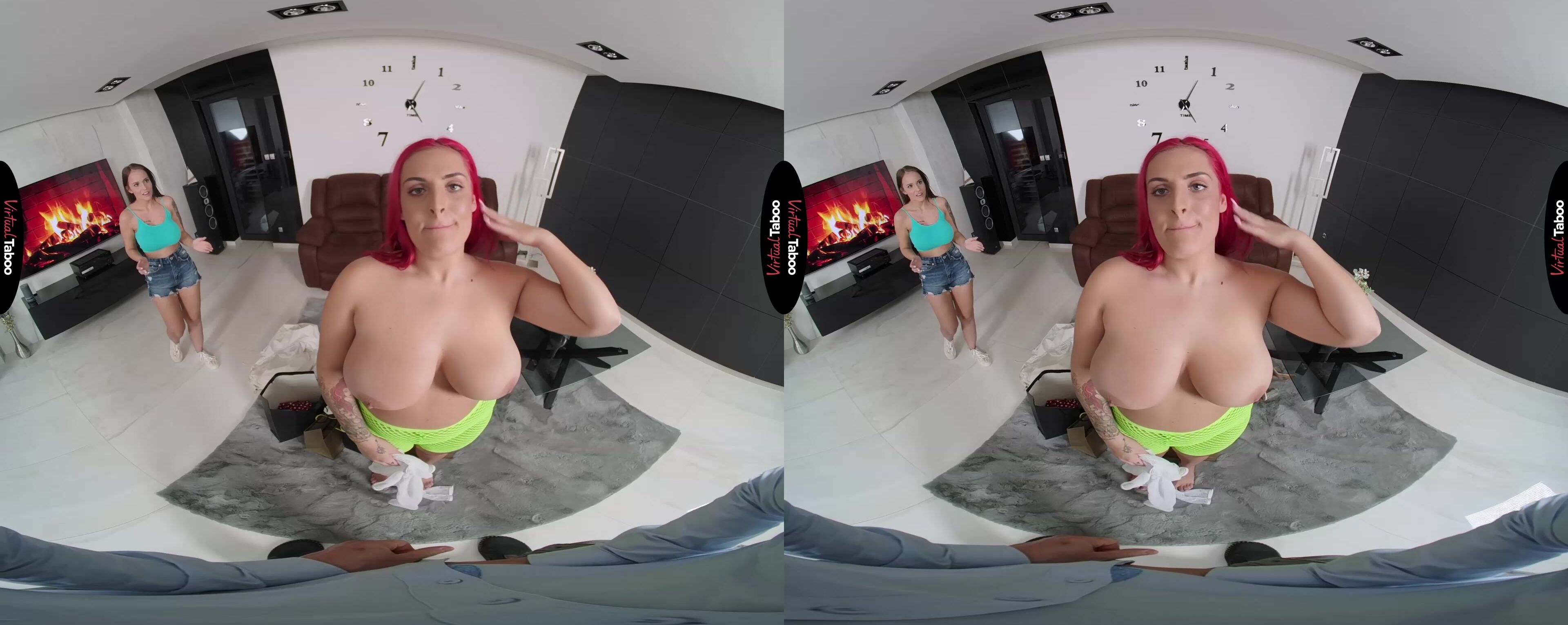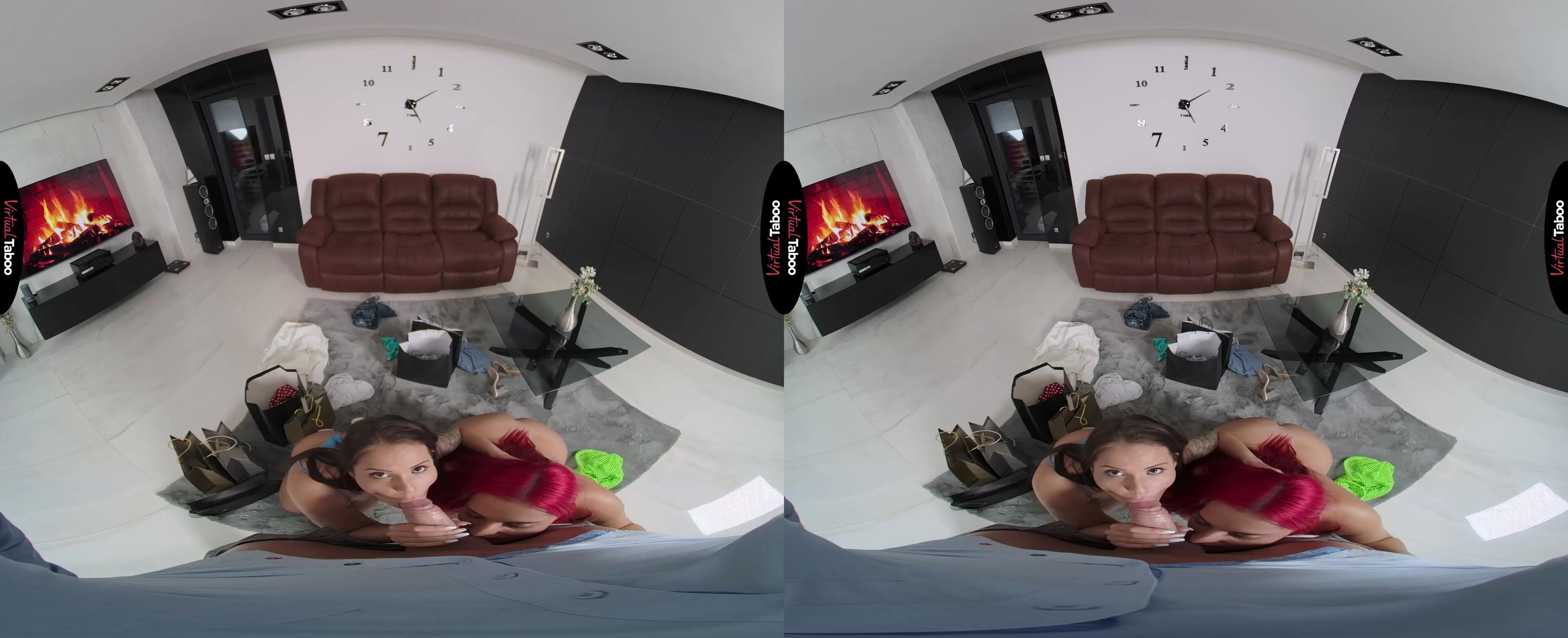 Olivia Stark is excited after a day of shopping. Her lover’s wife is out of town for a week and he gave her the credit card to buy some sexy outfits to keep them busy in bed. She tries to show you some of what she bought, but you can’t take your eyes off of her huge ass. You have seen enough and take out your cock to show her how throbbing hard her massive cheeks have made you. As Olivia prepares to put it in her mouth, your stepdaughter Jennifer Mendez comes home unexpectedly. Seeing an opportunity, she tells you that she won't tell mother as long as you let her take a shopping trip, and let her join in this VR fun. You aren't about to say no to that, especially when she pulls out her titties and shows you that they are nearly as big as your curvy girlfriend’s. If four big breasts are better than two, then certainly two hungry mouths are better than one. Olivia gets it wet and warmed up before passing it to Jennifer. She sucks it hungrily, loving the naughty feel of tasting her stepfather’s big dick. Since you have been lusting after your girlfriend’s big ass all day, Olivia gets the first ride, dropping her hips and slamming her body against you while Jennifer watches with a big smile on her pretty face. She helps you slip your dick into that giant ass knowing that mom never lets you do that. It looks so good that she asks you to pop her anal cherry as in the best VR porn movies. You thoroughly enjoy both women in every hole before exploding all over Olivia and watching Jennifer lick up every drop. They have both earned another shopping spree.
