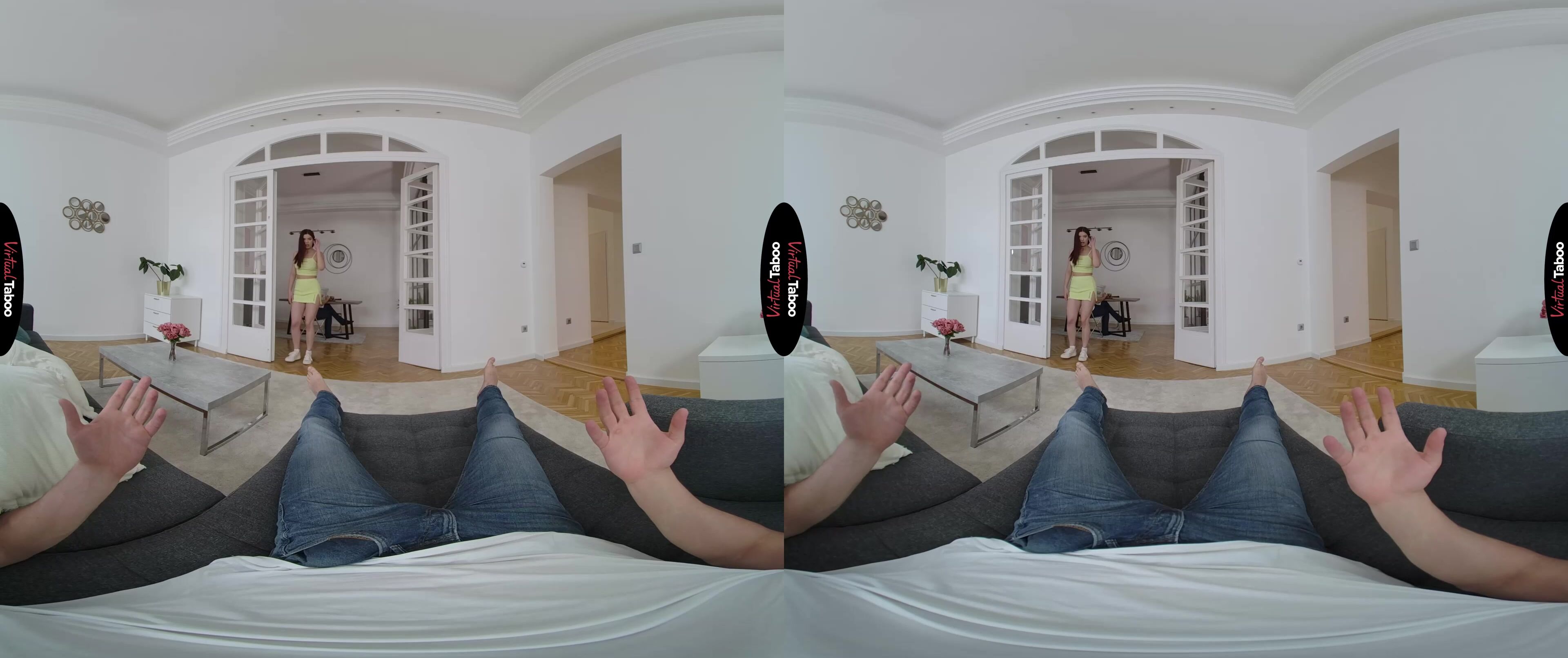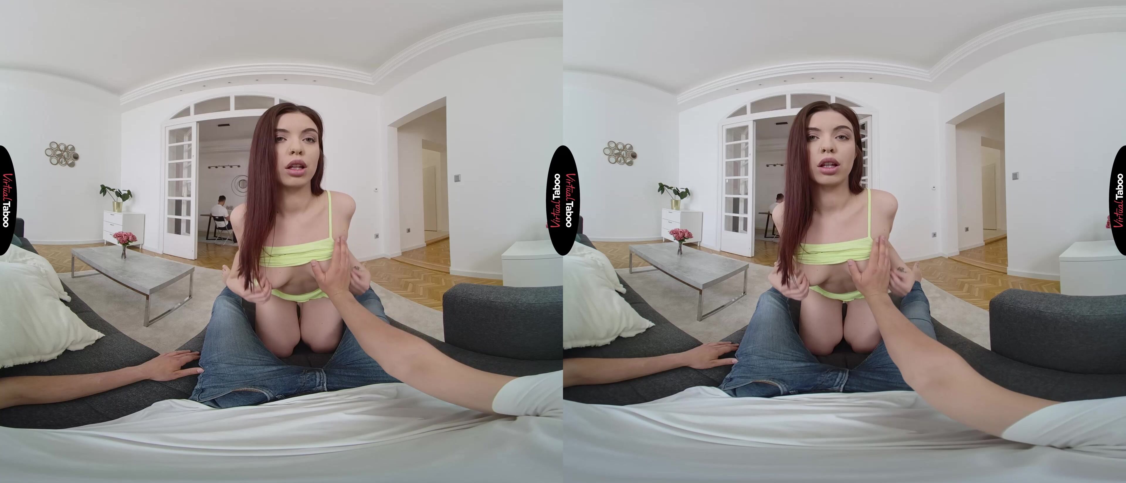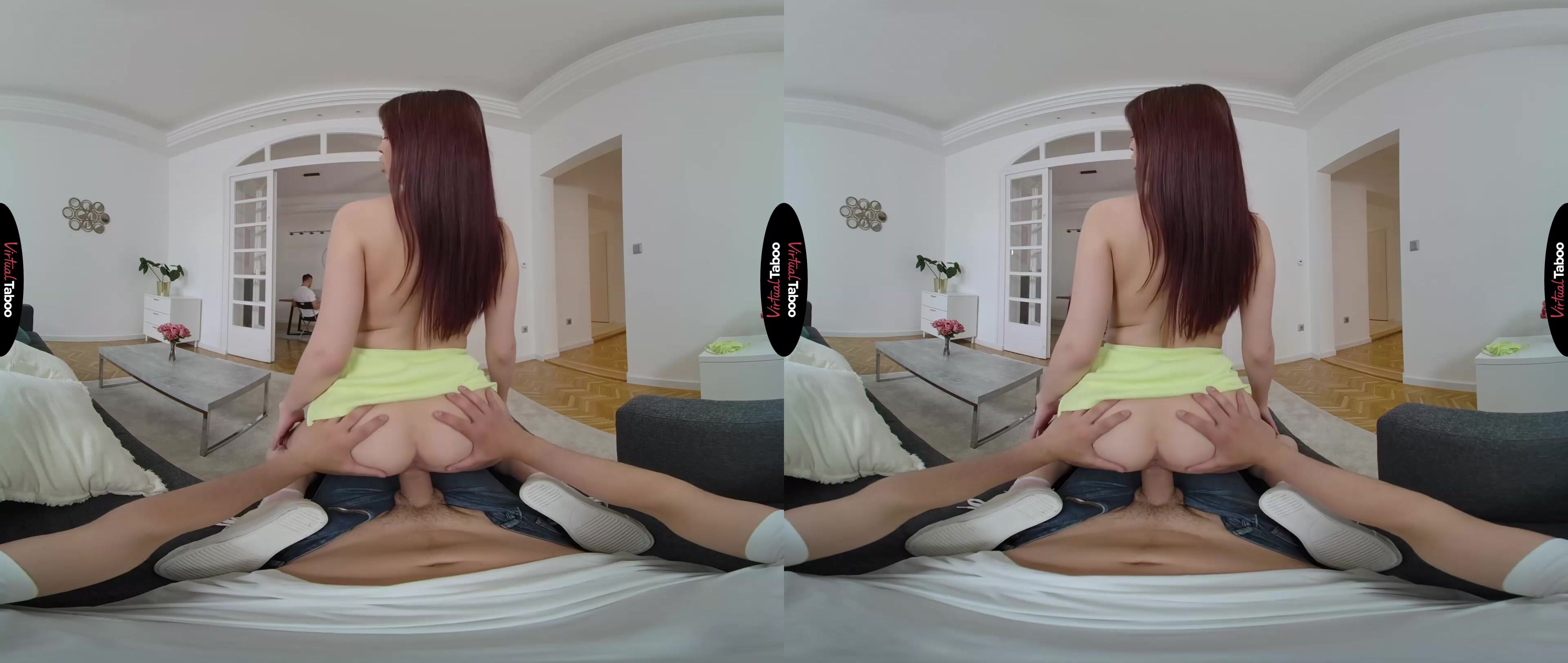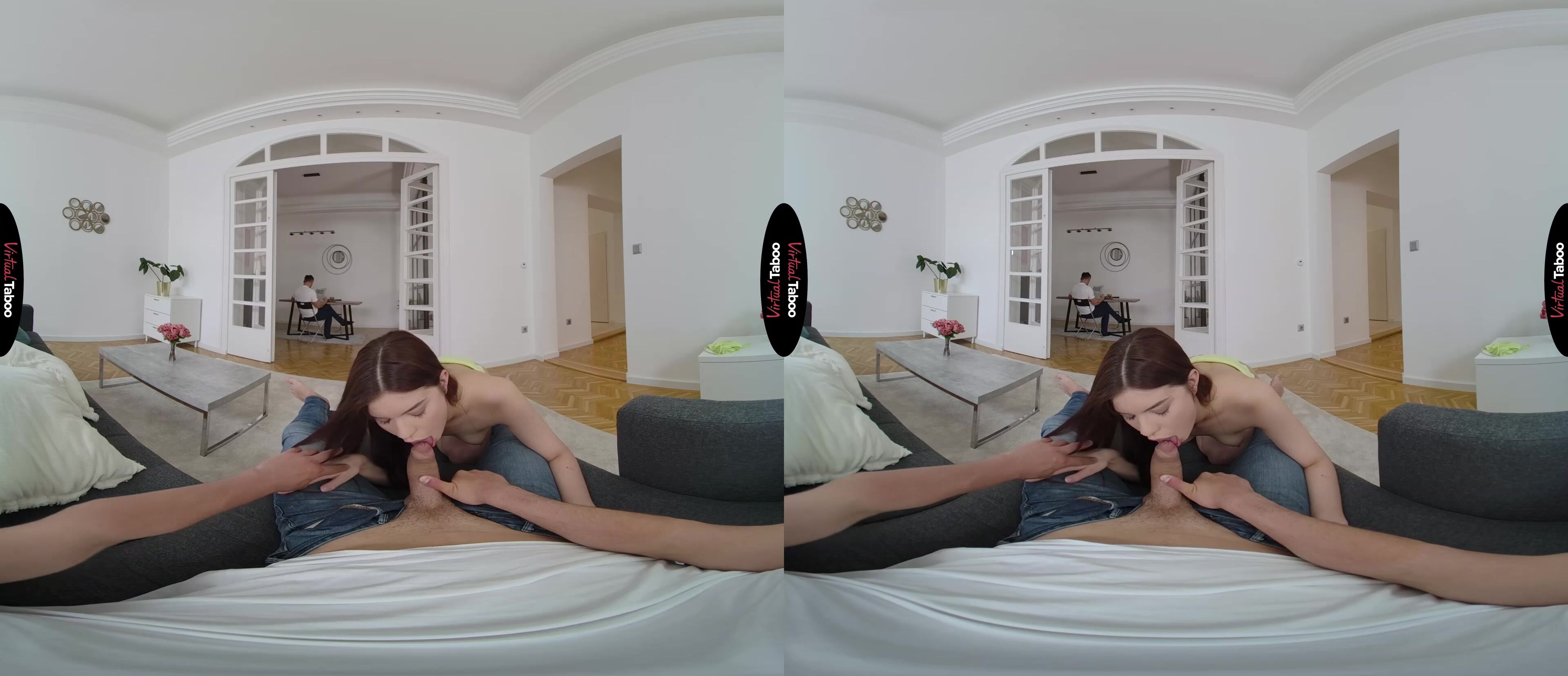 Emily Mayers is all alone with her stepfather and stepbrother for the weekend. Her mom is off on a business trip and the pretty teen has special plans. She has seen the way her stepfather looks at her and has caught her stepbrother jerking off to sister themed VR porn more than once. While serving her stepfather breakfast, Emily sees you checking her out and starts to tease you by revealing that she isn’t wearing any panties. You are shocked by the brazen display but does not turn away as she moves in closer and gives you a perfect view of her tight young twat. She watches your bulge grow in your jeans and knows that she has you. Even with father just feet away, you can’t resist when she takes your cock out and puts it into her mouth. Thinking you might just cum quickly in her mouth, you are shocked when she strips and mounts your dick. In this VR porn scene, you have to stay quiet with father so close, but you can’t stop once you feel that silky smooth slit on your stiff sword. She takes every inch from behind, knowing you have dreamed of this a million times and loving how hard she makes your meat. As she feels your body shaking and your climax approaching, Emily moves to her knees and sucks as hard as she can. Staying as quiet as you can, your load explodes all over her pretty face. Just at that moment, her stepfather turns around and catches you. Emily runs away embarrassed, but she knows who is next and she can’t wait.