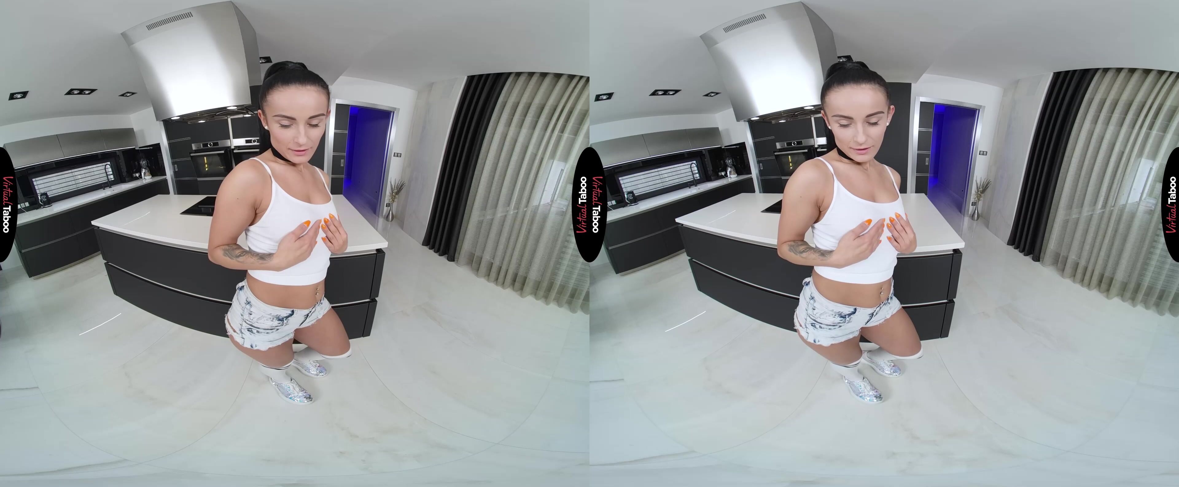 Lexi Dona has been trying to get laid for months. The guys at school are just too lame and she can’t stand online hookup apps. She started looking closely at her handsome stepbrother and decided that going out for dick was silly when she could get as much as she wanted without leaving home. Knowing that you spend most of your time watching VR Porn and masturbating in your room, Lexi decided it was time for you to get some of the real thing. She got all dressed up in a tight pair of shorts and a revealing top and barged in to get your opinion on the outfit. Seeing you squirm uncomfortably as she shows off more of her body, Lexi turns up the heat, pulling up her shorts until her ass is exposed. When she has you right where she wants you, she tells you to take out your cock so she can see if you are worth fucking. You whip it out and she is pleased to see that you are not a disappointment. Engaging in a game of “you show me yours and I’ll show you mine” she pulls off her top while you pull on your prick. Sitting on the counter like a real VR porn model, she plays with herself while telling you that she needs you to fuck her. She needs your cock on the regular and doesn’t want you to ever say no to her. No problem there. Your furious stroking matches her own fingering as you promise to give her all the cock she can handle. There won’t be any more waiting for Lexi. She is going to fucked often without ever leaving home.