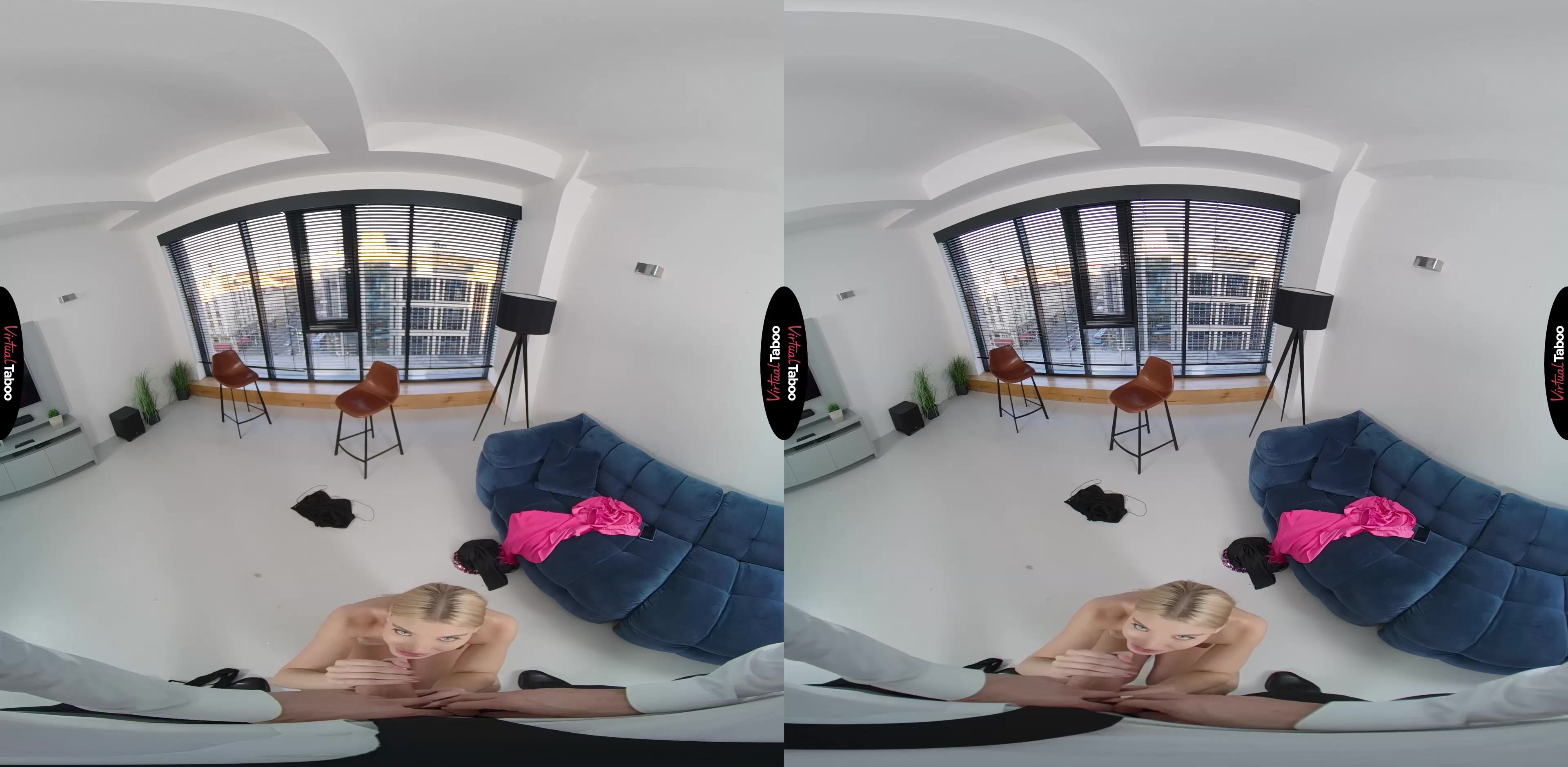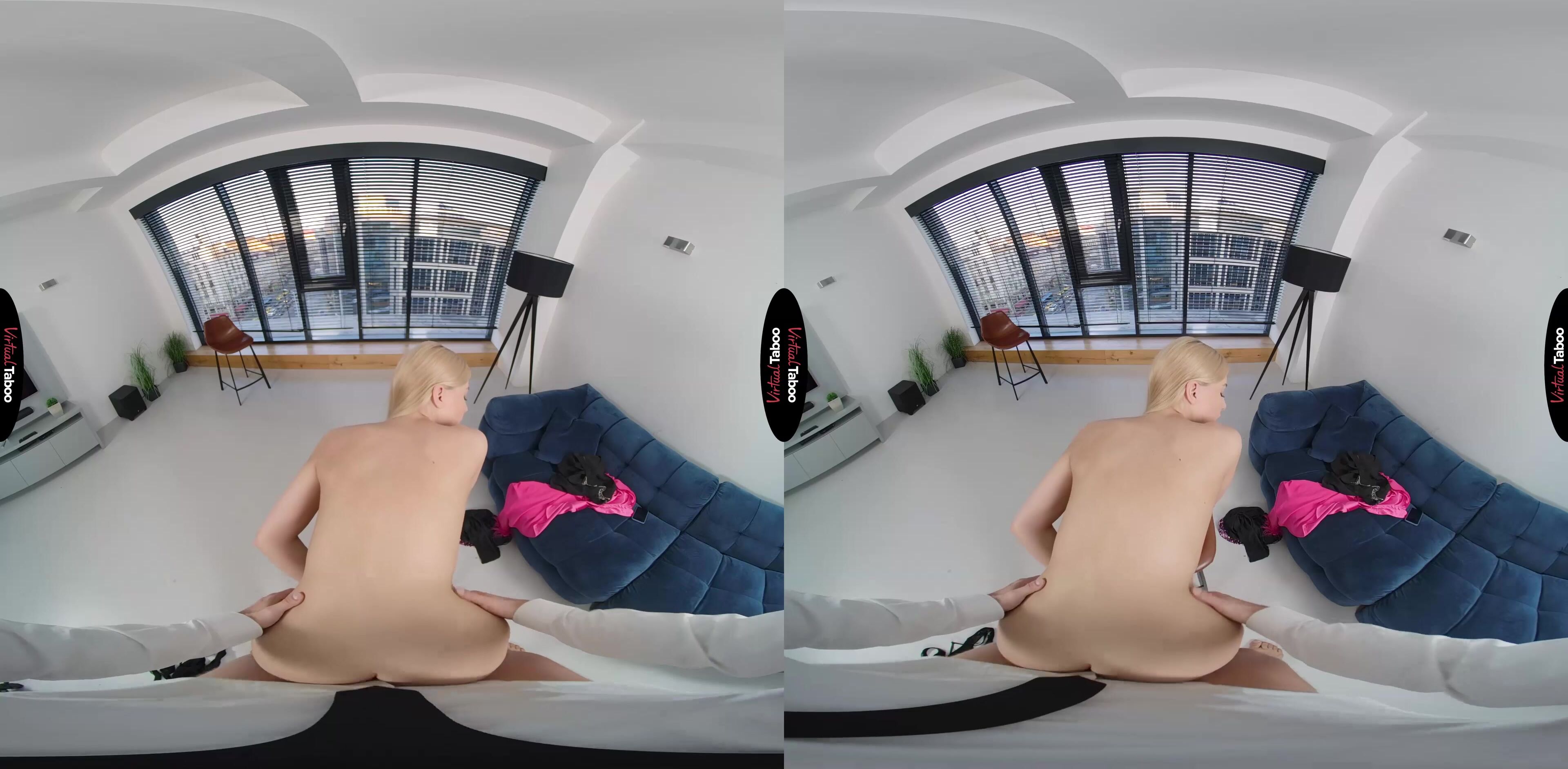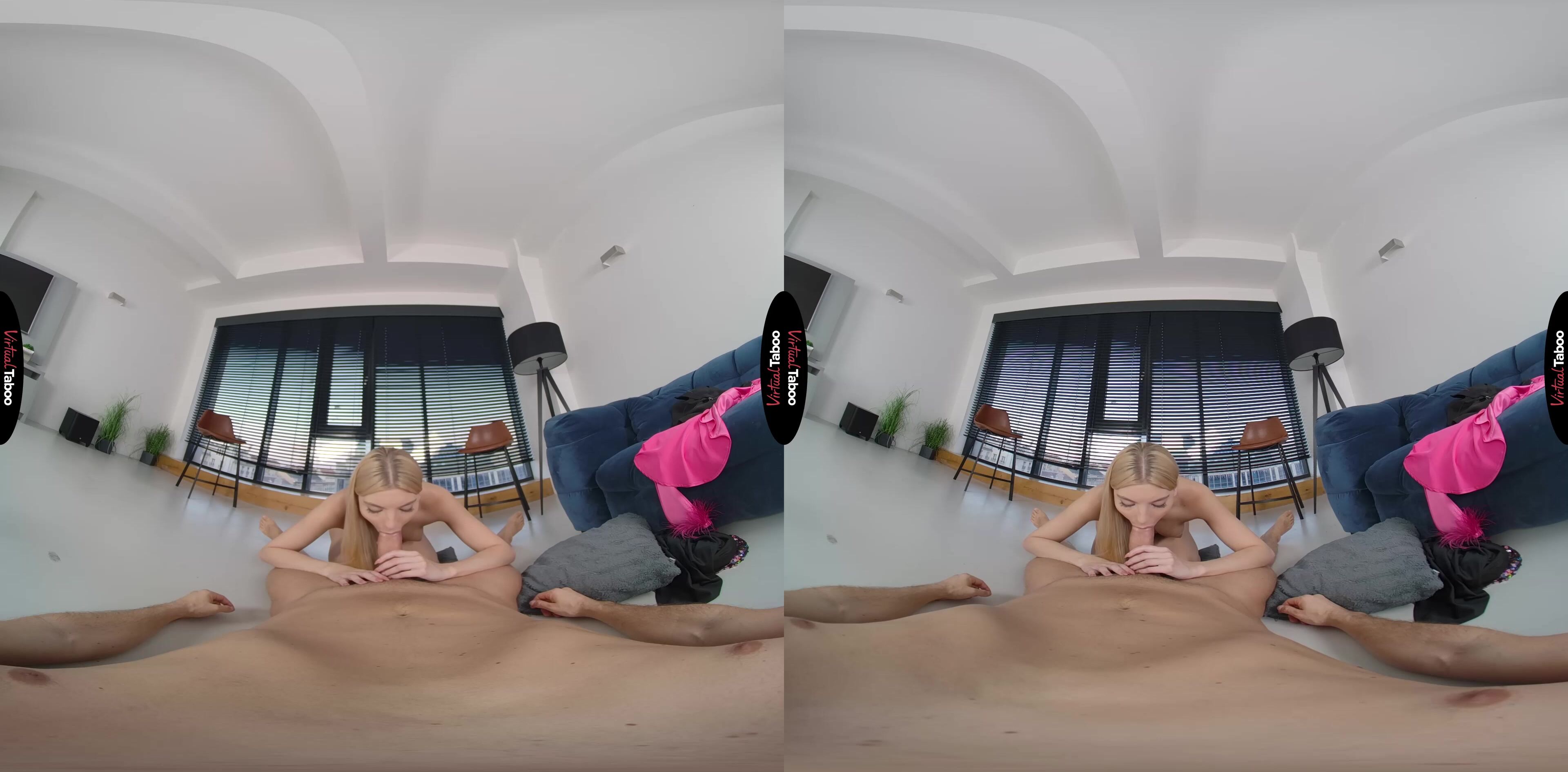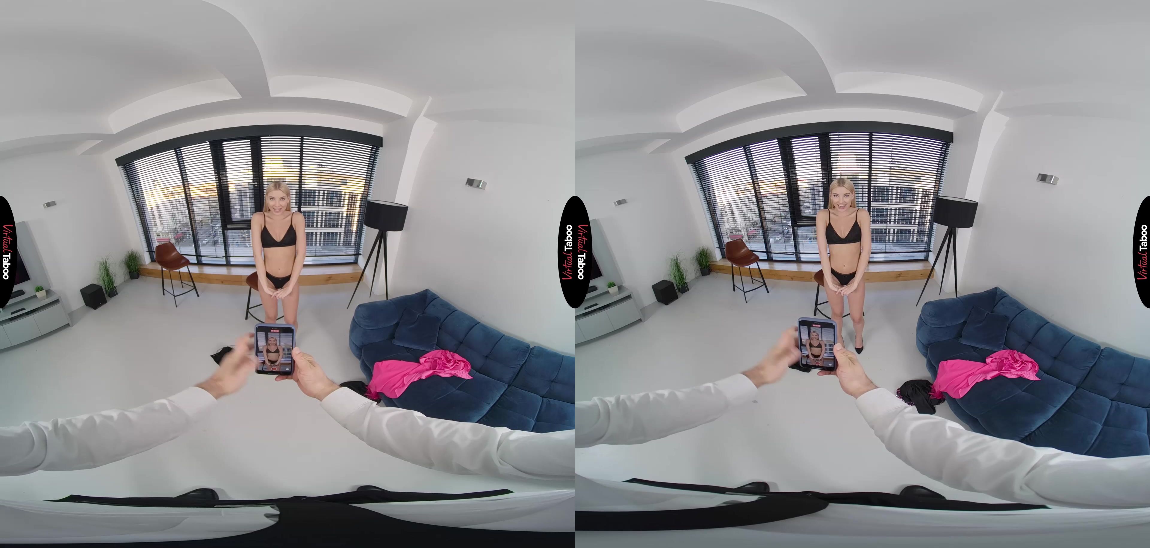 Sylvia Buntarka is a hugely popular social media influencer. Her followers can’t wait for her next post. She is trying to get some new VR video footage for her latest sexy update but is having some trouble getting the shots just right. Asking her stepfather for help, she has him holding the camera while she continues. Knowing that this is going to be a very revealing update, Sylvia finds herself getting wet thinking about taking off her clothes in front of her stepdad. She can see your hand shaking when she strips down to her bra and panties and catches you peeking while she changes into an even skimpier dress. Getting bolder, she pulls down her top and teases you when you put the camera down. She doesn’t want you to stop filming because this is going to be a special naked update for her followers. Her mother would not be OK with this so she really needs her stepfather’s help. You agree reluctantly, but the huge bulge in your pants tells her that you are enjoying the show. Stripped down to just her heels, Sylvia grabs your cock and starts sucking. She looks so much like your favorite VR Porn models that you just let her use her tongue at will. After a few minutes in her mouth, you spin her around and fuck her from behind. It doesn’t matter how wrong it is, her pussy feels too good and she is thrilled to be riding your experienced meat. She cums hard and then has you pick up the phone to shoot again as you unload your balls all over her pretty face. Smiling with all your cum running down her cheeks, she knows she will save this for a special update for mom’s eyes only.