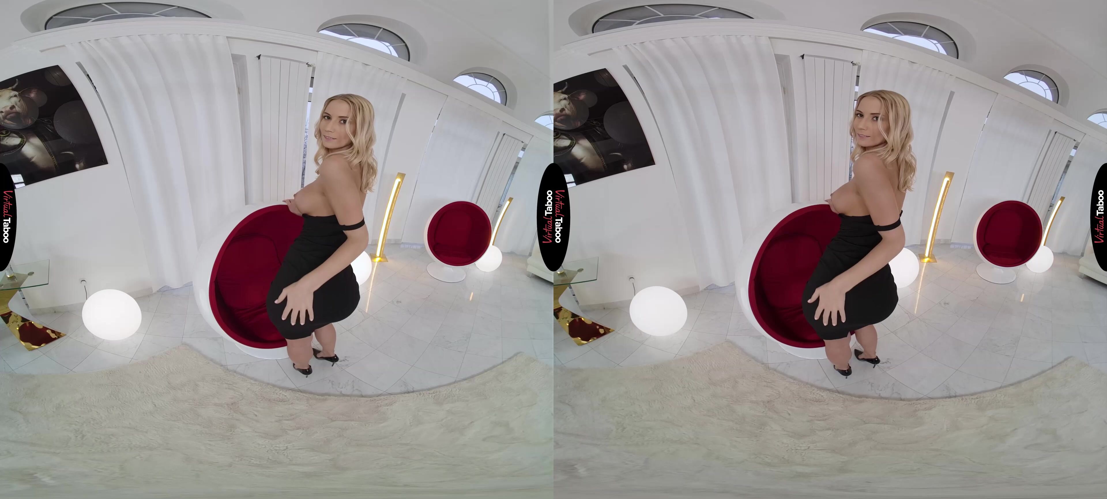 Sharon White has been working very hard to support her family while her husband is working overseas. After years at her firm, she has left to try a new job and needs to impress her new bosses. On her first day, she tries on a tight black dress that makes her feel sexy. Still, she is unsure of herself and needs another opinion. She knows that her stepson is home, watching VR porn in his room so she calls him out to take a look. One look at the expression on your face tells her all she needs to know. The dress looks great and she looks like a real VR pornstar in it. You tell her it looks fine, but she can already see the bulge in your pants and makes you stay for a closer look. Enjoying how uncomfortable you are looking at her, Sharon bends over, asking if the dress is too tight in the back for a professional setting. She knows this of course and teases you “But does it make me look fuckable?” she asks as she pulls it up, showing off her bare ass cheeks. Speechless, you stand still, staring at your stepmom while she stares back at the throbbing boner in your jeans. As an answer, you pull out your cock and begin to slowly stroke it. She suddenly realizes how horny she is and how much you must like her. Encouraging you to stroke faster, she takes off her dress, leaving on her heels at your request. She watches your dick throb in your hand as you get close and feel her fingers slip into her wet, horny hole. As she watches your load shoot onto the floor, Sharon cums herself and wonders if the dress will have the same effect on her boss at work.