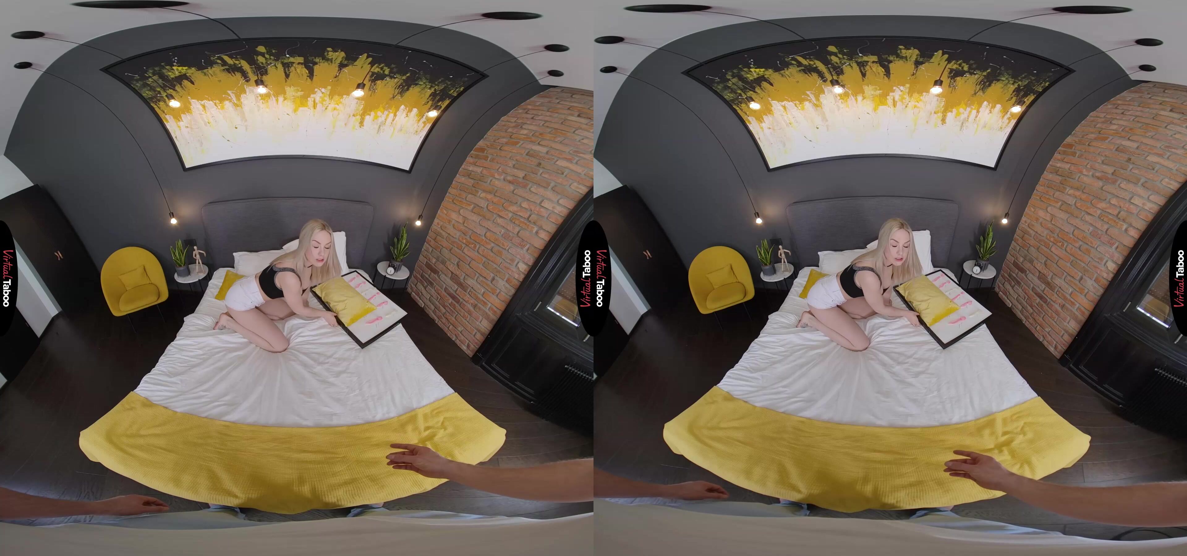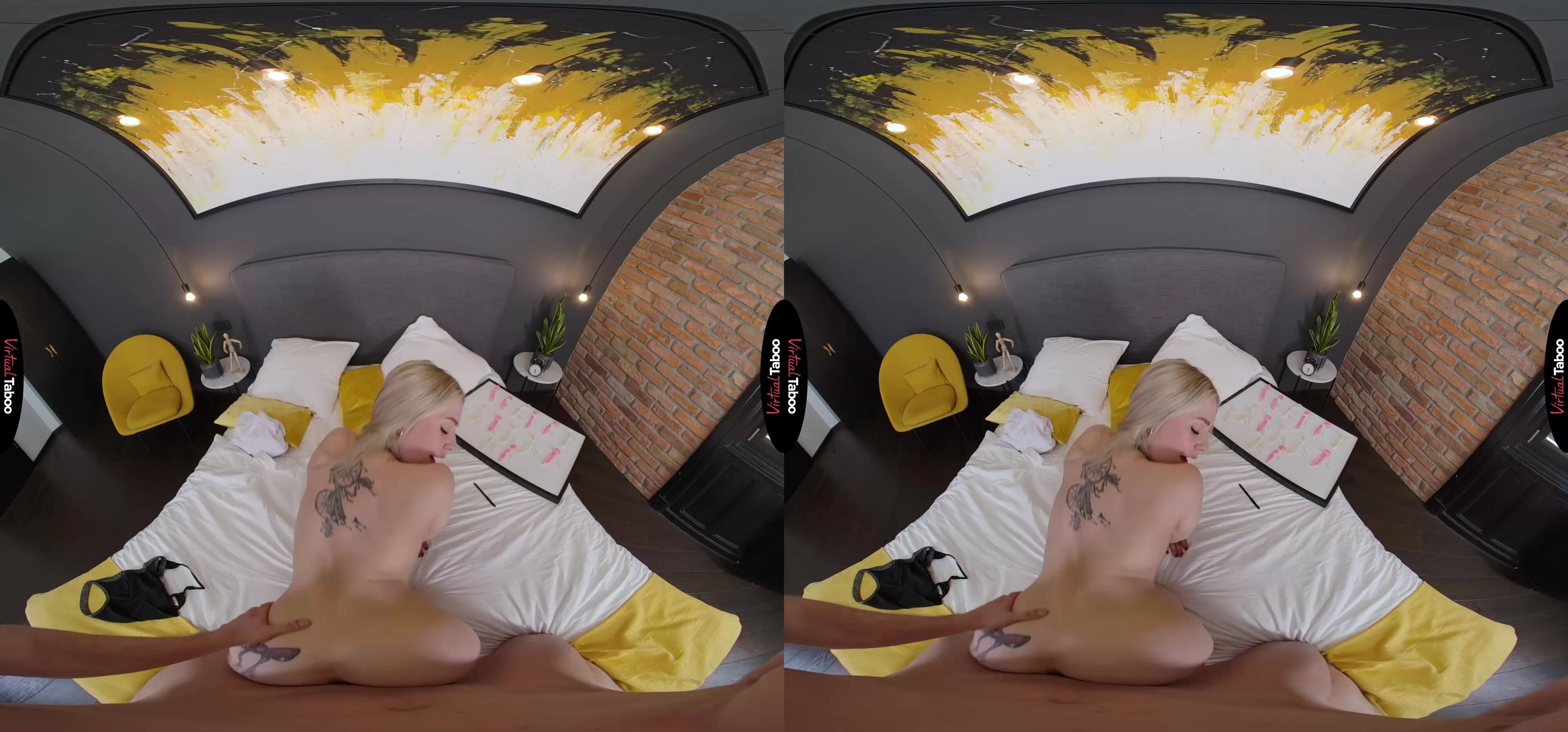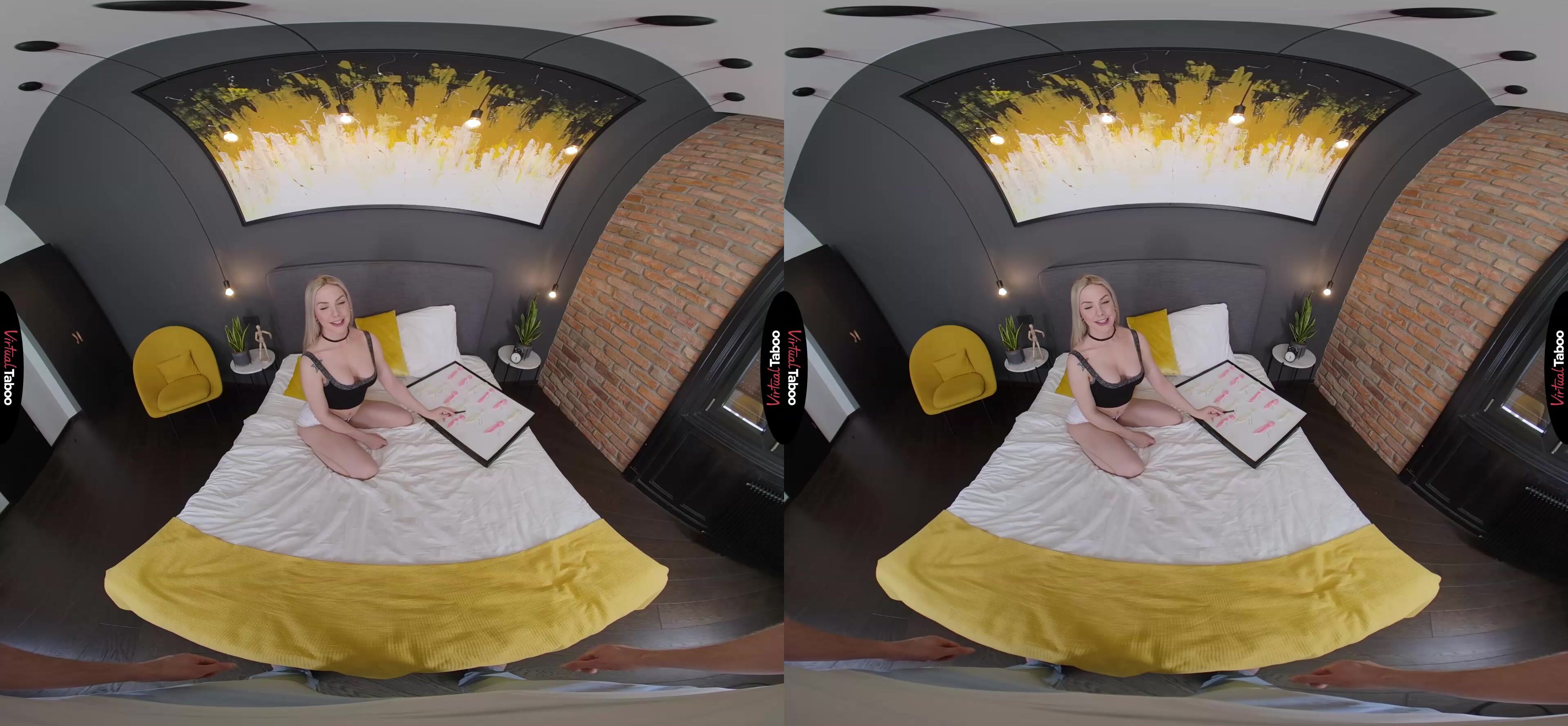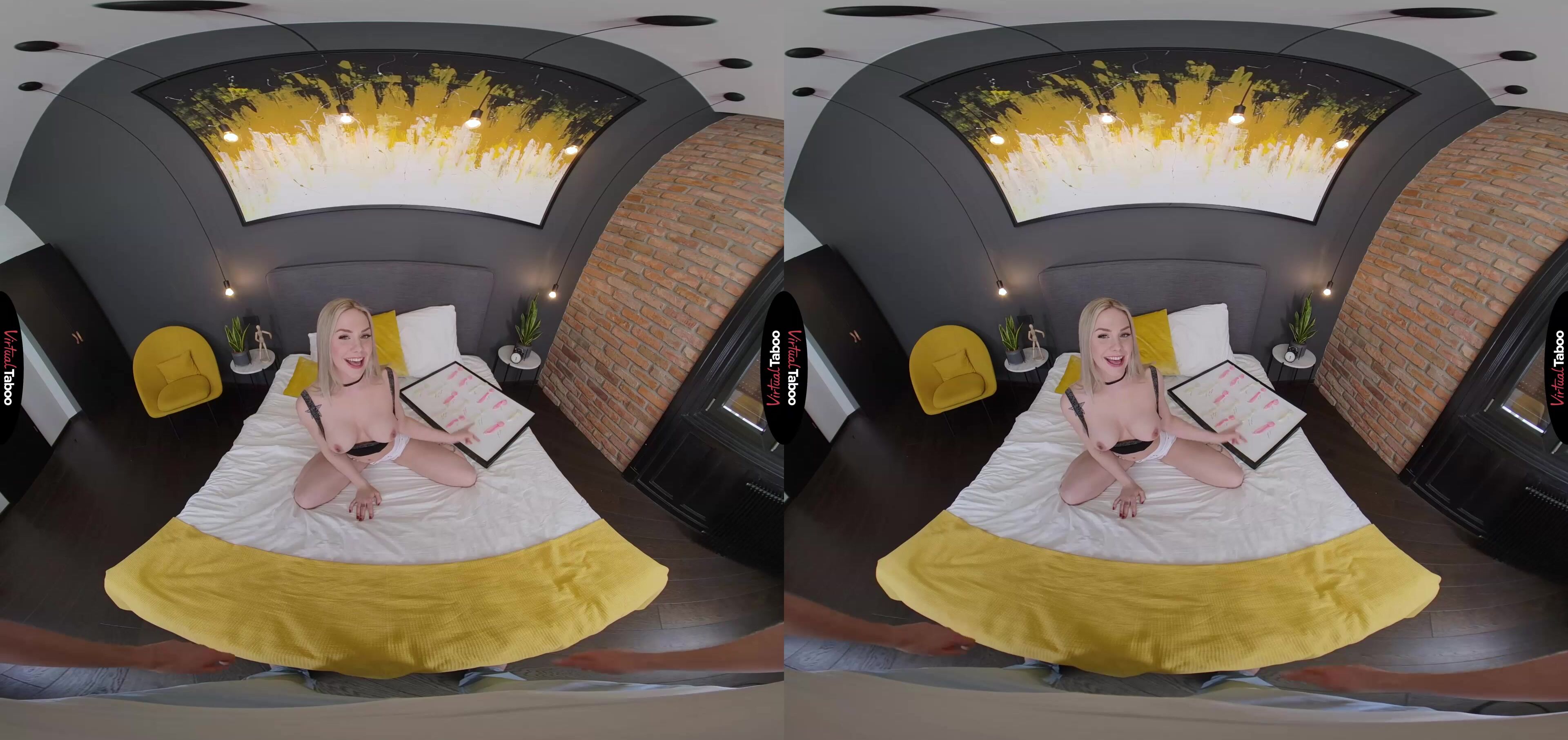 Angie Lynx has a very special and particular fetish. She likes to collect and save semen from each of her lovers. The promiscuous blonde teen even keeps her collection of half-full condoms on a special board that she has hidden under her bed. After her latest conquest, she is attaching the rubber from their encounter. Proud of her conquests she gets a little too caught up in the sexy memories and doesn’t notice when her stepbrother comes into her room. She tries to cover the board, but you have already seen too much. Your parents are very strict and would freak out if they found out, so Angie begs you not to tell. You can’t believe this. For months you have been watching taboo VR porn while masturbating thinking of your sexy slut of a stepsister. You agree not to tell if she will add you to her board. At first, she is shocked, but when she sees the big bulge in your pants, Angie starts to warm up to the idea. She does love a nice big cock in her mouth and it’s not like you are her real brother after all. Once she starts sucking your dick, her pussy gets wet and she just has to ride on you. You ask about a rubber, but she tells you that she used her last one on the guy earlier. Angie wants you to fuck her hole bare and immediately creams all over your meat. You pound on her and right before you are about to explode she has you cum in her mouth. With a smile, she pulls out a rubber, spits the load in and adds her horny stepbrother to her board of conquests.