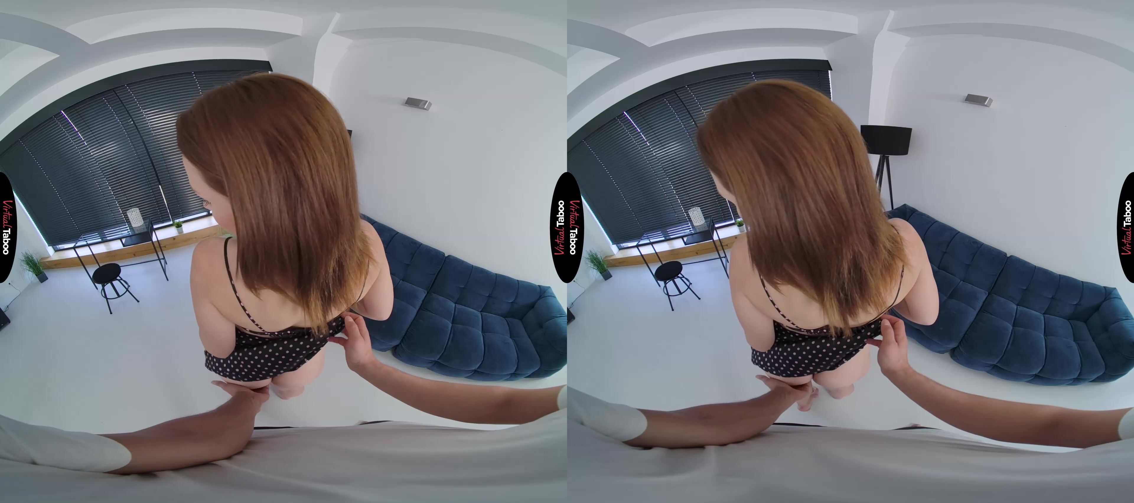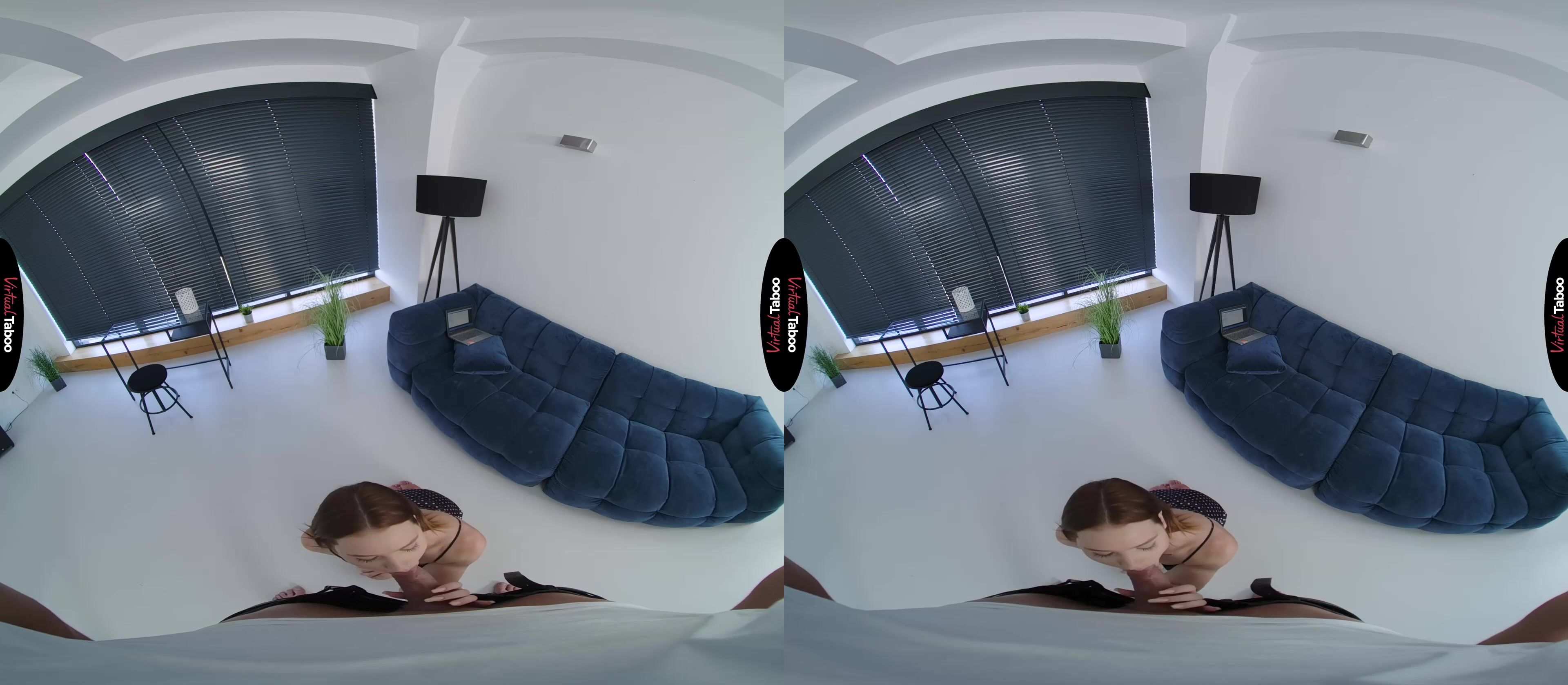 Matty was excited to land the lead in her college play, but also very nervous. The part calls for some intimate romantic dialogue and some physical love scenes. Shy around guys, she has never even had a boyfriend and doesn’t feel any connection to the words she has to memorize. Nervous about her VR performance, Matty knows that she needs more rehearsal and asks her stepbrother if he will help. You know nothing about asking but agree to read the lines with her. Matty delivers a performance that is so passionate you can’t help but get turned on and when she goes in to hug you at the end she feels that your cock is rock hard. She is shocked but also flattered. Was her acting really that good, or do you have a crush on her? She has no idea that you masturbate every night to VR Taboo Porn just wishing that your sexy stepsister would catch you and join in. She sees your big cock and puts it into her mouth, feeling you throb and knowing she has you right where she wants you. Unsure of how far to take things, she is suddenly spun around and can feel the head of your cock pressing into her pussy. Her body is well beyond saying no and she pushes back until your hips slam into her ass cheeks. It feels better than she ever imagined it would. Matty has forgotten all about her lines and is just enjoying the way your big cock feels inside of her pussy. Before they go too far she makes you pull out so you can cum all over her cute face.