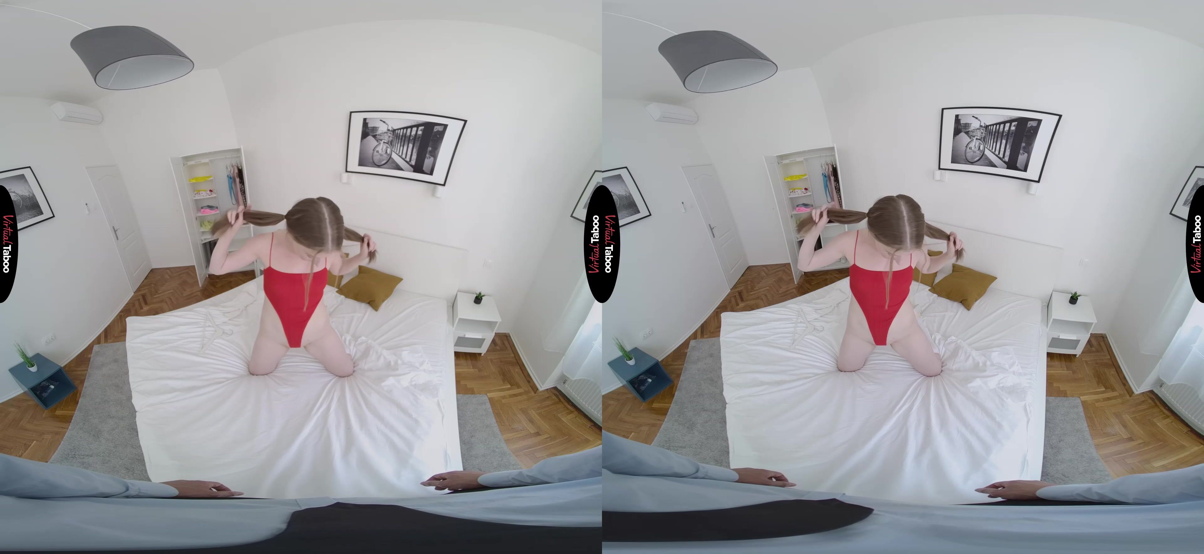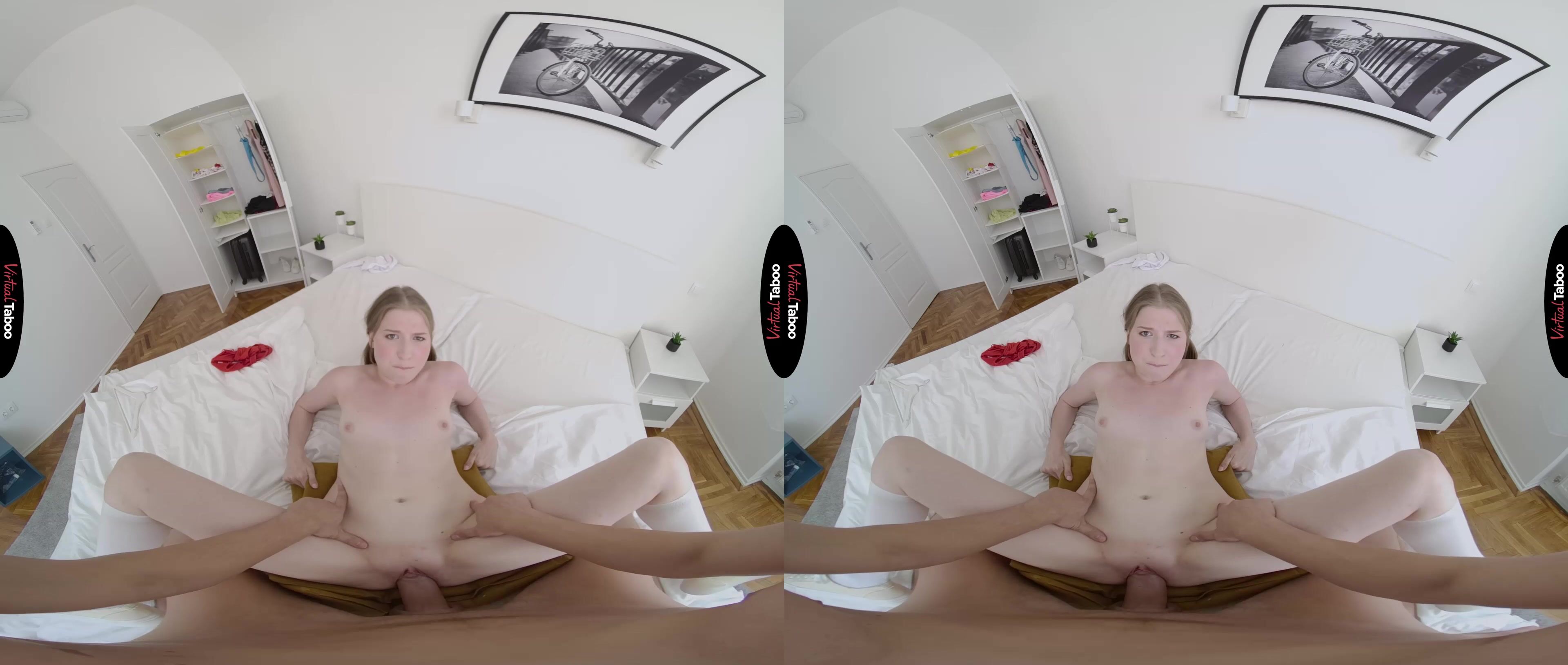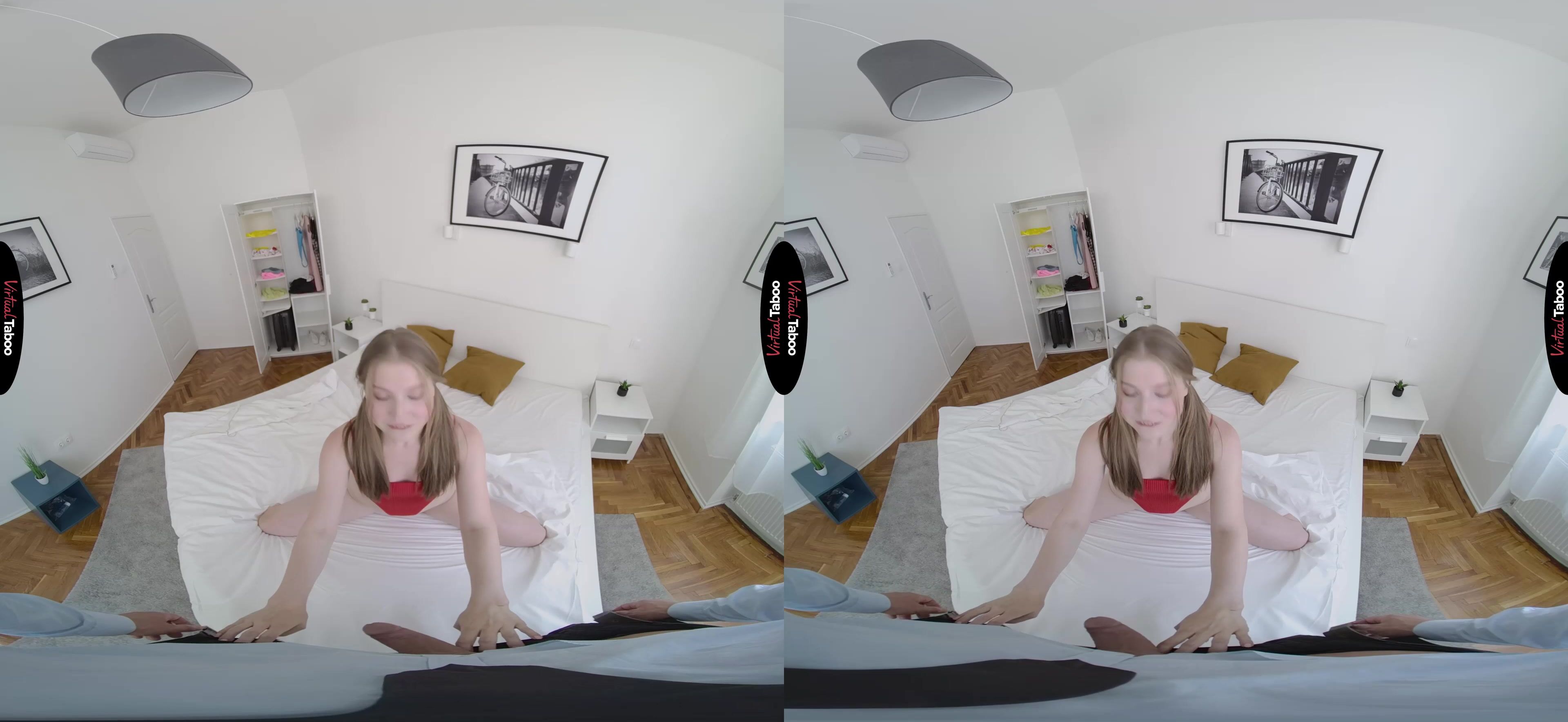Martha is both excited and sad. She is leaving today for college. On one hand, she knows that she has a whole new, exciting life waiting for her. On the other, she realizes that for the first time in her life, she will be far from home and her loving family. Of all the people in her life, she thinks she will miss her stepfather the most. They have always been close and as she packs to leave. In this VR porn video, Martha asks for his help in deciding which clothes she should bring with her to college. To her surprise you seem to react the best to the sexy, skimpy outfits she picks out. When Martha notices that you are trying to cover a bulge in your pants, she gets a wicked idea. Before she leaves for college, she needs to fuck you. You seem uncomfortable as she pulls her clothes aside to show off her horny pussy, but this cock is hard and you can’t resist when she puts her mouth on it. You know it is wrong, but also knows that you have been fantasizing about this while watching VR Porn for a while now and is not about to stop her from using her tongue to please step daddy. Now that she has your attention, Martha turns around and guides your dick into her juicy pussy. She never realized how much she wanted you until you were balls deep in her tight teen twat. She rides you and cum over and over, hoping to milk a load from you, but you don't want any accidents. You pull out and spray you go all over her pretty face. Now she can’t wait to have step daddy come visit her at college.