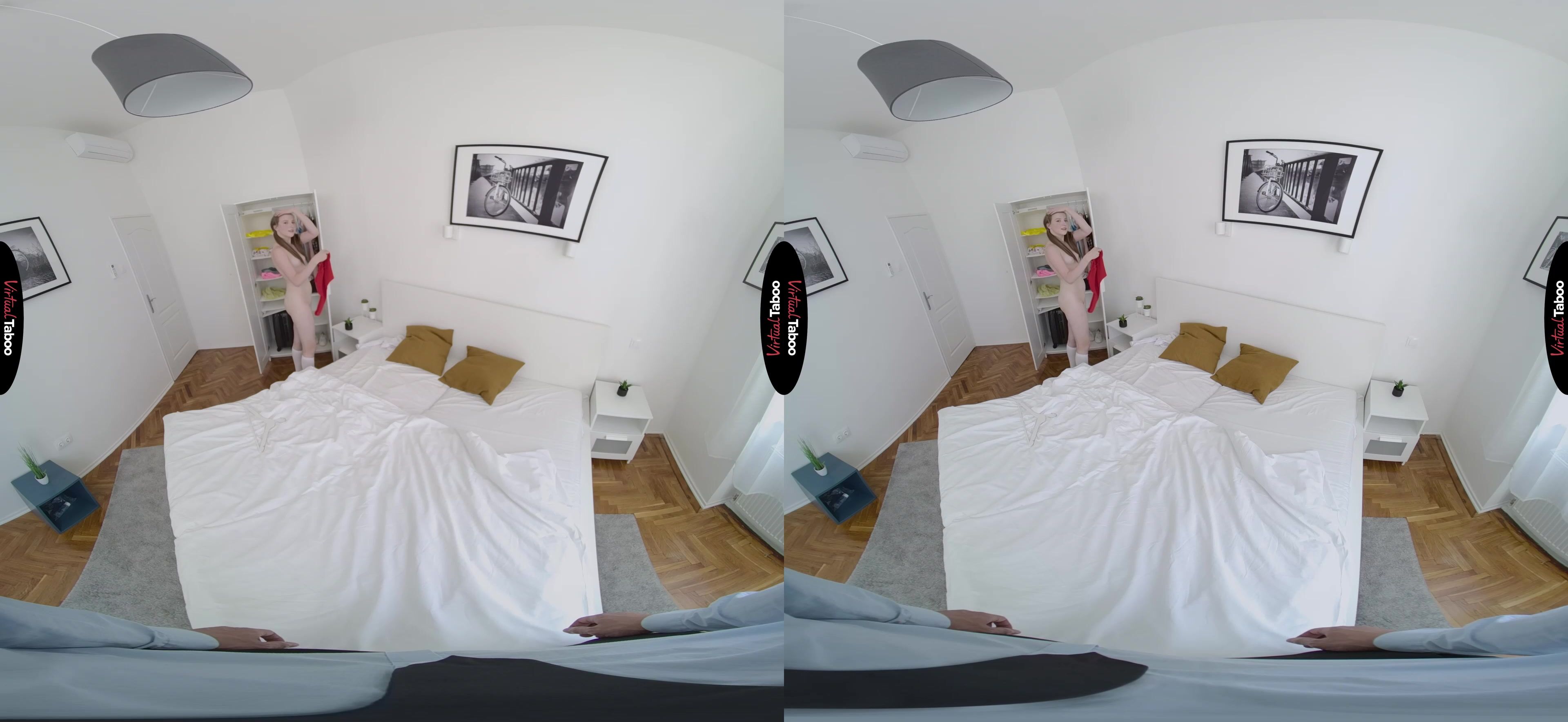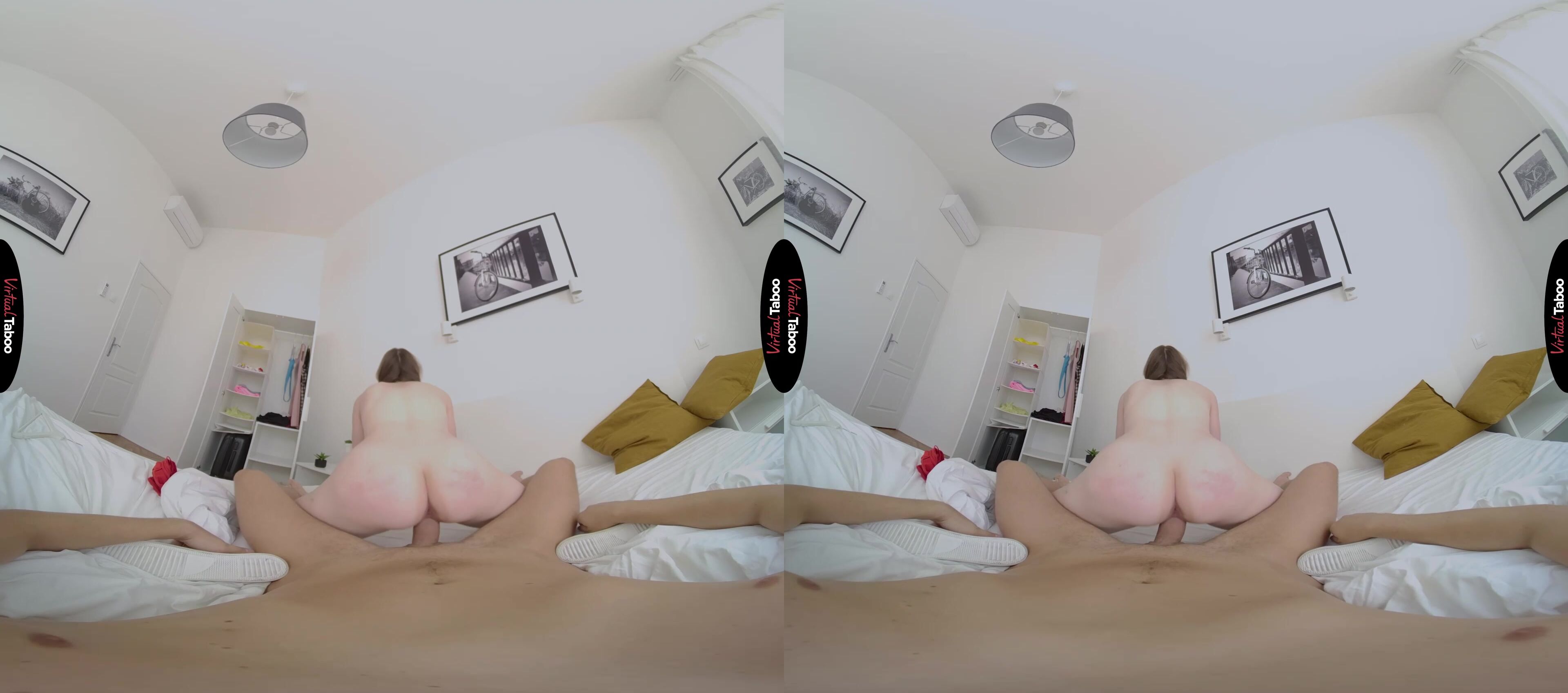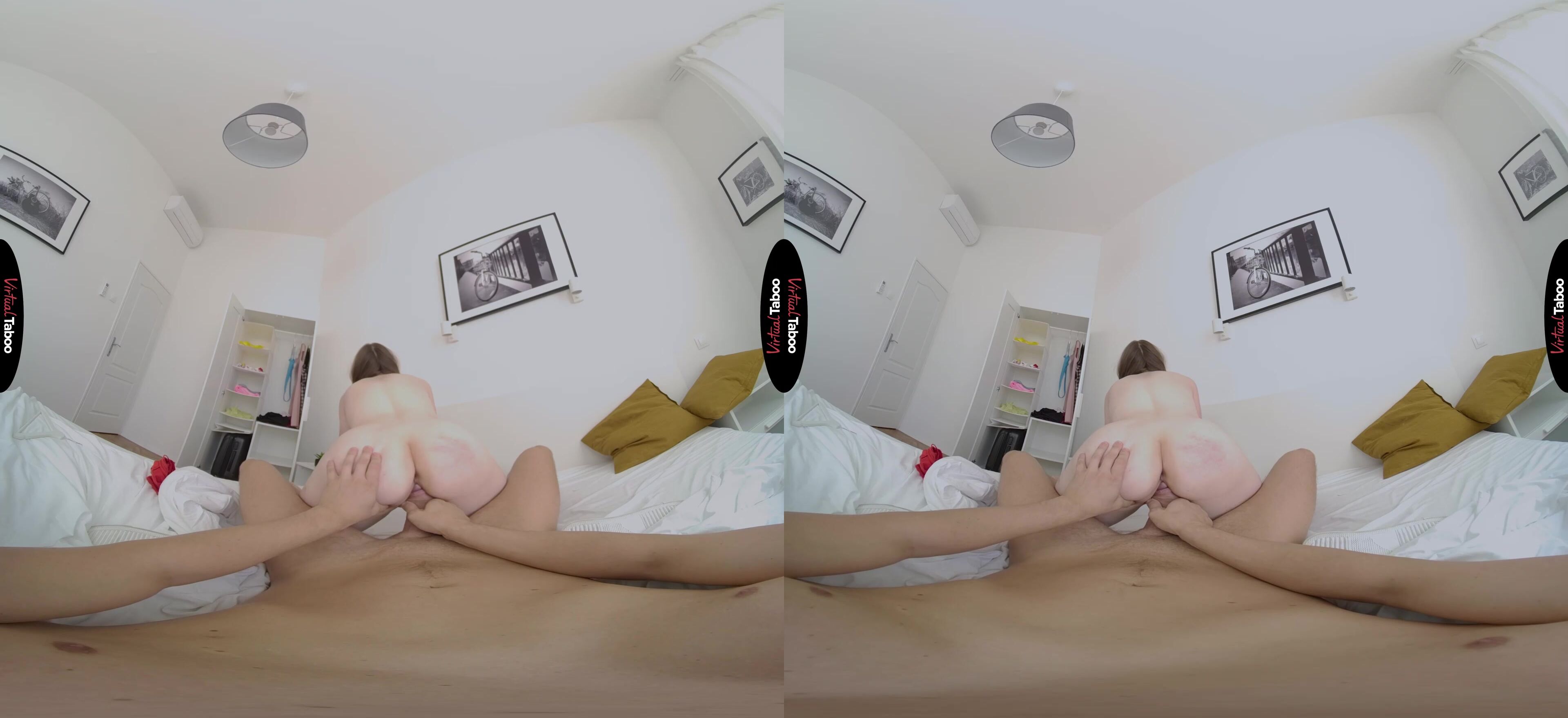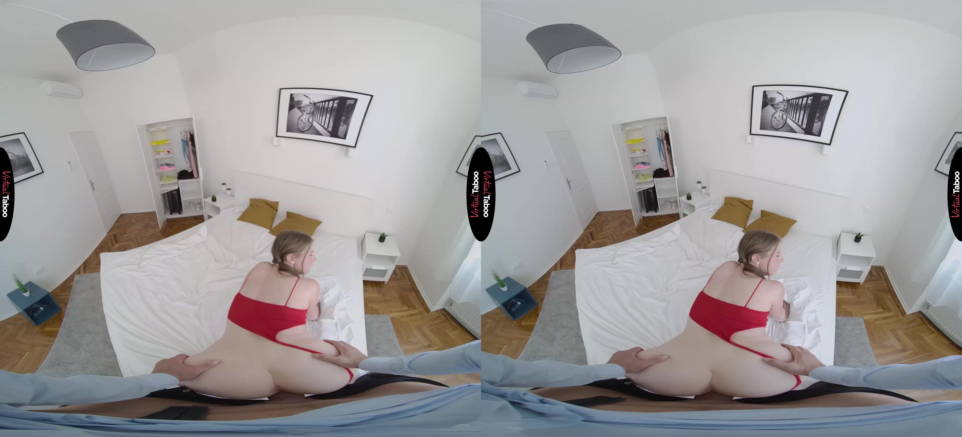 Martha is both excited and sad. She is leaving today for college. On one hand, she knows that she has a whole new, exciting life waiting for her. On the other, she realizes that for the first time in her life, she will be far from home and her loving family. Of all the people in her life, she thinks she will miss her stepfather the most. They have always been close and as she packs to leave. In this VR porn video, Martha asks for his help in deciding which clothes she should bring with her to college. To her surprise you seem to react the best to the sexy, skimpy outfits she picks out. When Martha notices that you are trying to cover a bulge in your pants, she gets a wicked idea. Before she leaves for college, she needs to fuck you. You seem uncomfortable as she pulls her clothes aside to show off her horny pussy, but this cock is hard and you can’t resist when she puts her mouth on it. You know it is wrong, but also knows that you have been fantasizing about this while watching VR Porn for a while now and is not about to stop her from using her tongue to please step daddy. Now that she has your attention, Martha turns around and guides your dick into her juicy pussy. She never realized how much she wanted you until you were balls deep in her tight teen twat. She rides you and cum over and over, hoping to milk a load from you, but you don't want any accidents. You pull out and spray you go all over her pretty face. Now she can’t wait to have step daddy come visit her at college.