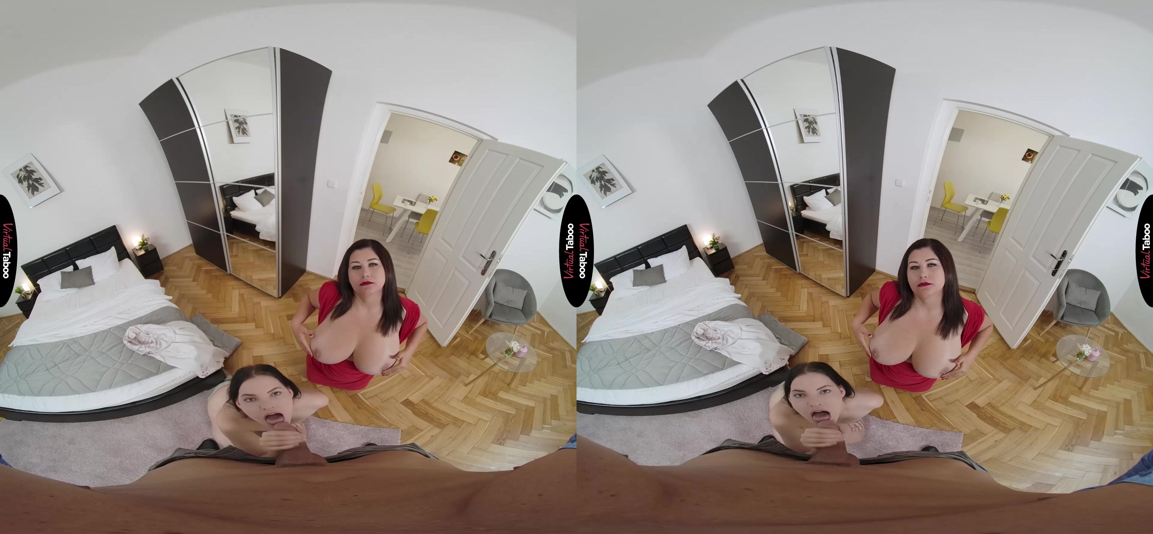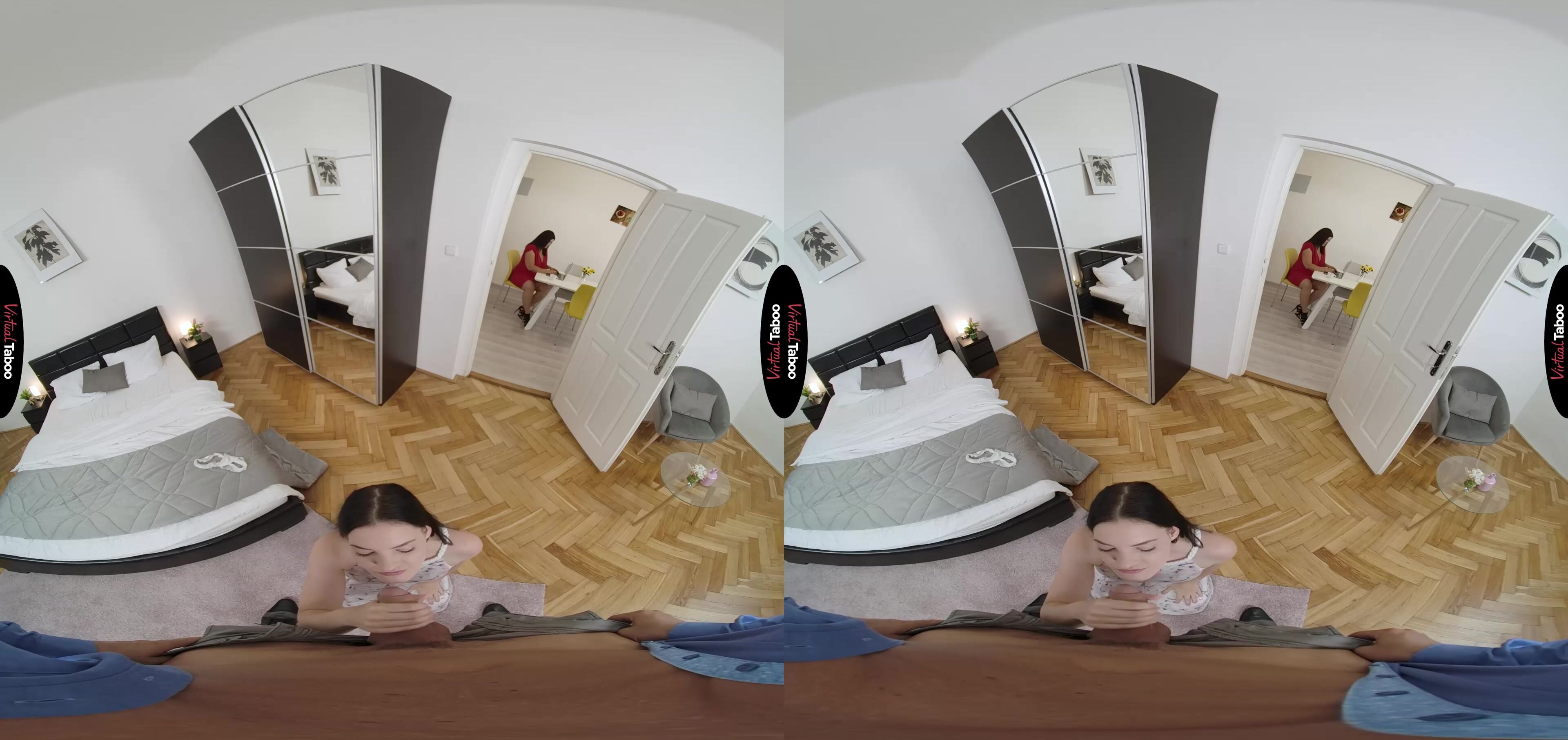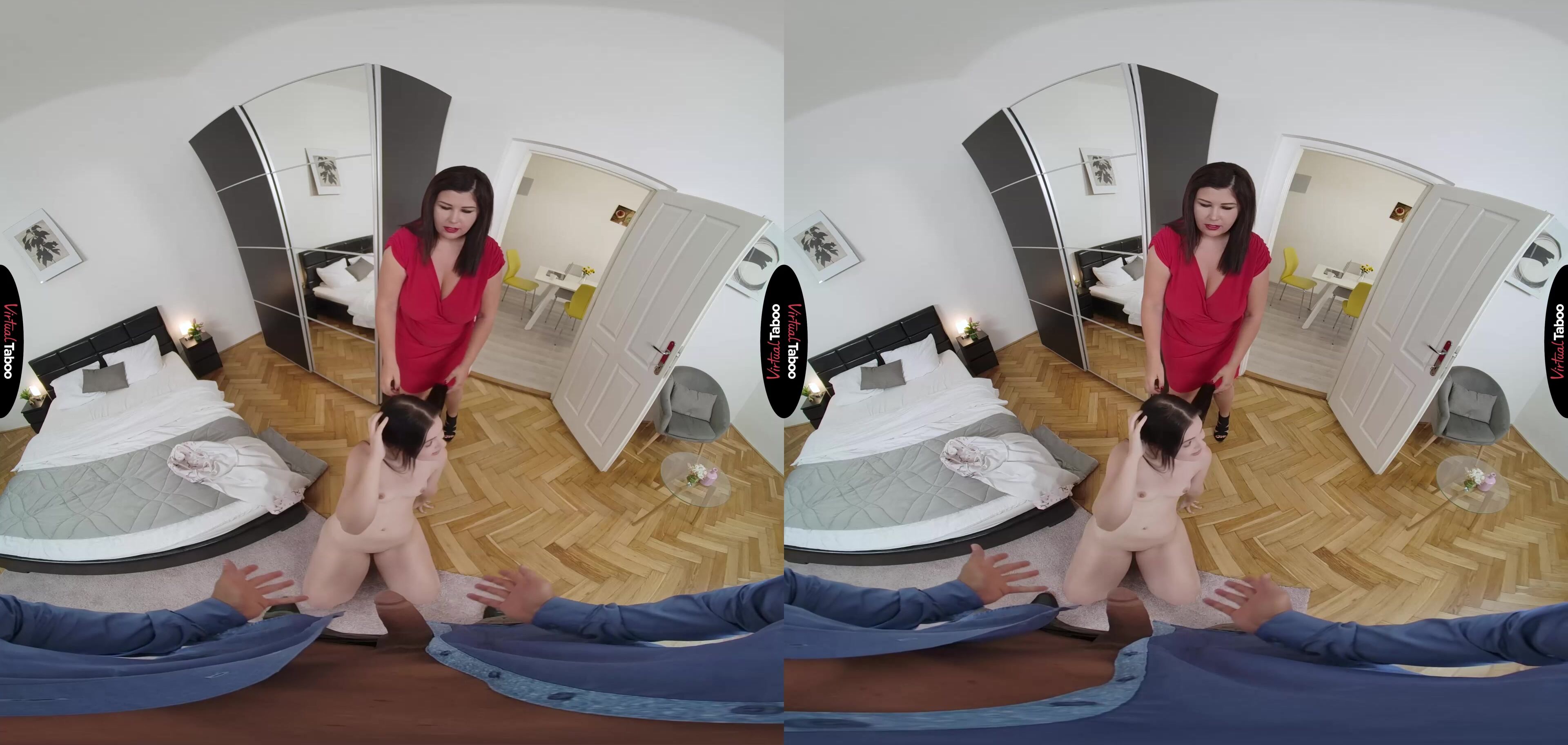 Laura Booblock wakes up next to her amorous husband. She has a busy day ahead and refuses his advances. She is already hard at work on her laptop, she kisses Anie good morning while her husband gets ready to go into the office. The cute teen has had a crush on her stepfather for a while and when she sees him peeking at her, she decides to tease him. In this VR porn video, she pulls down her panties and watches as he stares at her tight, young body. Ignored by your wife, you feel your cock get hard and doesn’t try to stop her when Anie slides over on her knees and starts licking your throbbing prick. Caught up in the moment and revealing in the feel of your sexy stepdaughter’s mouth, you don't notice your wife at the door watching you. She rushes in to pull Anie’s mouth away but quickly realizes that she is not a little girl anymore. If she is going to be sucking cock, she needs to learn to do it right. She can only learn so much from VR Porn so Laura decides to give Anie a lesson right there, in person, using her horny husband as a practice cock. Watching you fuck Anie makes Laura surprisingly wet and she wants to feel your thrusting meat as well. She knows you love her big tits and curvy figure, but you also love Anie’s thin frame and tight pussy. You love it so much that you cum inside of her with no warning. Ooops, she isn’t on birth control. Oh well, Anie always wanted a younger sibling.