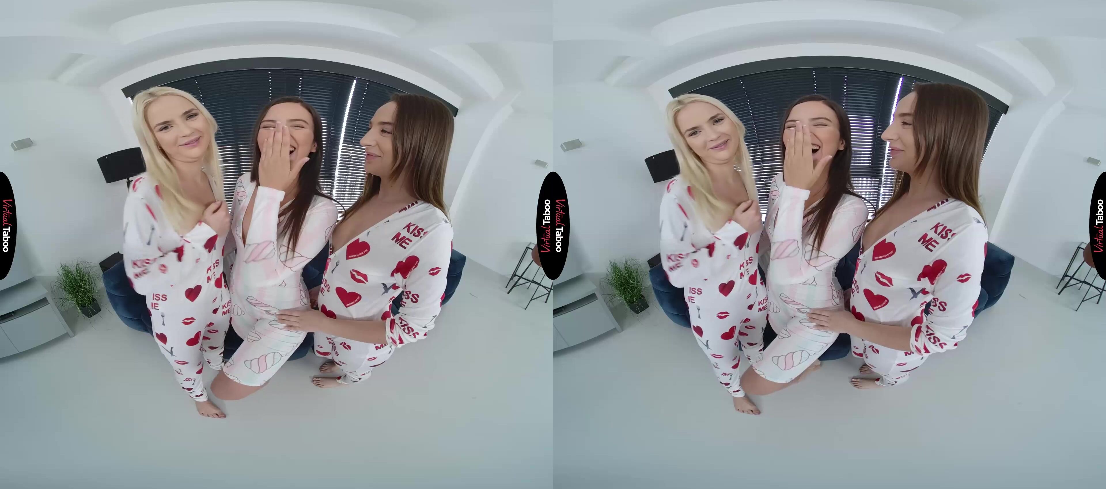 Ariana Van X has her two best friends Lika Star and Kylie Green over to her house. Ariana’s mother is away on business and she knows she has to ask her stepfather for permission to have her friends spend the night. She has seen the type of VR Porn he watches when he thinks no one else is home. This gives her an idea on how they can convince you. She and her friends put on some pajamas and go into your room where they plead with you to let them have a sleepover. You are annoyed that they are interrupting you and shocked to see them dressed that way. Ariana sees you cover your lap with a pillow and whispers instructions into her friends’ ears. In this VR porn scene, they start hugging each other and gently teasing you until you shock your stepdaughter by saying that her friends can stay if they strip for you. They agree right away and show you their tight teenage asses. The girls love to tease and watching your reaction emboldens them. They have to get naked, so you should too. If you want to see more, you are going to have to take out your cock and stroke it for the horny coeds. They see how big it is and Ariana understands why her mom makes so much noise in the bedroom. Your stroking has them turned on and they did promise to do anything you want so when you tell them to cum, they all start banging their pussies at the same time. The sight is just too much for you and they all race towards a simultaneous climax. Out of breath you hear one of them say that it’s time for round two. How about a game of Truth of Dare?