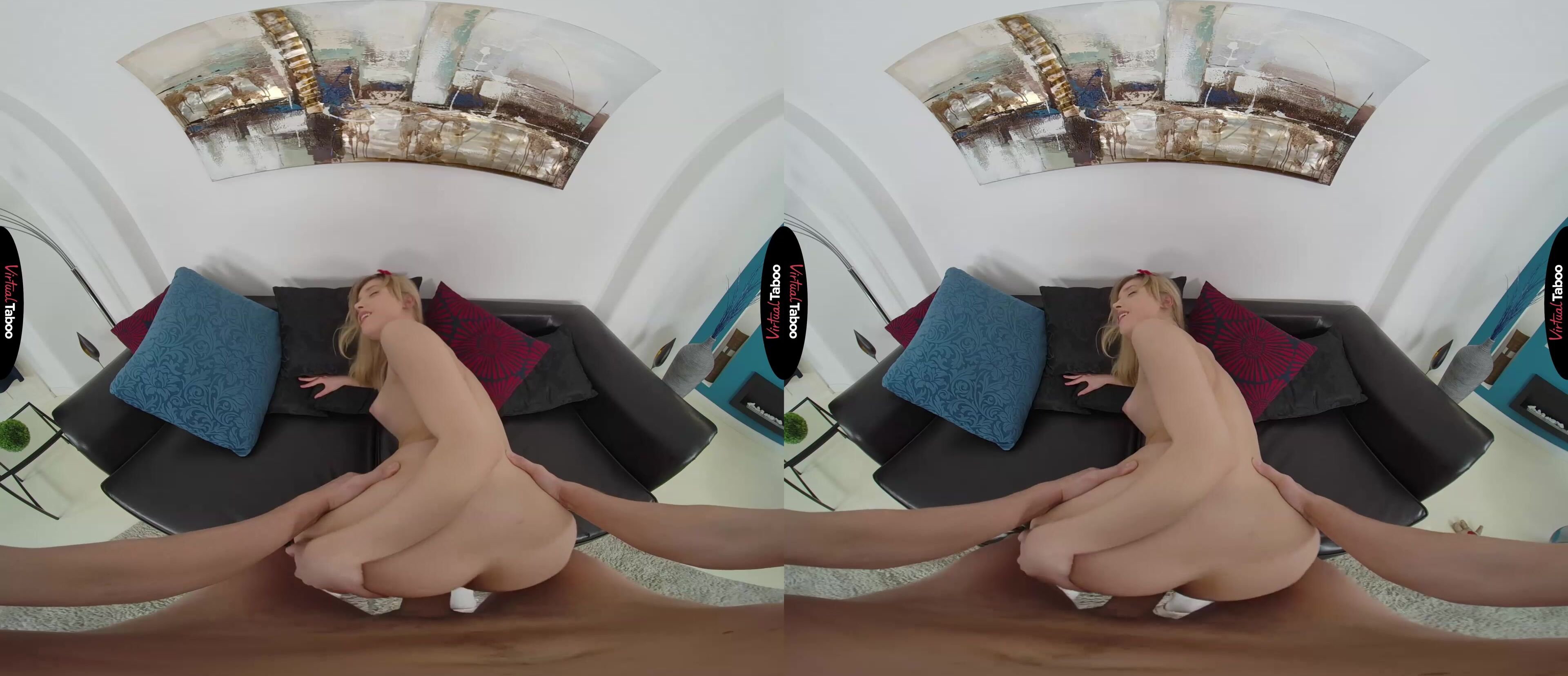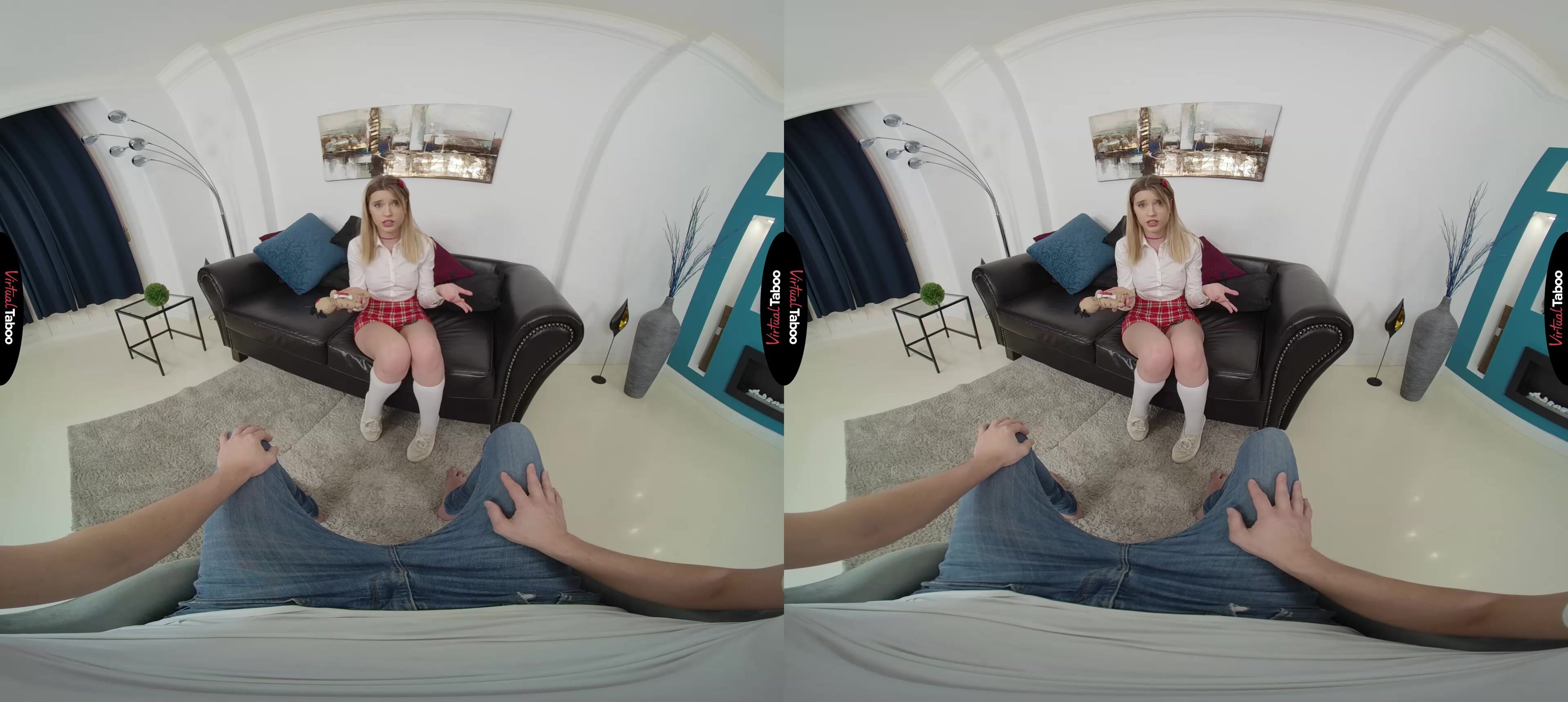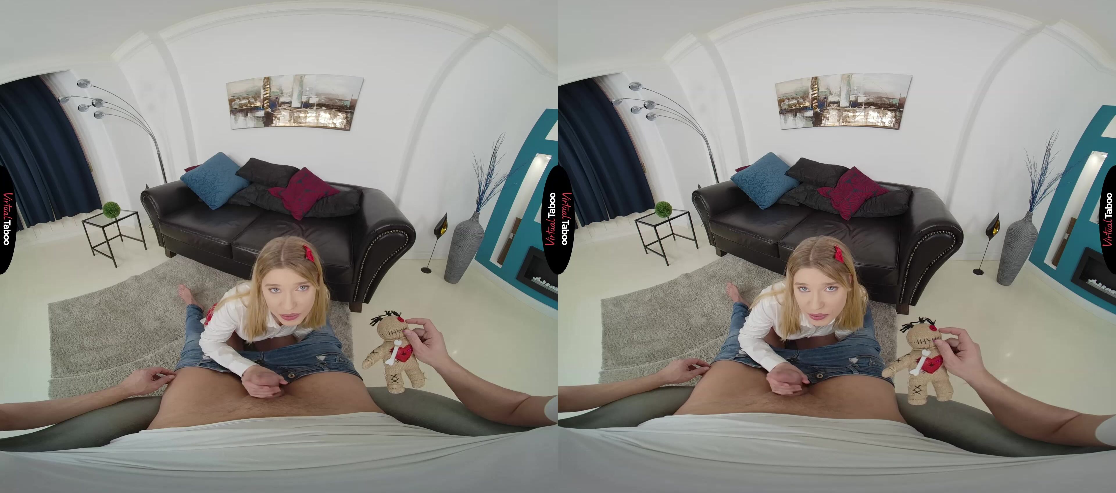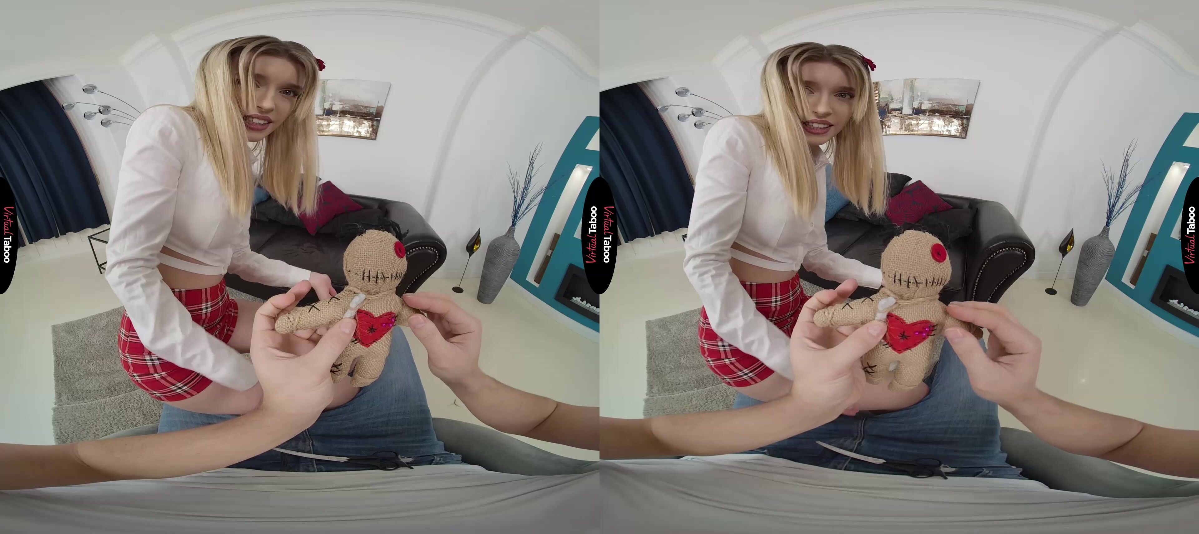Freya Mayer VR has been reading a lot about voodoo dolls. She finds the idea of controlling people very intriguing. The pretty teen tries it using her boyfriend’s hair but doesn’t get any results. Frustrated, she decides to seek advice from her stepbrother. He is annoyed when she interrupts him while he is watching his favourite VR channel. He agrees to try the voodoo doll with a snippet of her hair. Seeing an opportunity, she plays along when she starts manipulating the doll so it looks like you are controlling her movements. Freya has wanted to fuck you for a long while and is hoping you will take advantage of her. You are sure she is faking but can’t resist trying to make her do naughty things. She pretends to be shocked when you make her play with her tits and spreads her legs open but is turned on by playing along. Using the doll you coax her to take out your cock and put it in her mouth. Freya is thrilled to see him hard and ready for her and tastes the forbidden fruit deep in her throat. Convinced she is ready for more, you have Freya take down her shorts so you can fuck her tight pussy. You don’t need the doll anymore because she is riding your dick like she never wants to let you go. You don’t want to stop either, but she reminds you not to cum in her pussy. In her mouth is better so you can keep having much hot sex as possible. Freya throws away the doll and her boyfriend since she is already the perfect fuck doll and has the only cock she needs.