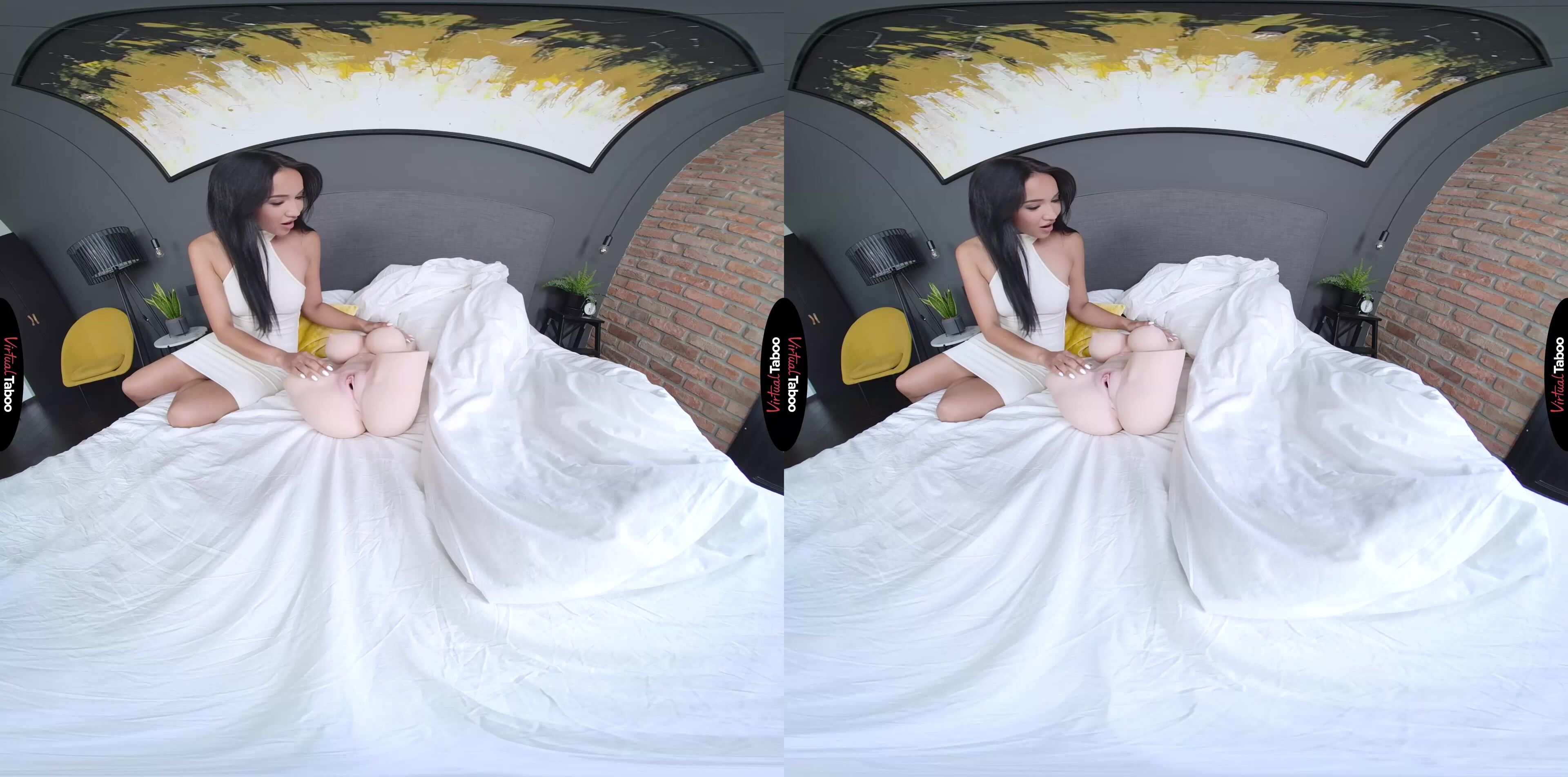Hot young stepmom Asia Vargas is loving her new life. Her husband makes great money and they share a gorgeous home. His college-aged son lives with them, but Asia doesn’t mind as he is usually out and when he is home, he keeps to himself, usually watching VR Porn she imagines. One day while he is at school, she passes his open doorway and finds a lifelike sex toy on his bed. Curious, she goes inside for a closer look. Amazed at how realistic it is, Asia gets turned on thinking of what her studly stepson is going to do to it when he returns. Suddenly inspired, she climbs into his bed and covers her face with the blanket. Doing her best to recreate the same pose as the VR sex toy and hold still, Asia feels your fingers slip into her pussy and then stifles a moan as you shove your young, hard prick into her tight hole. You pump away, thinking you are fucking your toy until Asia throws the blanket aside to surprise you. You are in shock but cannot say no when she turns over and begs you to fuck her pussy from behind. After she cums on your dick, Asia sucks her juices from your throbbing boner. You can’t believe what she is doing, but don't want her to stop. Her pussy feels so much better than your toy and Asia offers to let you have it any time you want so long as you keep it a secret. Her generous offer and her talented mouth make you explode all over her face even before you can emphatically accept.