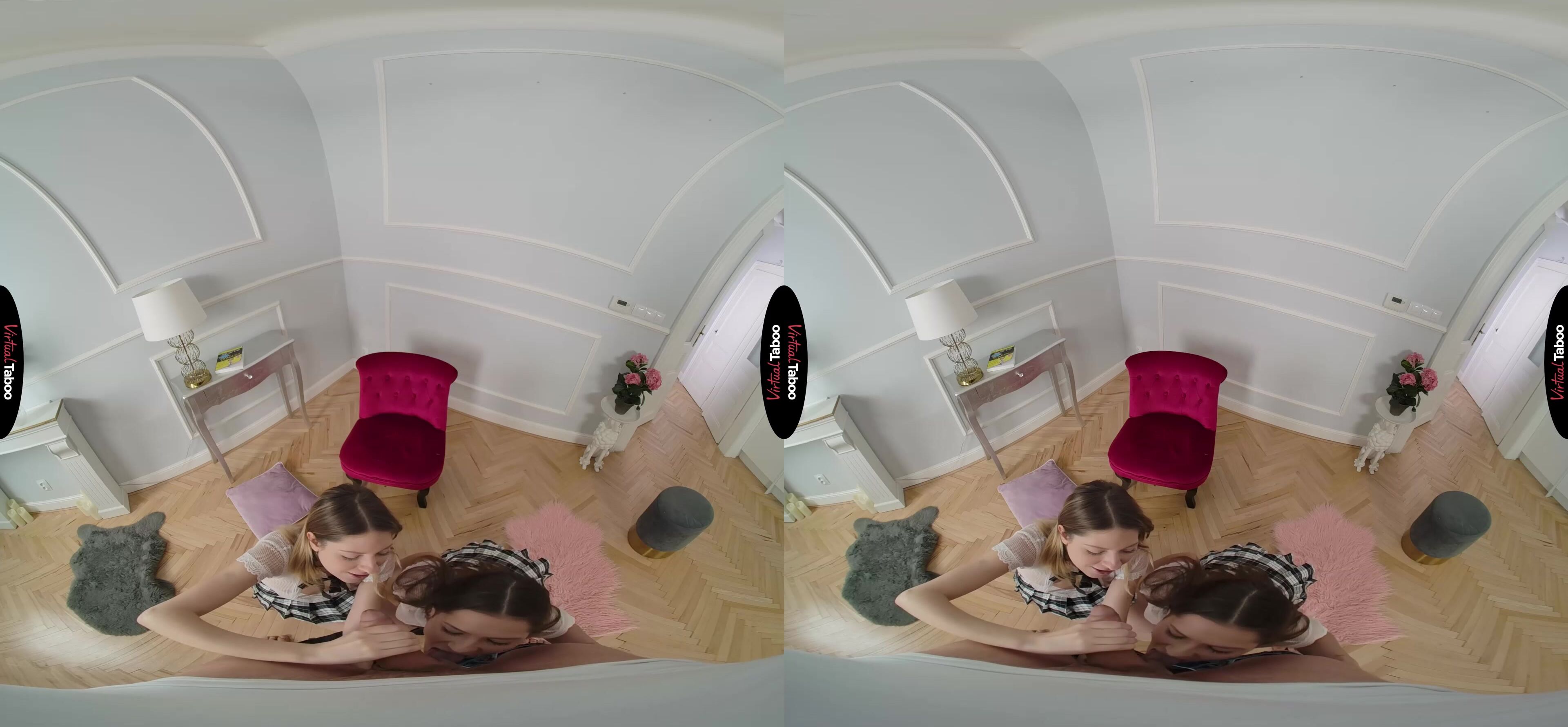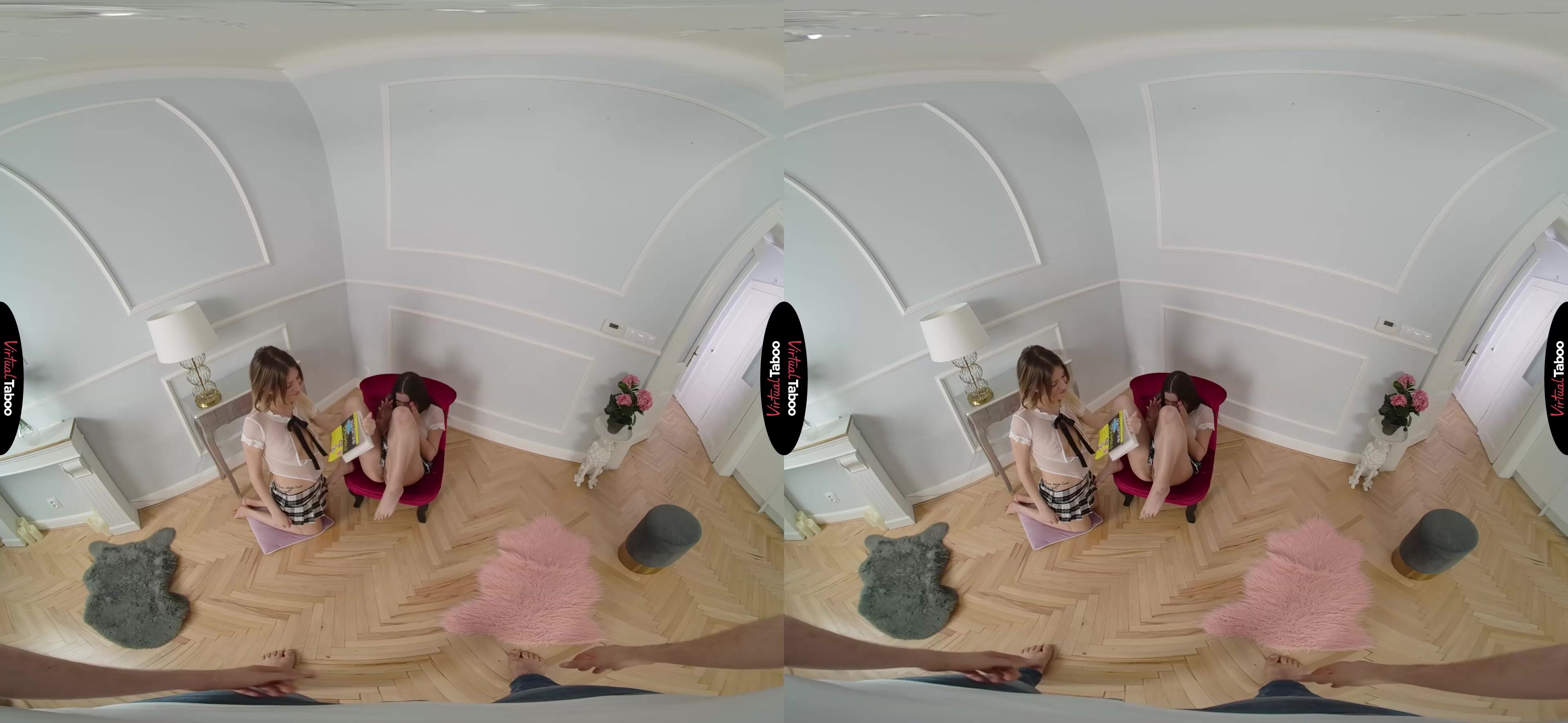 Rebecca Volpetti has her friend Sereyna Gomez over for the weekend. The girls decide to snoop through Rebecca’s stepbrother’s room to see what they can find. They discover a book on squirting and decide to read it. Neither of them has ever squirted, but they have seen it in VR Porn and heard other friends talk about it. The girls try out the techniques in the book and Sereyna is amazed by how good her friend’s fingers feel in her tight pussy. She is so close to cumming when Rebecca’s stepbrother walks in on them. He was hoping to get some alone time with his VR Headset and some hot porn, but instead finds his sexy stepsister fingering her hot friend. It turns you on so you decide to take a chance. Pulling out your cock, you let them know you are watching. Sereyna is embarrassed and then shocked when Rebecca suggests that they not let such a big hard cock go to waste. They take turns sucking on your fat pole. Rebeсca is an experienced cocksucker who guides her friend’s head as she learns to take it deeper. While she gets to feel the cock first, the pretty blonde uses her tongue to finish what she started with her fingers. Since it is your book, you know the tricks and makes Sereyna squirt all over the floor before you shove your cock in and fuck the shit out of her. Rebecca waits patiently until her stepbrother is ready to give her the same treatment. The girls love learning to squirt and work together to make sure you also get to spray your juices all over their faces. They share the cream and spit it back and forth. Learning lessons with your best friend is fun.