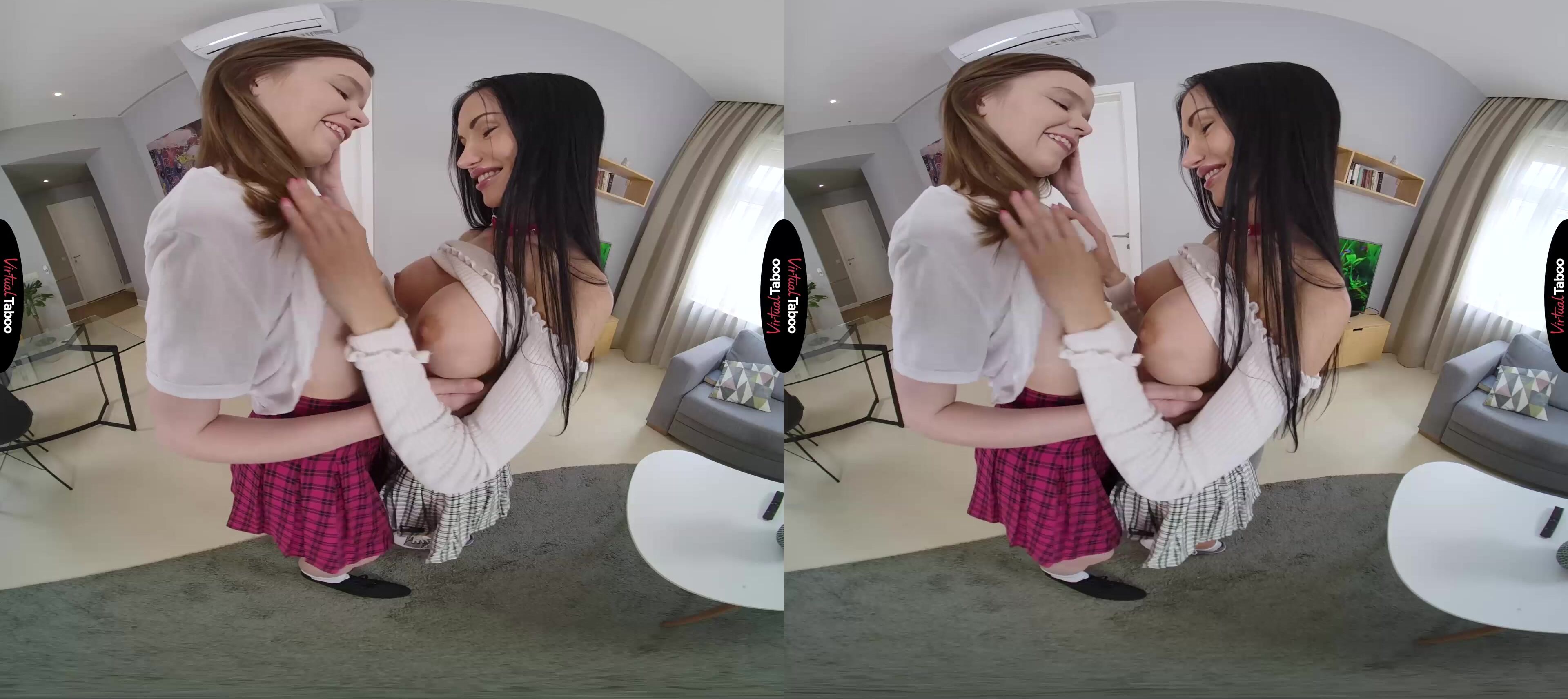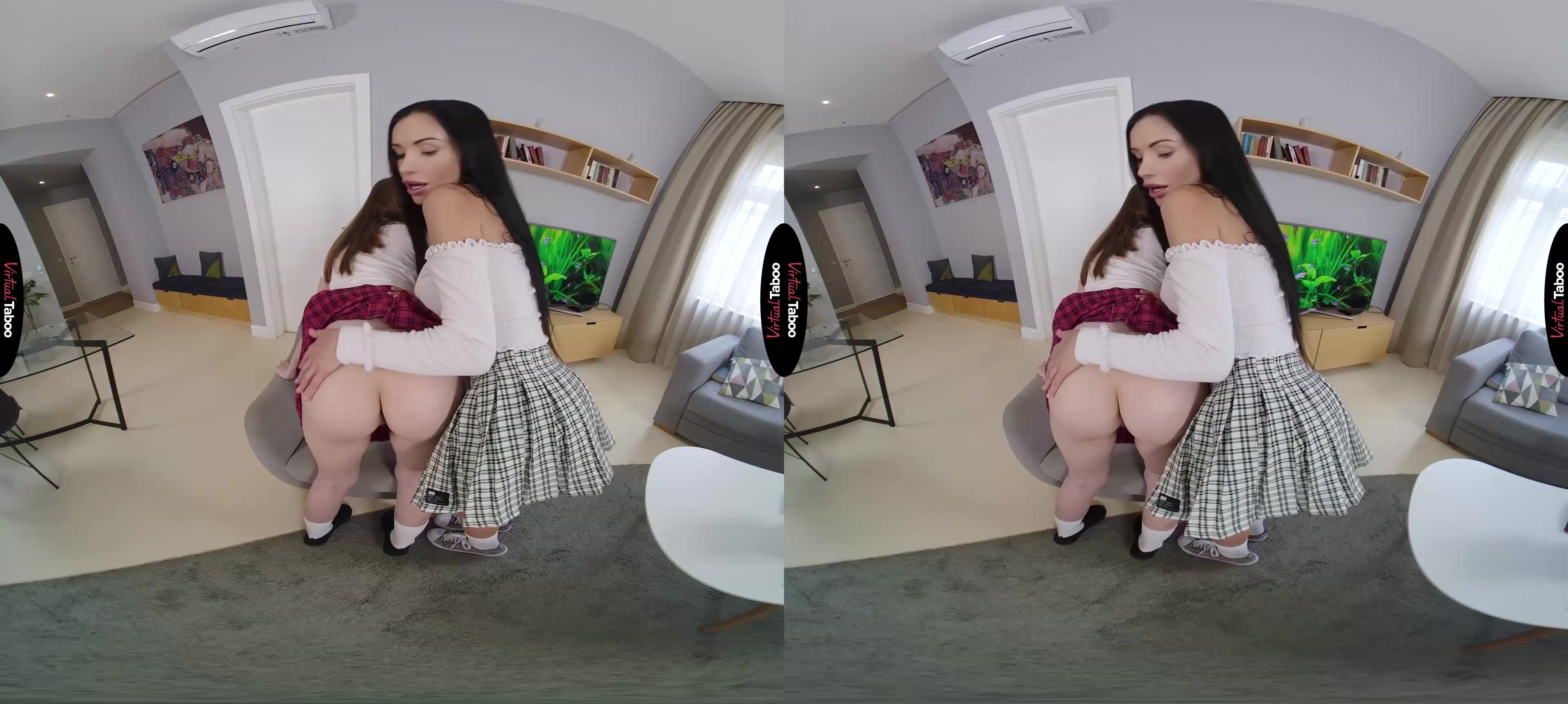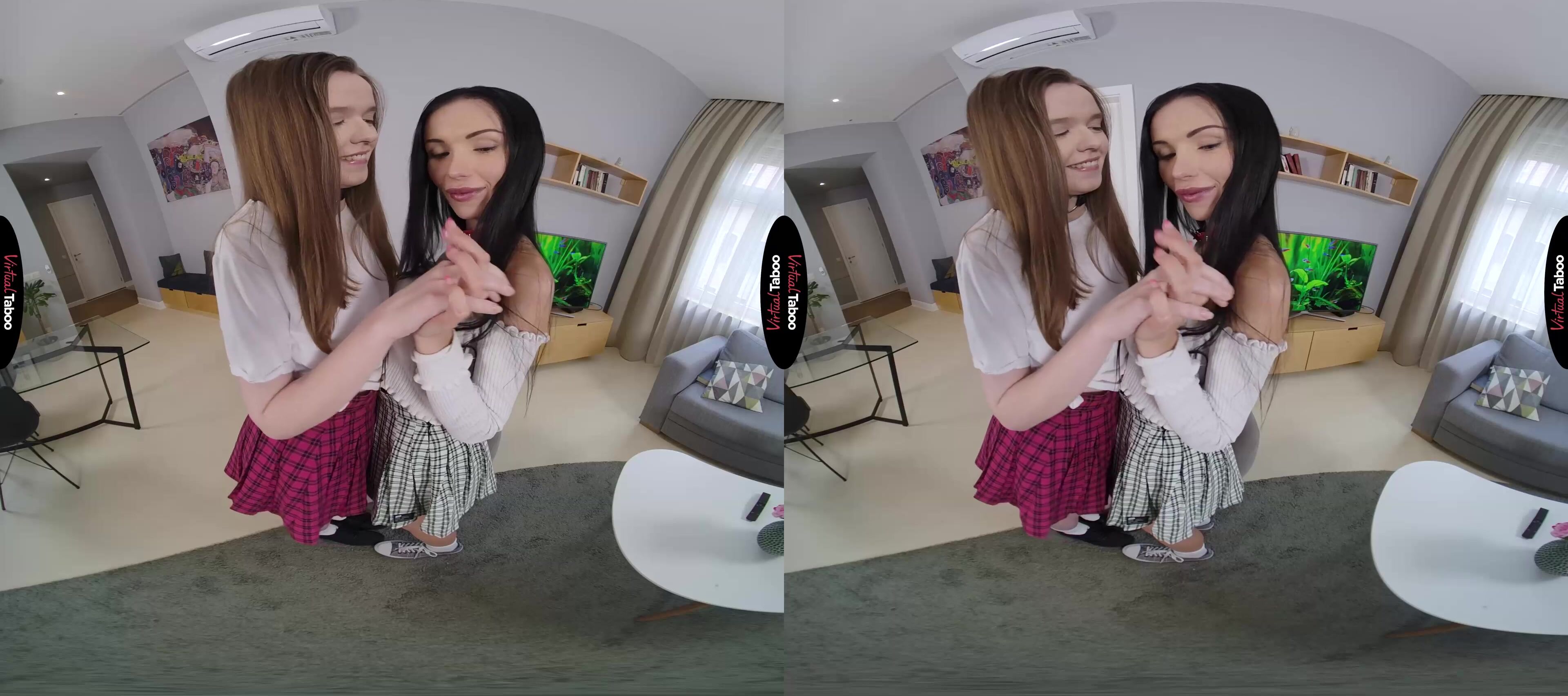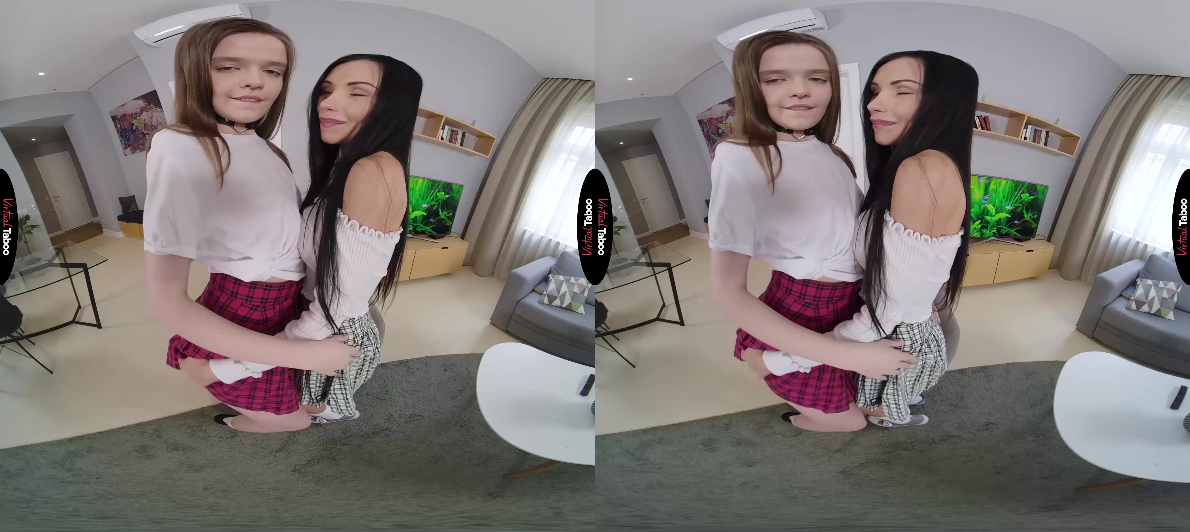 When you married your wife, you didn’t realize that her coed daughter would be moving in with you with no set plan to move out on her own. For the most part, Sasha Rose created no problems. She is a good student, well behaved and helpful. If anything, you found your new wife to be a little too strict with her lovely daughter. Sasha is very comfortable with you and seem to have figured out that you are far more lenient than her mother when it comes to things like staying out late with her friends. One weekend, your wife leaves you alone with Sasha. Sensing that you might be a soft touch she hit you up for permission for her new friend Wera Angel to stay overnight. In this VR porn video, they come to you, looking innocent and adorable and call you “daddy” for the first time. You try to ignore it, but they are flirting with you hard and in no time at all your pants are getting tighter. Now that they have your attention, these sexy bad girls know just how to convince you to see things their way. They bend over, lifting their skirts and promising that if you let them stay, you can have anything you want. They see your cock is hard and spread their legs to show you where they want it. Let them have their way and they will let you have your way with their tight, young holes. Don’t you want to play with them “daddy”?