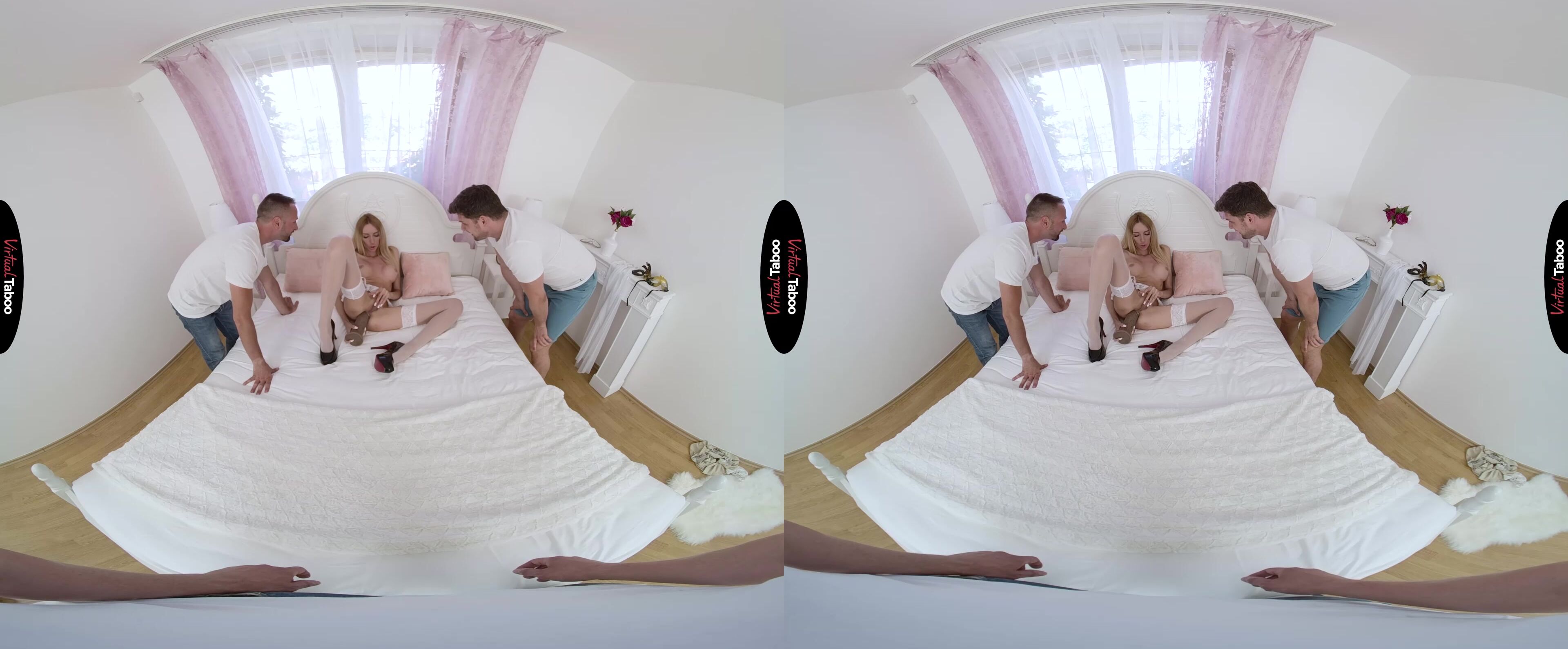 Anita Blanche is a woman with intense sexual desires and needs. She also has very expensive taste, when she had the opportunity to marry a rich man, she jumped at the chance. While he provides for her outside of the bedroom, he is too busy and ill-equipped to satisfy her sexually. Anita has had plenty of opportunities to cheat but wants to stay faithful. To satisfy her urges, she has a favourite sex toy that she breaks out as often as she can. It is huge and heavy in her hands, at least three times the size of her husband’s cock and makes her so horny. After sucking it, she slides it into her asshole and is so busy pleasing herself that she doesn’t notice when her stepson and his friends walk in. In this VR porn video, she explains to you that your father’s cock is too small to satisfy her and begs you not to tell him about her special toy. You agree but have an idea to assure your secrecy and take care of her problem. She can take on all three of them at once. Anita can’t believe her eyes and you and your pals take out your cocks. They are all hard and twice the size of her husband’s sad little member. Having seen her stuffing her ass with the toy, you waste no time ramming your meat right between her cheeks while she greedily sucks off your friend. His sizable salami makes her hole gape and knows that she has two more to try. One at a time, her young lovers shoot loads into her freshly fucked asshole. Now that she knows how well hung her stepson is, Anita knows she won’t need to spend so much time with her toy.