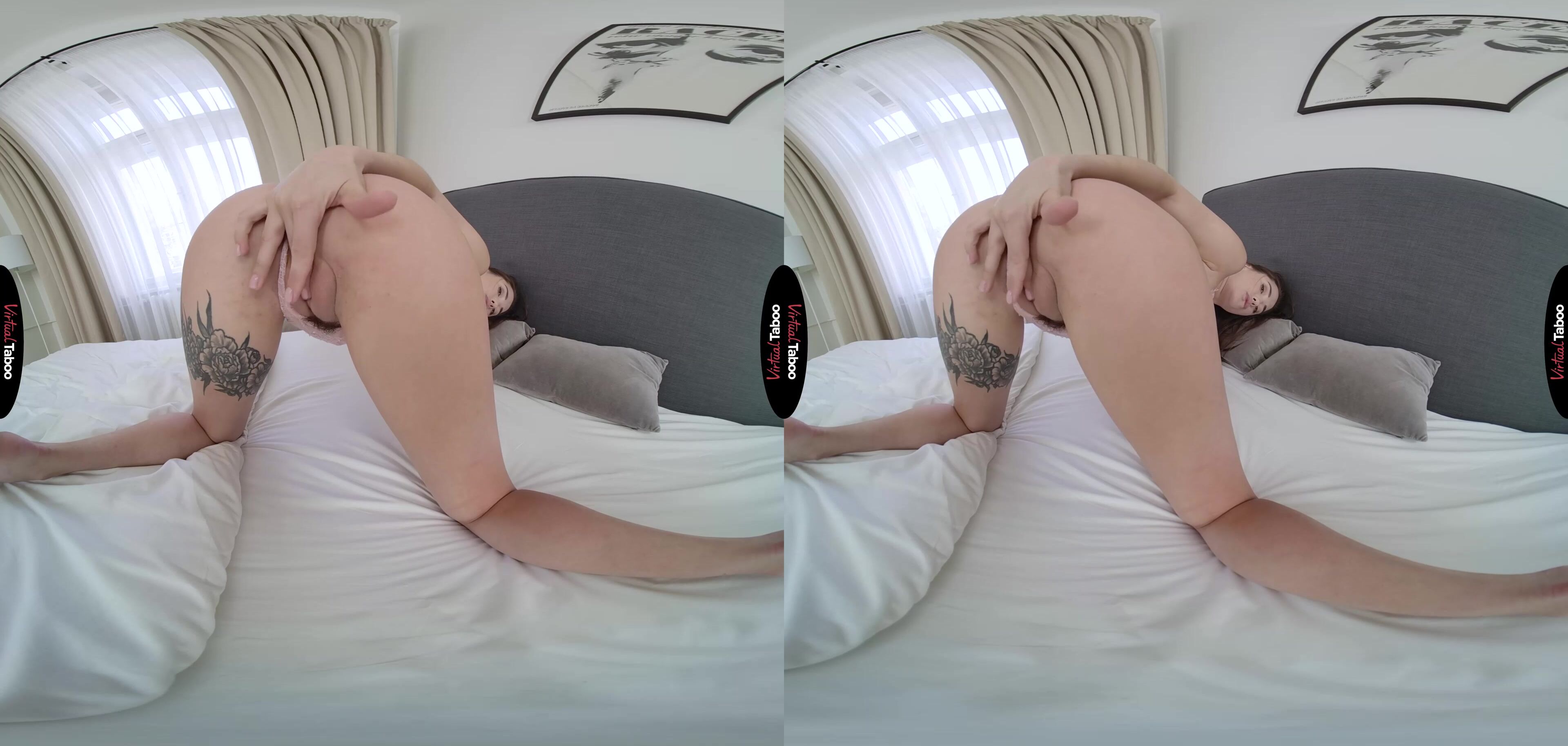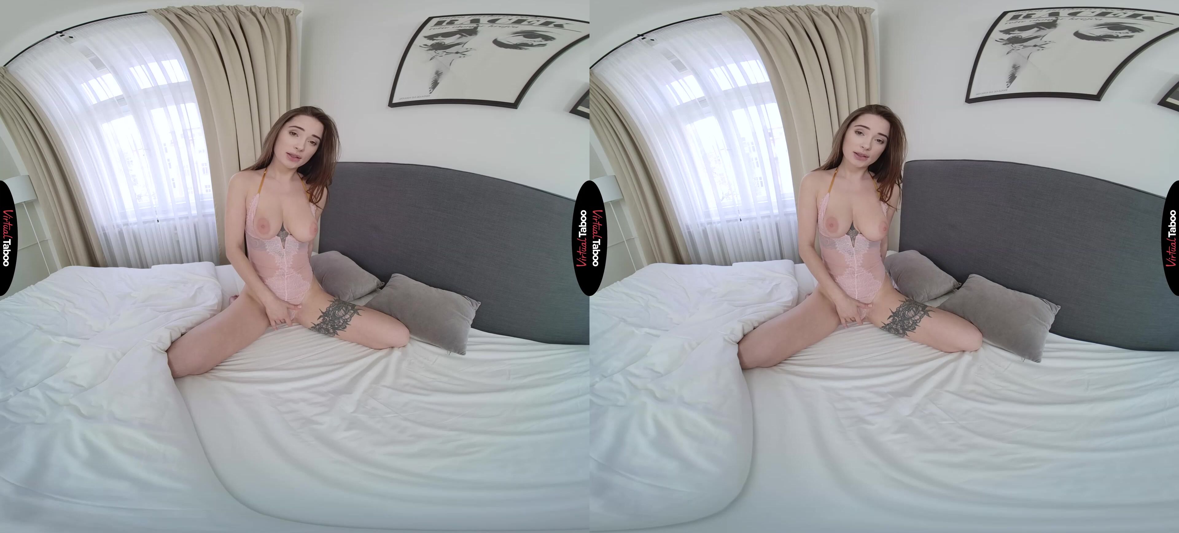 Liya Silver VR has been dating her boyfriend for six months. Things were great for a while, but lately, they seem stale. Worried that her man might be getting bored, she decides to buy some sexy new lingerie and surprise him with a special night. Liya tries on the new apparel and loves the way it fits her lean young body. She looks at herself in the mirror and thinks she looks pretty good. But pretty good isn’t good enough. Liya wants to be as hot as the models in the VR Porn she knows her man is watching. Needing a man’s opinion, she calls her stepfather in and asks him to tell her honestly if she looks sexy. You don’t feel right seeing her dressed this way, but can’t hide the bulge in your pants. Seeing how you react, Liya knows that she looks sexy. If she can turn you on, then she knows her boyfriend is going to want to fuck her. She can see that you are uncomfortable, but can’t stop staring which only makes her want to tease you even more. Climbing into bed she can see you staring at her ass as she rolls around and arches her back. Getting bolder, she pulls her top down to reveal her breasts. You continue to stare so she encourages you to take out your cock and stroke it for her. Seeing you so turned on makes Liya wet so she starts rubbing her clit to match you stroke. She watches as your cock throbs and you start to tremble before your load explodes all over the bed. Seeing her stepdad lose control makes Liya climax as well. Perhaps she has bought lingerie to turn on the wrong man.