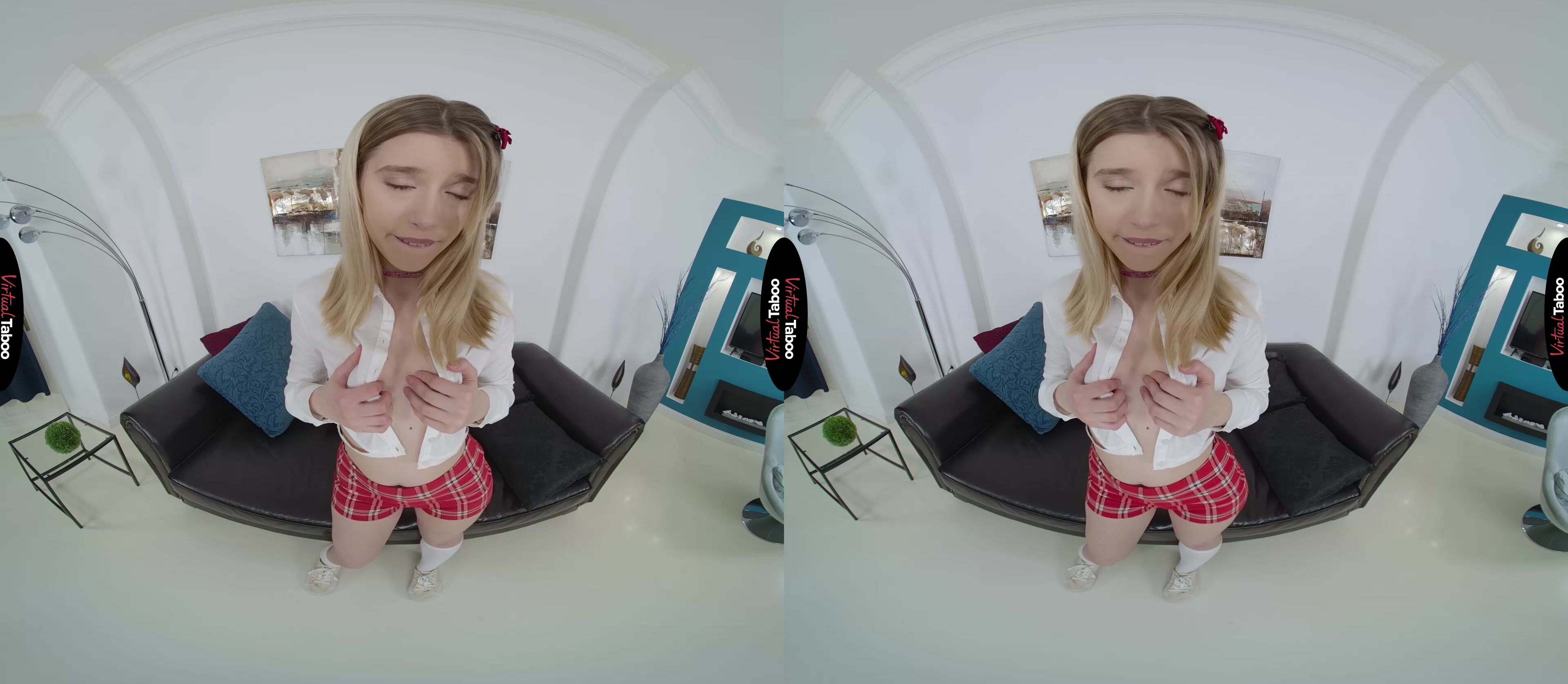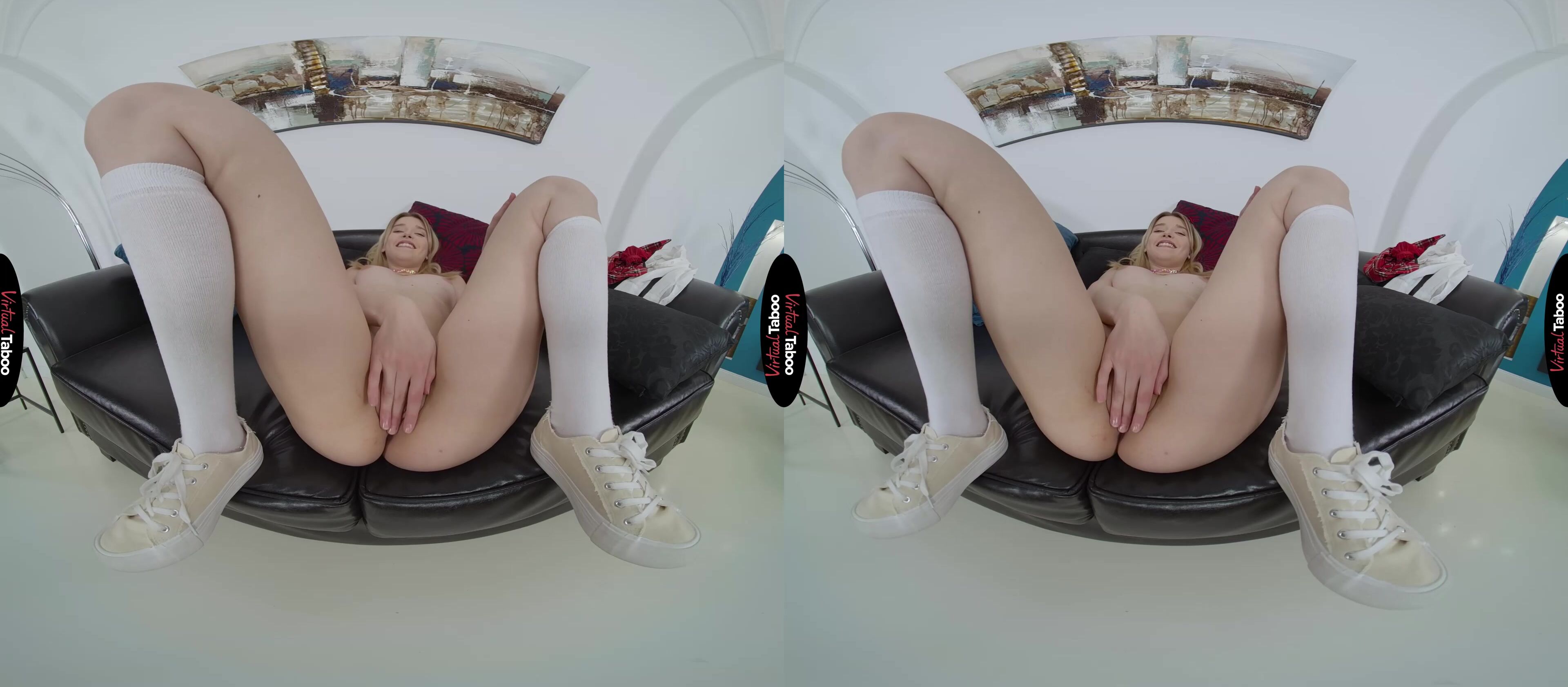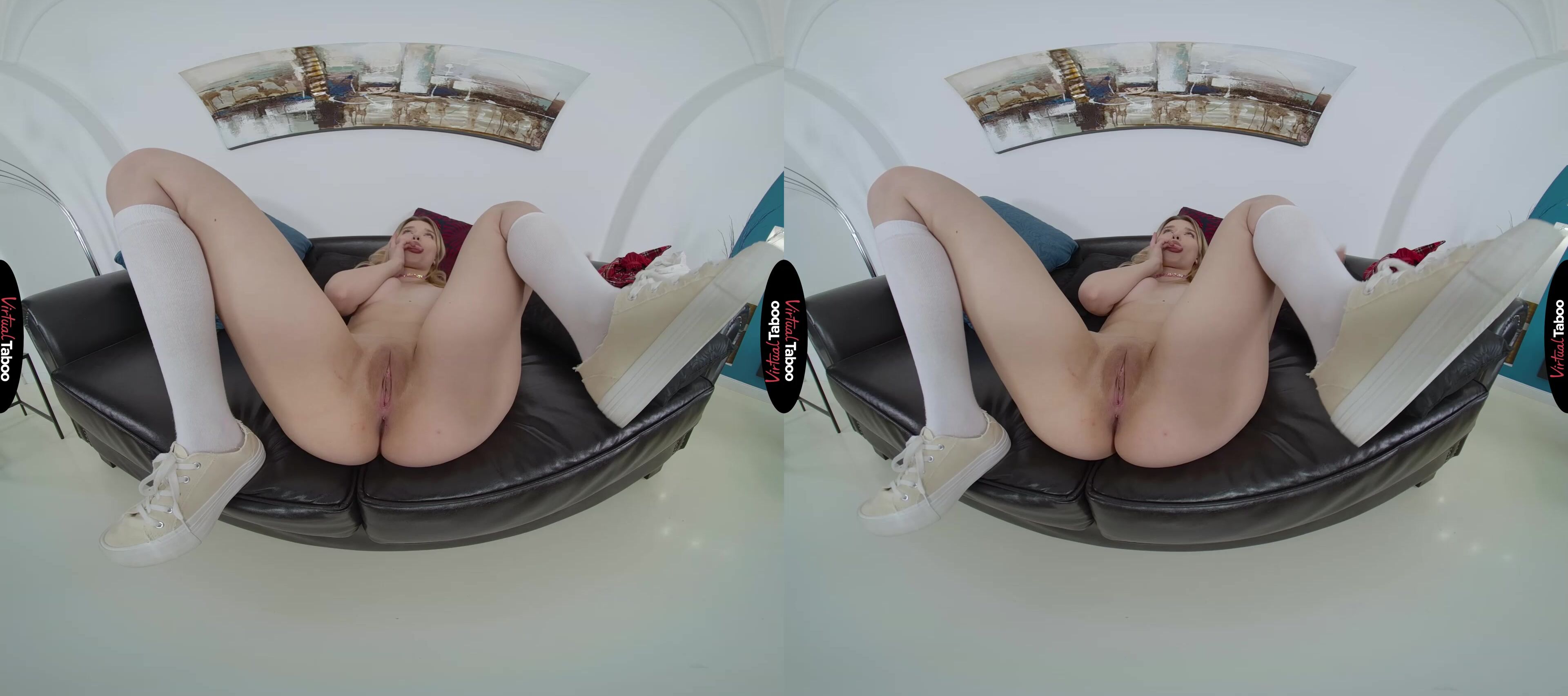 Freya Mayer is upset. She was supposed to go shopping with her mother but had to stay home due to poor grades. In this VR porn video, her mother went without her, leaving Freya home alone with her stepfather. He does his best to take good care of her and keep her from being too upset about missing some shopping. But all of this studying and staying home is driving her crazy. She is bored and horny. Freya knows that her stepfather is also having a rough time with mom gone. She has heard you in your room late at night with your VR Headset on. Horny and still angry that mom left without her, Freya decides to see how far she can push you with some ruthless teasing. She puts on a pair of tight shorts and makes sure to bend over in front of you so you get a look at her sexy tight ass. When you get caught watching, you try to leave the room. She stops you and wants to show you more. You know it is a bad idea, but can’t resist watching as she strips for you. Her wet panties slide off and her fingers brush against the lips of her tight pussy. She knows it must be hard with mommy away, but she doesn’t mind if you want to watch her masturbate. Maybe you even want to take your cock out and stroke it with her. Freya watches you pump your meat and starts cumming all over her fingers. Let mommy enjoy shopping, she is going to spend some quality time making stepdaddy happy.