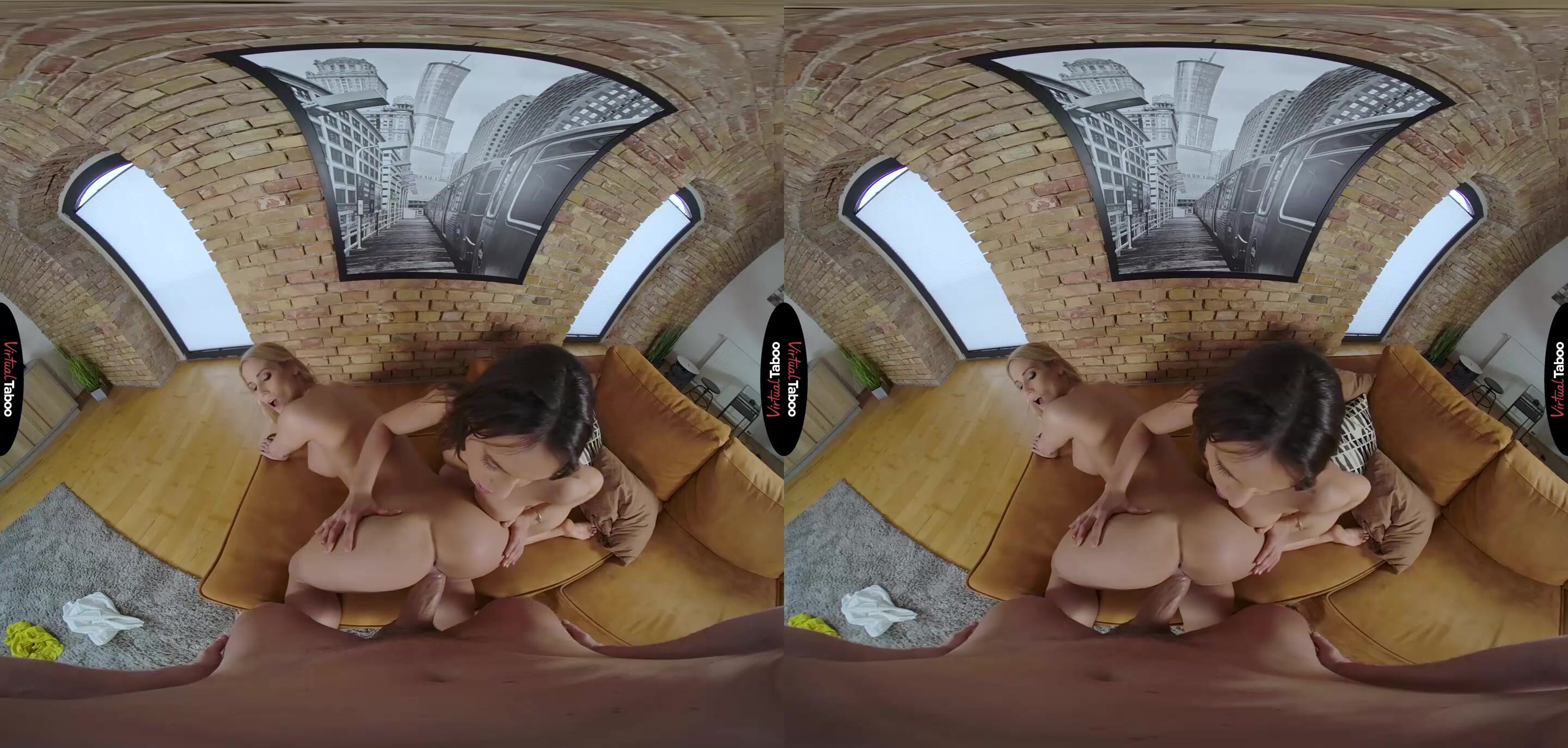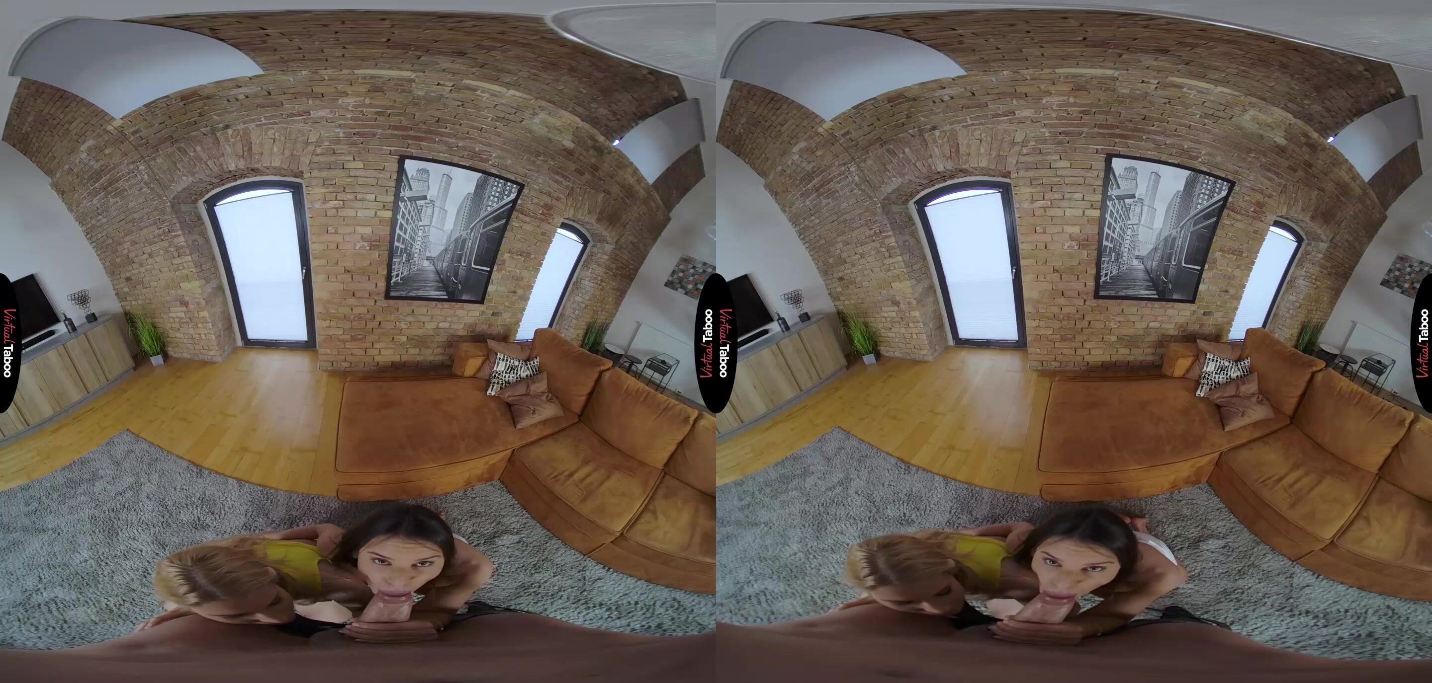 Sharon White is used to getting what she wants. Her husband is happy to spoil her in any way she likes. What she wants is a new maid to keep things clean around the house and a new plaything for her to enjoy with her husband. When they interview Lana Roy, Sharon feels that she will be perfect for both jobs and has her husband explain all of the duties to the sexy young maid. She is shocked by the forward nature of the conversation and her required duties but agrees to do anything that they ask of her. The horny couple sees no reason to wait before trying out their adorable new sex toy. Strap on your VR Headset and enjoy the stunning High Definition Virtual Reality action as Sharon takes down Lana’s top and admires her firm breasts. The statuesque blonde towers over her new pet who is at the perfect height to lick her nipples. Sharon loves how obedient she is and invites you to join them. They share your cock with Sharon feeding her young friend and watching as she does her best to swallow your meat. Lana’s mouth also proves useful in eating Sharon’s pussy while you sample some tight new twat. Getting fucked by both of them at once has Lana more turned on than ever and she already loves her new job. Not wanting to leave your wife out, you fuck her pussy for a few strokes before returning to Lana’s hot hole. Sharon has a few tricks and shows her new maid how to please her man with her flexibility and her tongue. When you cum, your load fills Sharon’s mouth. She spits it into Lana’s and the two share a big sticky cum-swapping kiss.