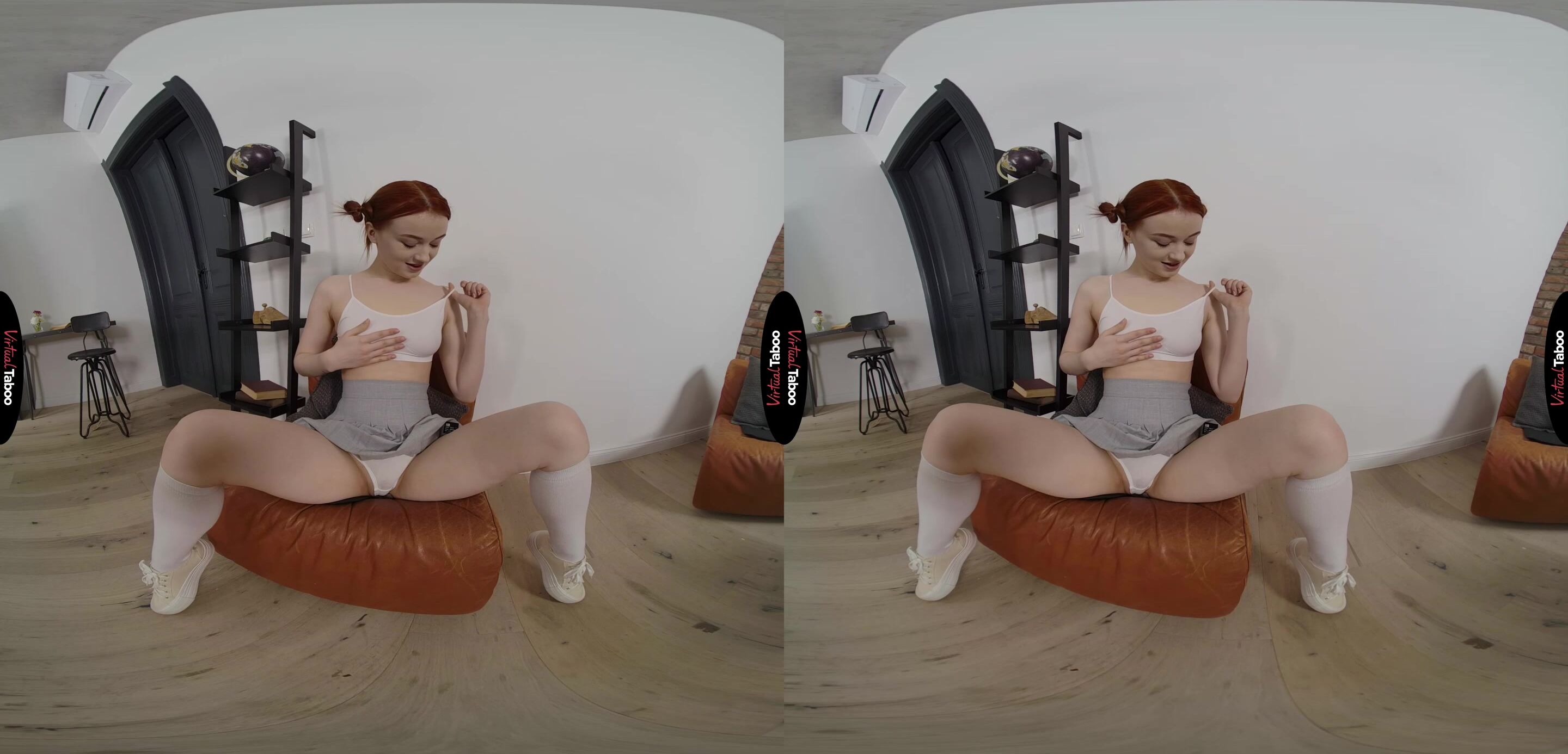 Sheryl X is looking forward to a relaxing day. With her parents gone, the house is finally quiet enough for her to catch up on some reading. She curls up with her favourite book and is enjoying herself when her stepbrother comes into the room. He is busy on his phone, but stays quiet and does not bother her. As she reads Sheryl gets the feeling that you are watching her. In this VR porn video, she sneaks a peek and finds you staring up her skirt at her panties. Instead of being angry, she finds herself getting turned on by your leering. She shifts on the chair causing her skirt to ride up higher and allowing you to see even more of her exposed flesh. She lifts her skirt up over her ass and spreads her cheeks knowing it is driving you crazy. Having this much power over you makes Sheryl’s pussy wet. Showing you more, she pulls down her top and encourages you to take out your cock so she can watch you stroke it for her. The faster you stroke, the harder you get. The harder you get, the more she wants to strip off her panties and fuck her horny hole. Spreading wide she lets you have a good look while she slides her fingers over her clit and inside of her juicy pussy. As she makes herself cum, Sheryl promises herself that the next time her parents leave, she is going to do more than just teasing her studly stepbrother.