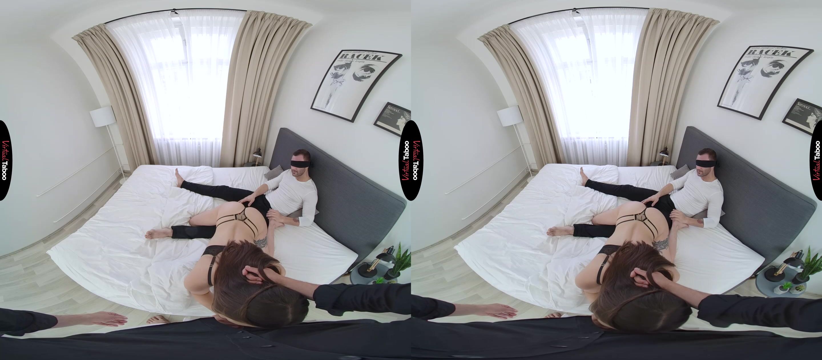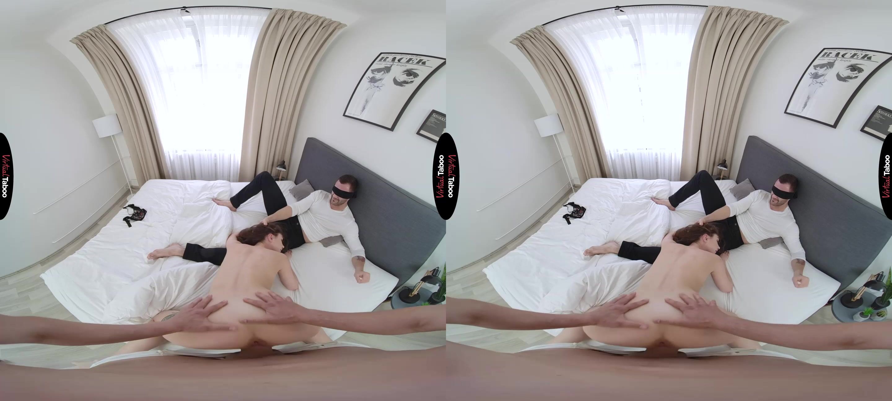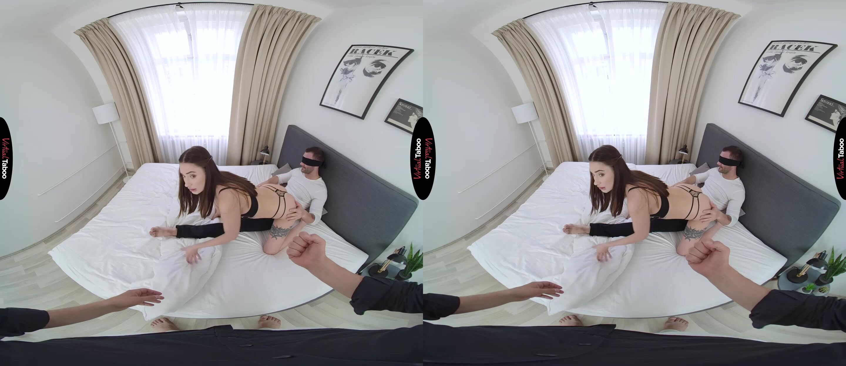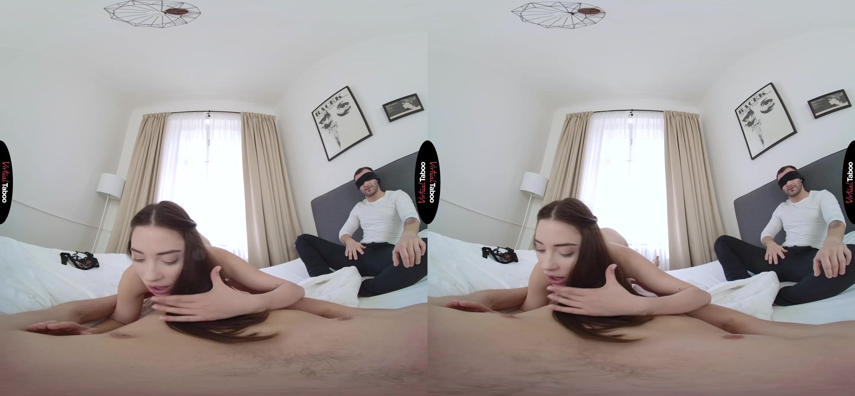 Liya Silver is enjoying some time with her boyfriend. They are in bed together and she wants to play an erotic game with him. He is to be blindfolded and then guess what she is doing by the sound and by using his sense of touch. She is teasing him when she looks up and finds her stepfather in the room watching them. He had come home from the office hoping to sneak in some time under his VR Headset before his wife got home. Liya is scared at first, but when her stepfather remains silent and watching she finds herself getting turned on. In this VR porn video, she takes off her bra and moans as you squeeze her exposed breasts. You take your cock out and she sees how big and hard he is. Liya has heard her mother moan when you fuck her and knows you are a skilled lover. She wants to try for herself and doesn’t care that her boyfriend is just inches away. Her lips slip around your hard cock and she moans until her boyfriend asks what she is doing. Liya tells him that she is sucking her finger and asks him if he likes the sound of her sucking, He admits that it turns him on to hear her and imagine that she is sucking another man’s cock. It turns you on so much that you turn her around so she can touch her boyfriend while you power fuck her tight young pussy from behind. With her body rubbing on his crotch, her blindfolded boyfriend is enjoying the tease without realizing she is being fucked. She keeps it up until you cum all over her face. He wants to take off his blindfold, but Liya makes him wait so you can sneak out while she gives him a special kiss.