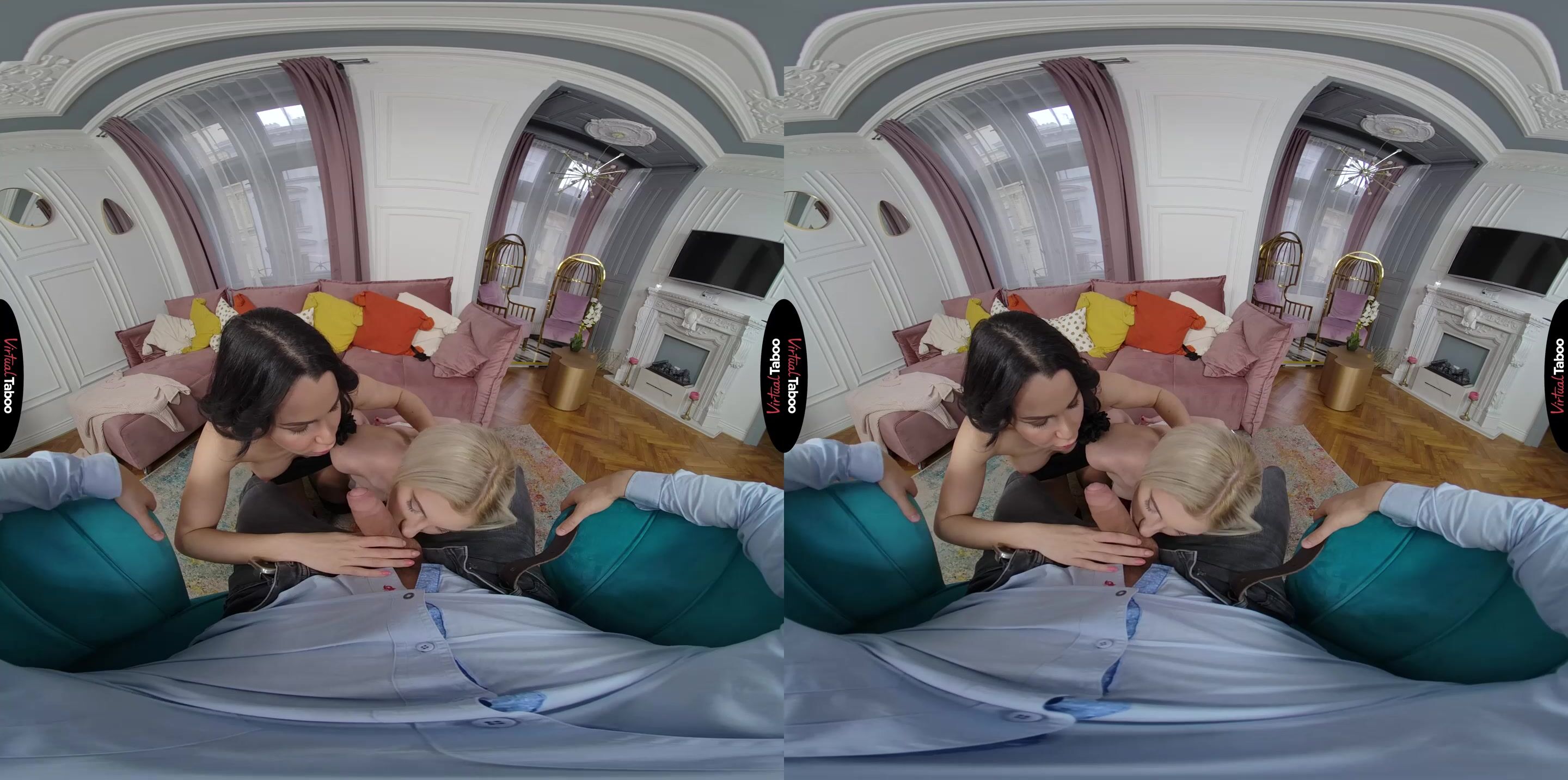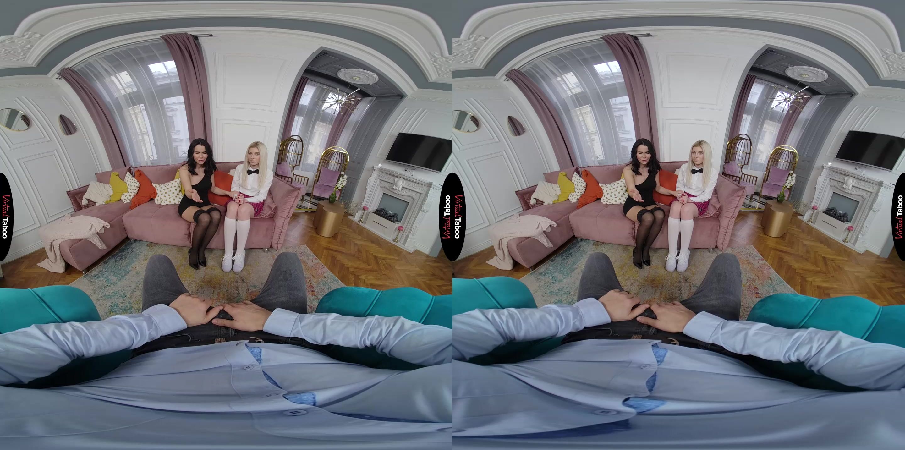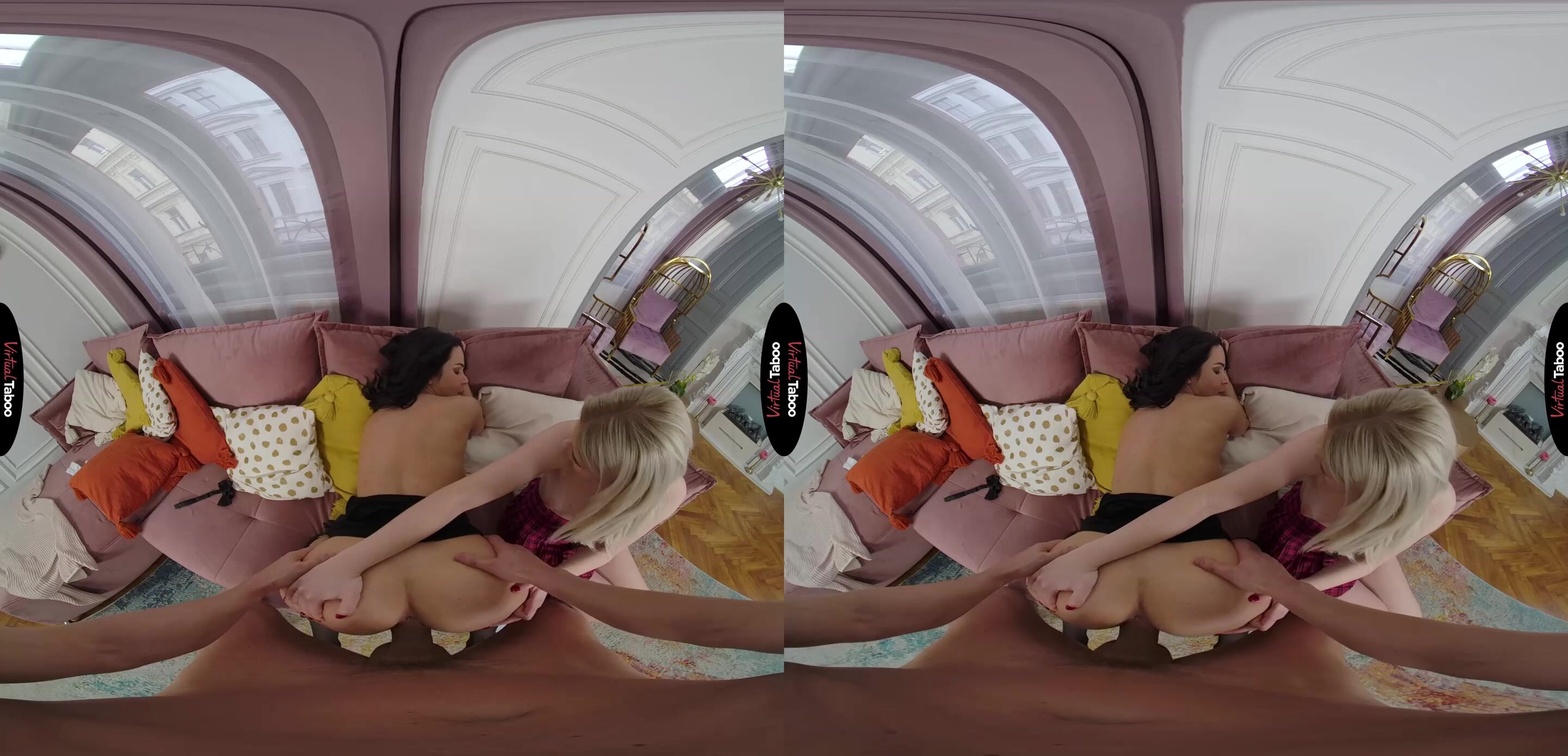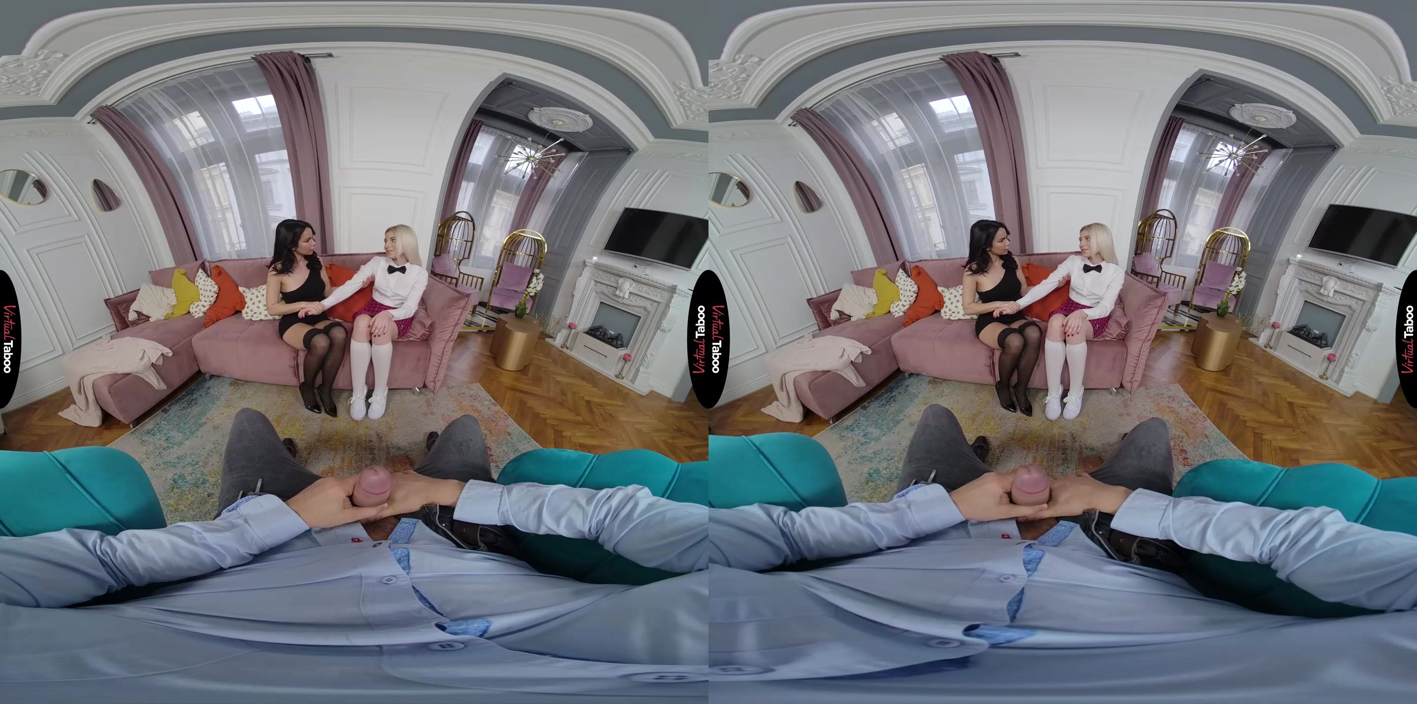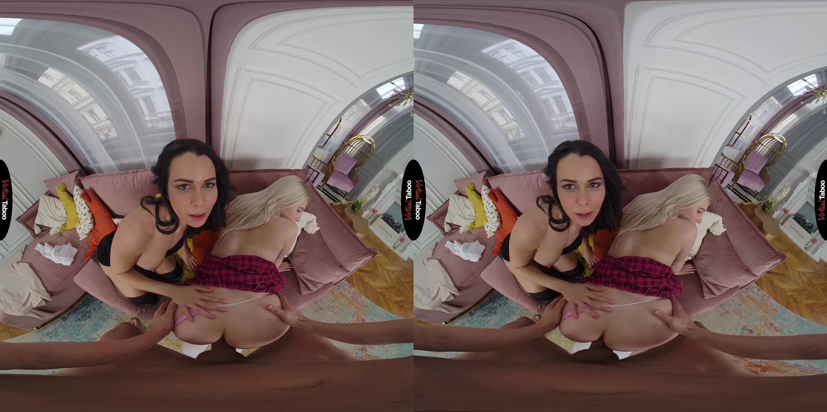 After a disturbing yet erotic experience, while out selling cookies, Lilly Bella runs to her teacher’s home to tell him. Her teacher’s wife, Jessy lets her in and listens while Lilly gives the couple every dark and thrilling detail. The tale turns you on and your wife can see your cock throbbing in your pants. Jessy Jey VR can see the sexy student staring at her man’s bulge and can see from the glint in her eyes that the two have been having an affair. She is angry, but not because you cheated on her, but because you didn’t share the sexy teen with her. Strap on your VR Headset and enjoy the action as Jessy brings Lilly over to you and orders the pretty blonde to suck your cock right in front of her. Worried at first, she gains confidence when your wife joins her and they blow you together. Enjoying the dominant role and watching you, Jessy has you fuck Lilly hard from behind. Happily teaching Lilly new tricks, Jessy makes sure to get some hard cock for herself. You are enjoying having two women so much that your dick is harder, your thrusts more powerful and you give them everything you have. Taking full advantage of the situation Jessy lets Lilly ride your big cock while she enjoys the teen’s tongue between her legs. They return to sucking and share a huge load of cum between them. Lilly will be invited over often to please you and your lusty wife.